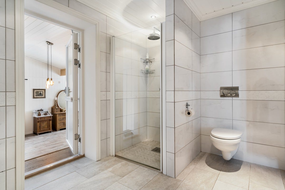 Gulvene består av mørke fliser i hall, på kjøkken og lite WC, nye sandfargede fliser på bad fra 2018, i