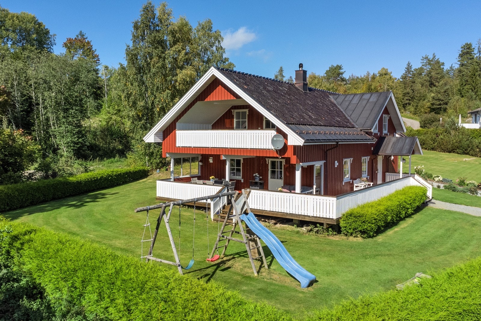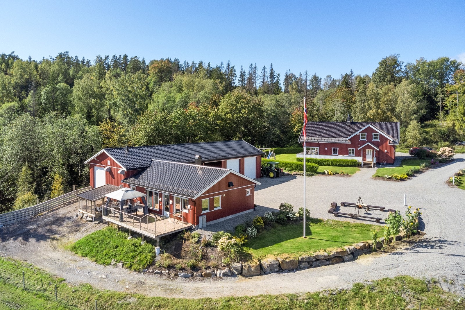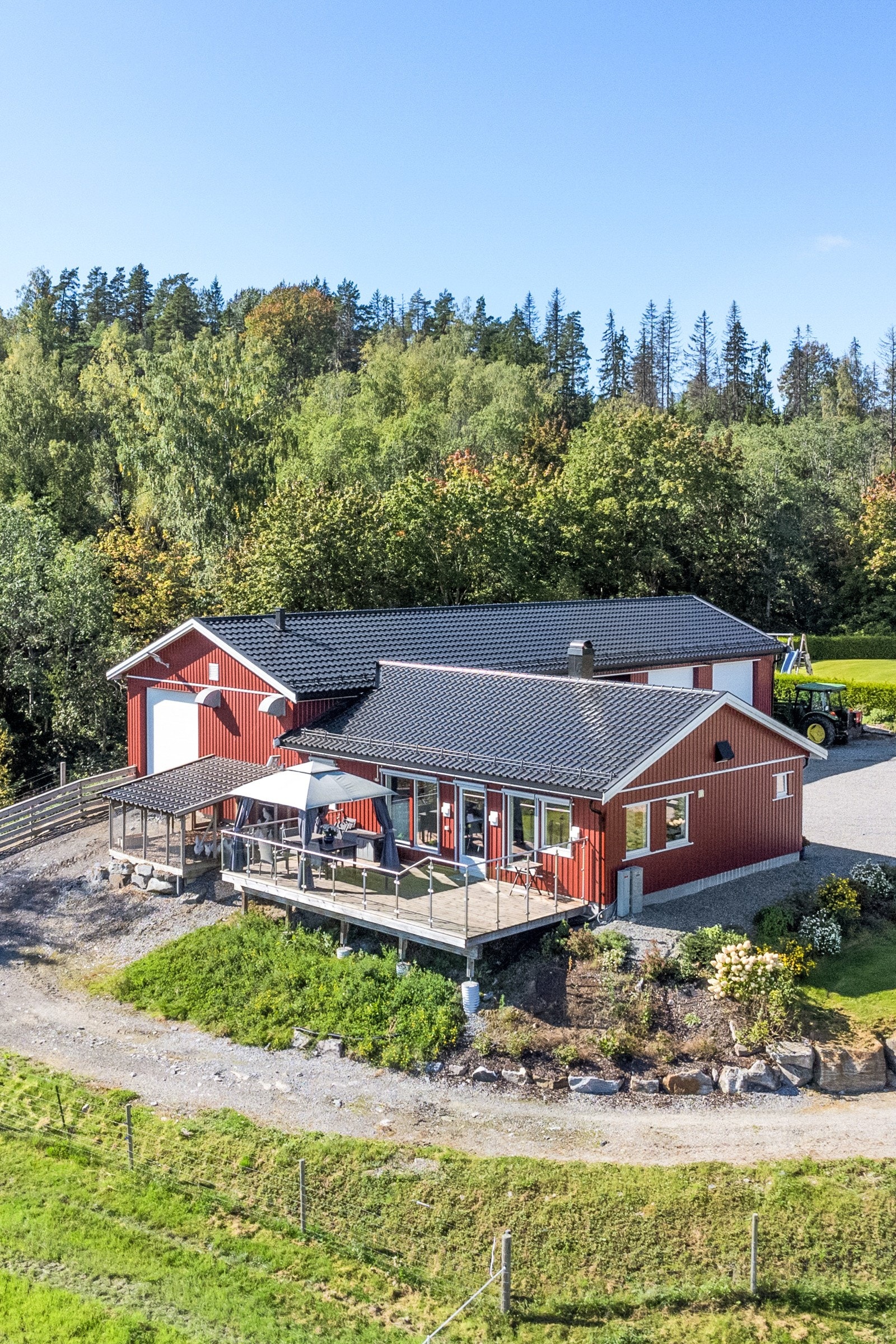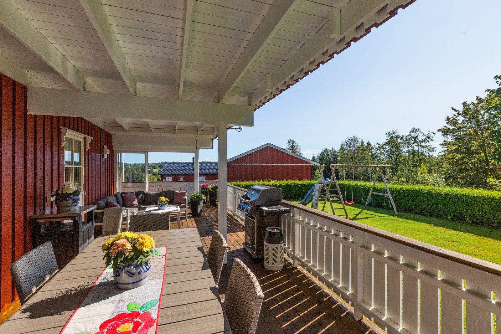 - Stort hovedhus med 4 soverom, 2 bad, stue med peisovn og 68 m2 terrasse