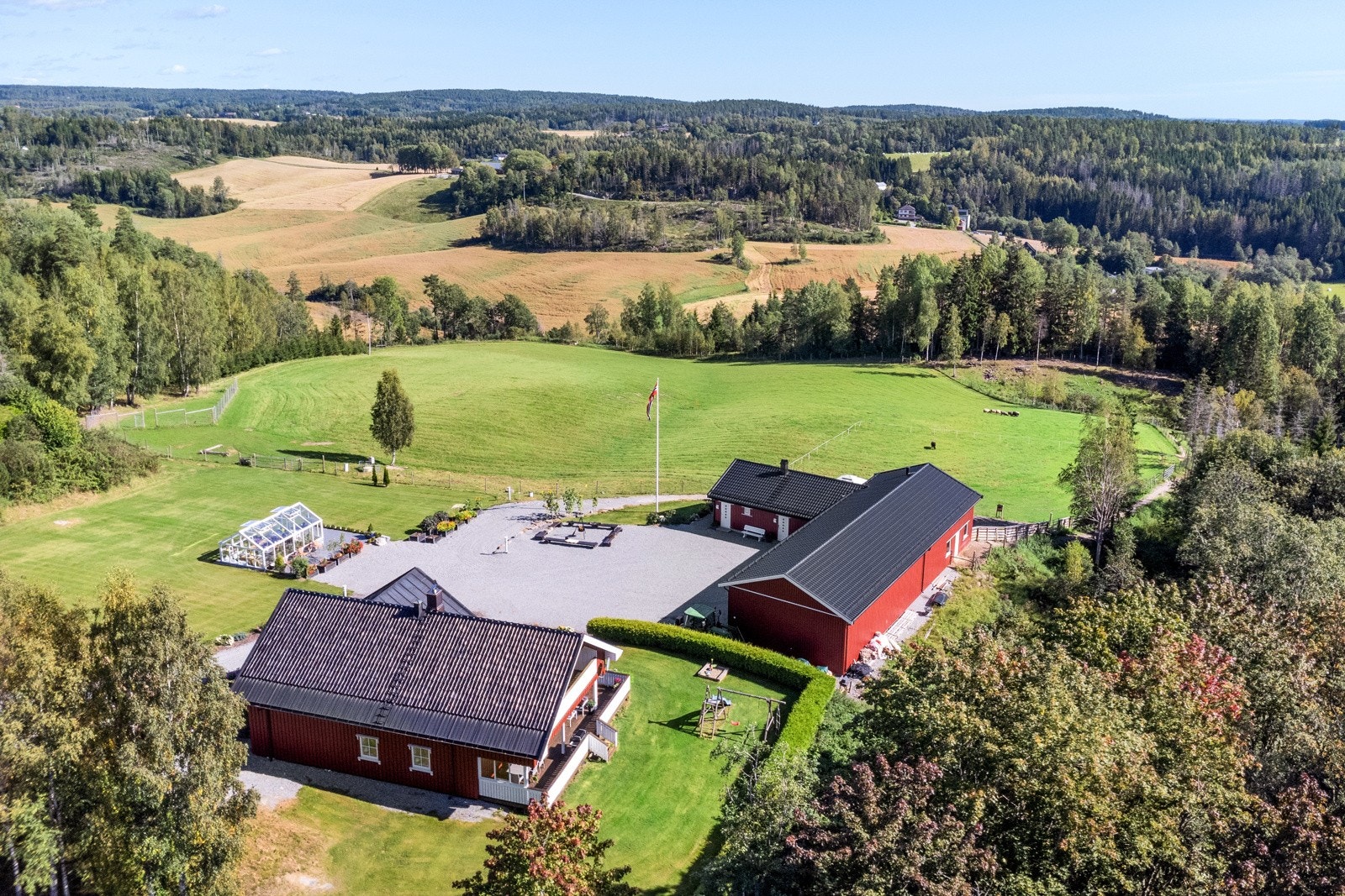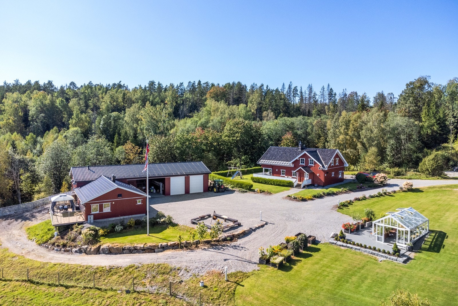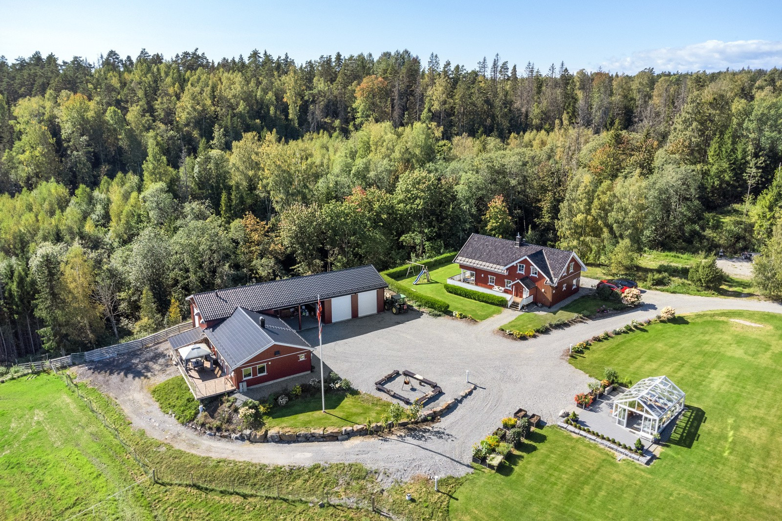 Eiet tomt, 69,3 daa totalt | 17,8 daa fulldyrket | 31,6 skog | våningshus | driftsbygning/låve | drivhus