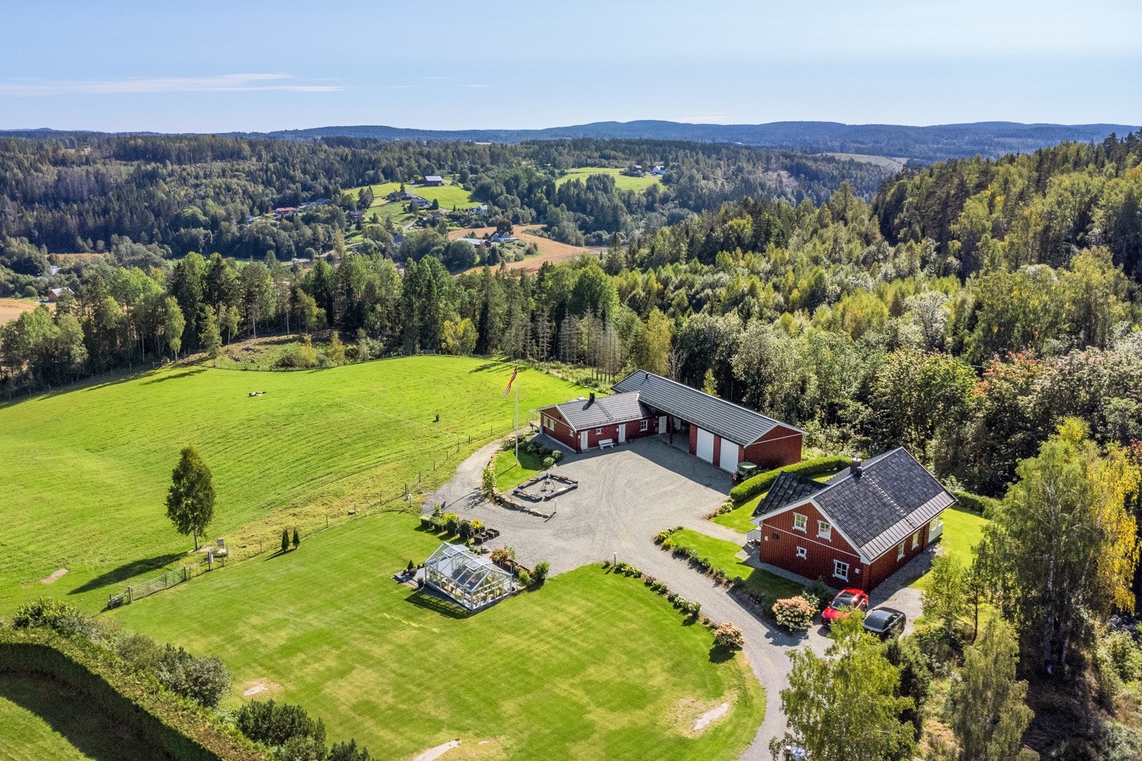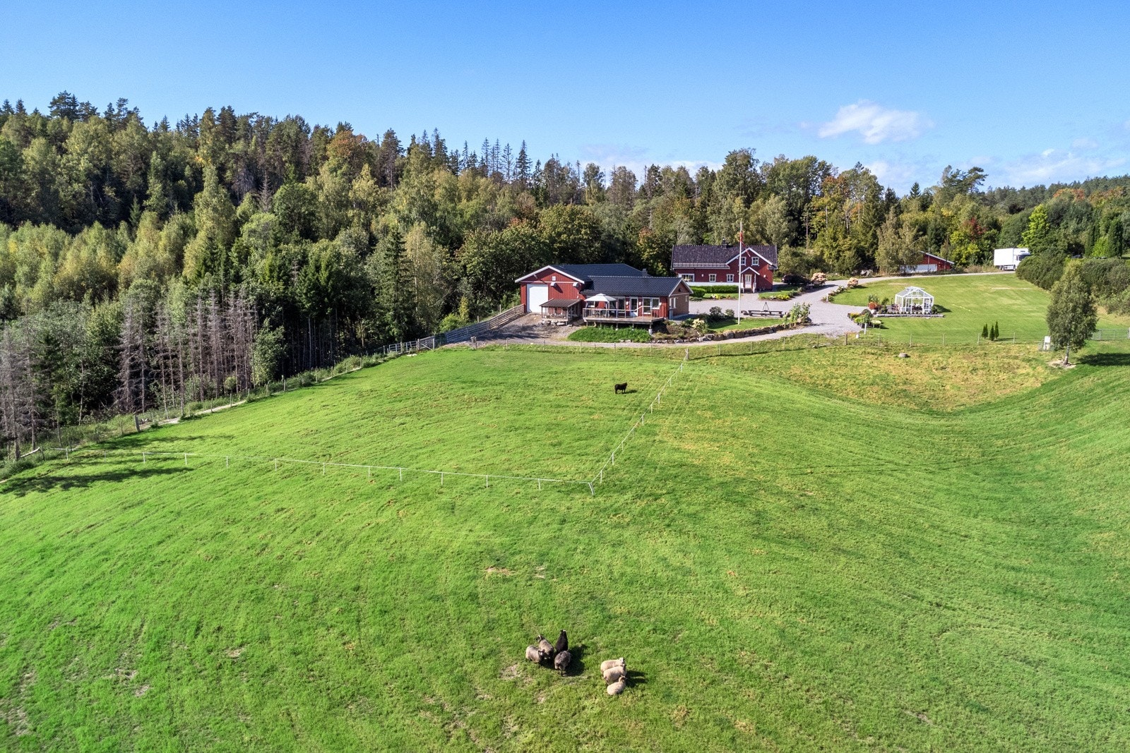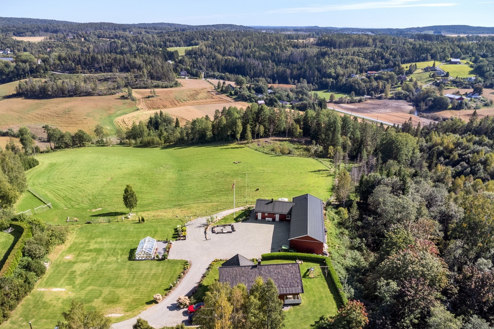 Eiet tomt, 69,3 daa totalt | 17,8 daa fulldyrket | 31,6 skog | våningshus | driftsbygning/låve | drivhus