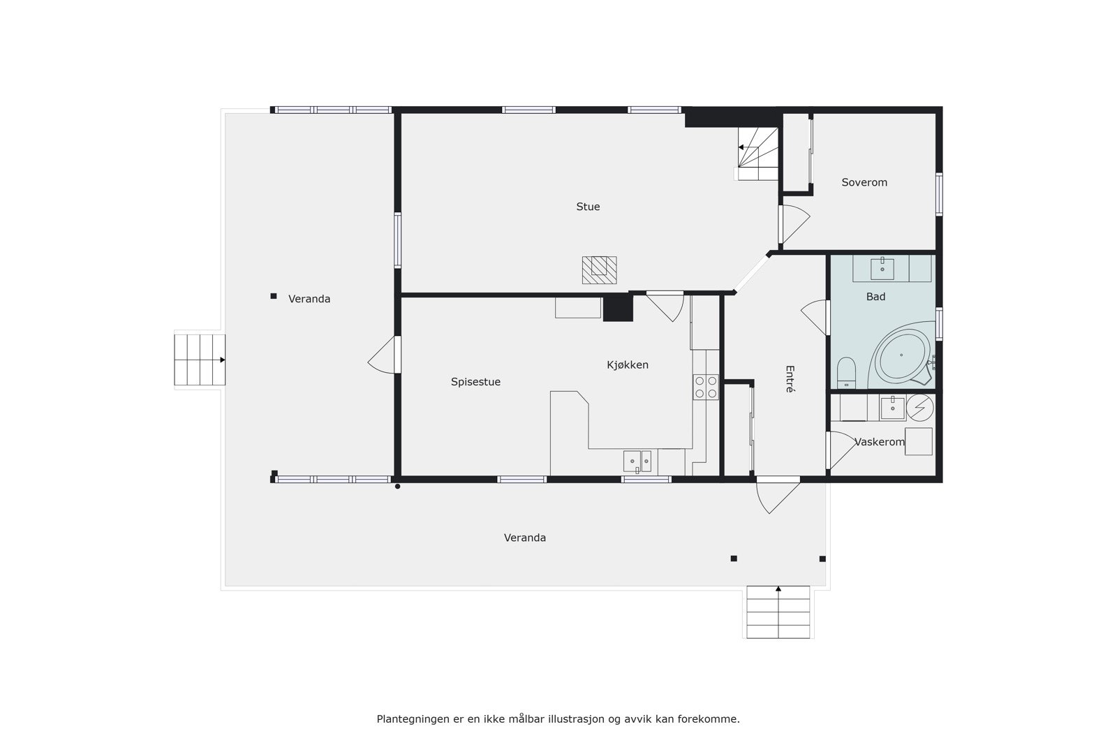 1. etg.: Hall m/trapp, stue, kjøkken, bad, vaskerom, soverom