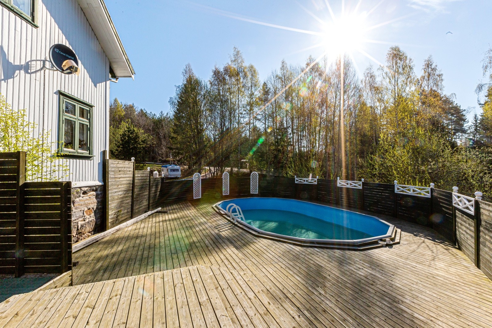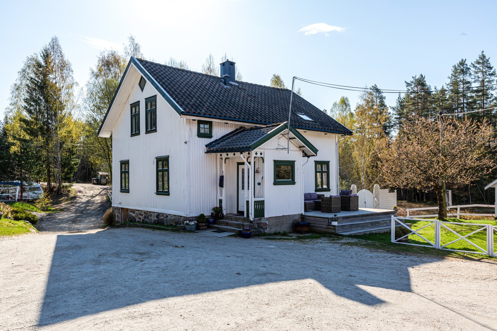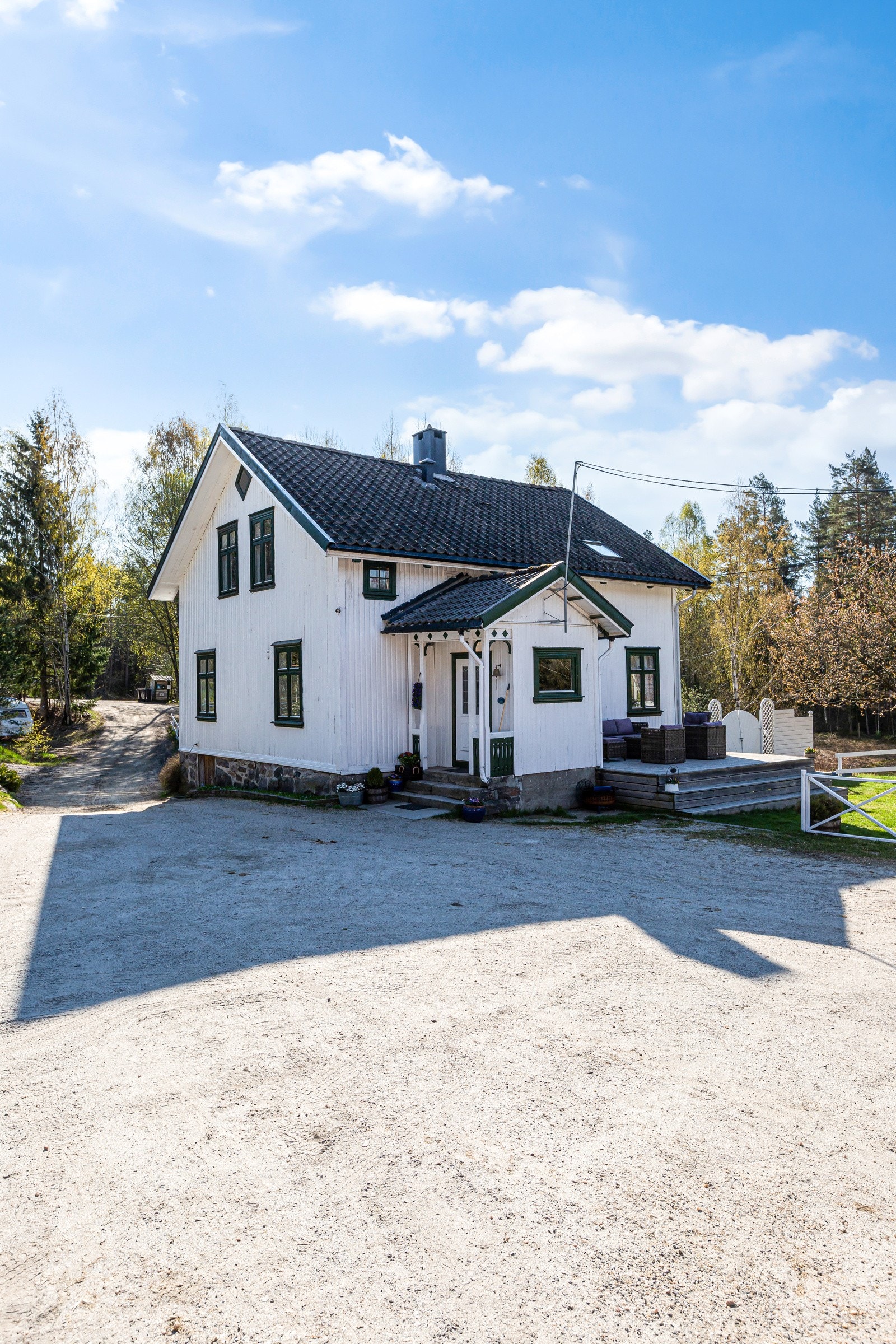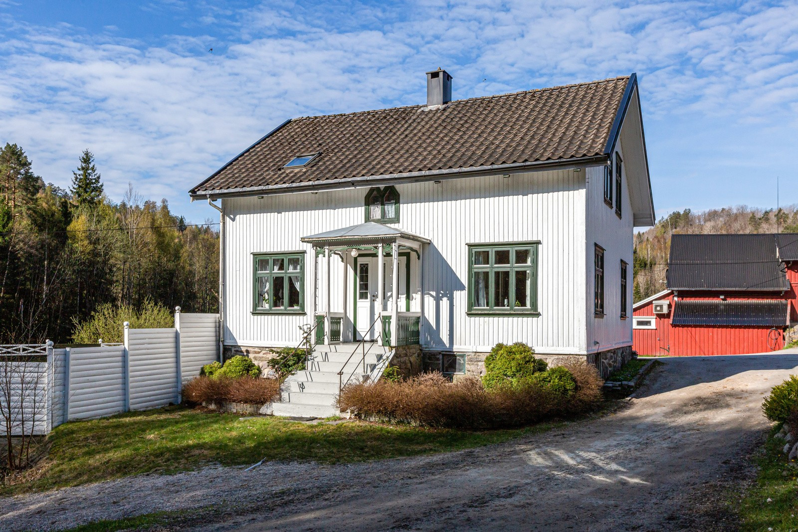 Boligen er oppført i 1905 og fundamentert på grunnmur i naturstein på stedlige masser. Det er ingen kjent drenering rundt bygningen. Yttervegger har sannsynligvis konstruksjon i stående plank, det er ukjent isolering. Veggene er utvendig kledd med stående bordkledning. Det er observert slitasje i kledningen samt manglende lufting i nedre del mot grunnmur. Det er malte trevinduer med to lags glass og trevinduer med doble/enkle glass. Vinduer med enkle glass er fra 1977, 90 og 91. Malte ytterdører i treverk, enkel kjellerdør og verandadør fra 2010. Øvrige dører har ukjent produksjonsår. Boligen har saltakkonstruksjon oppført i sperrekonstruksjon som er utvendig tekket med betongtakstein. Mer en halvparten av forventet brukstid på taktekkingen er passert. Det er observert spor etter skadedyr på loftet, det må etableres bedre lufting og det er observert nedbøying av konstruksjonen som følge av alder. Nedløp, renner og beslag i stål. Det er ikke montert snøfangere på taket.