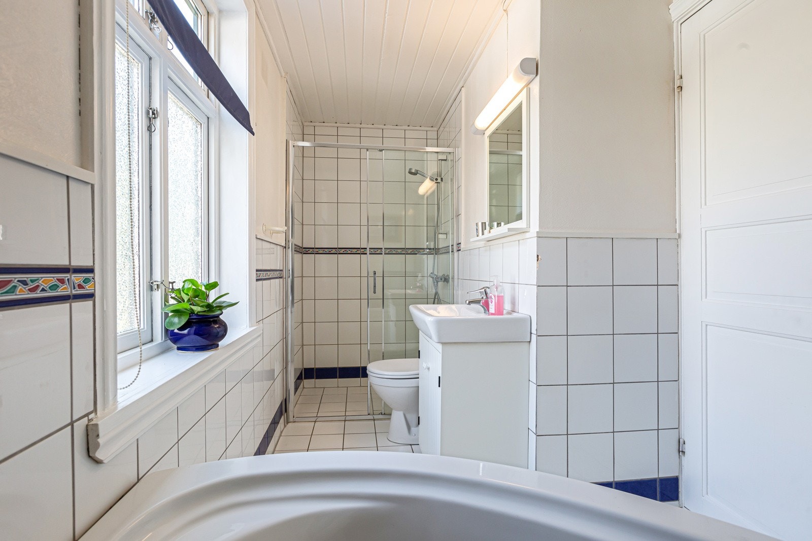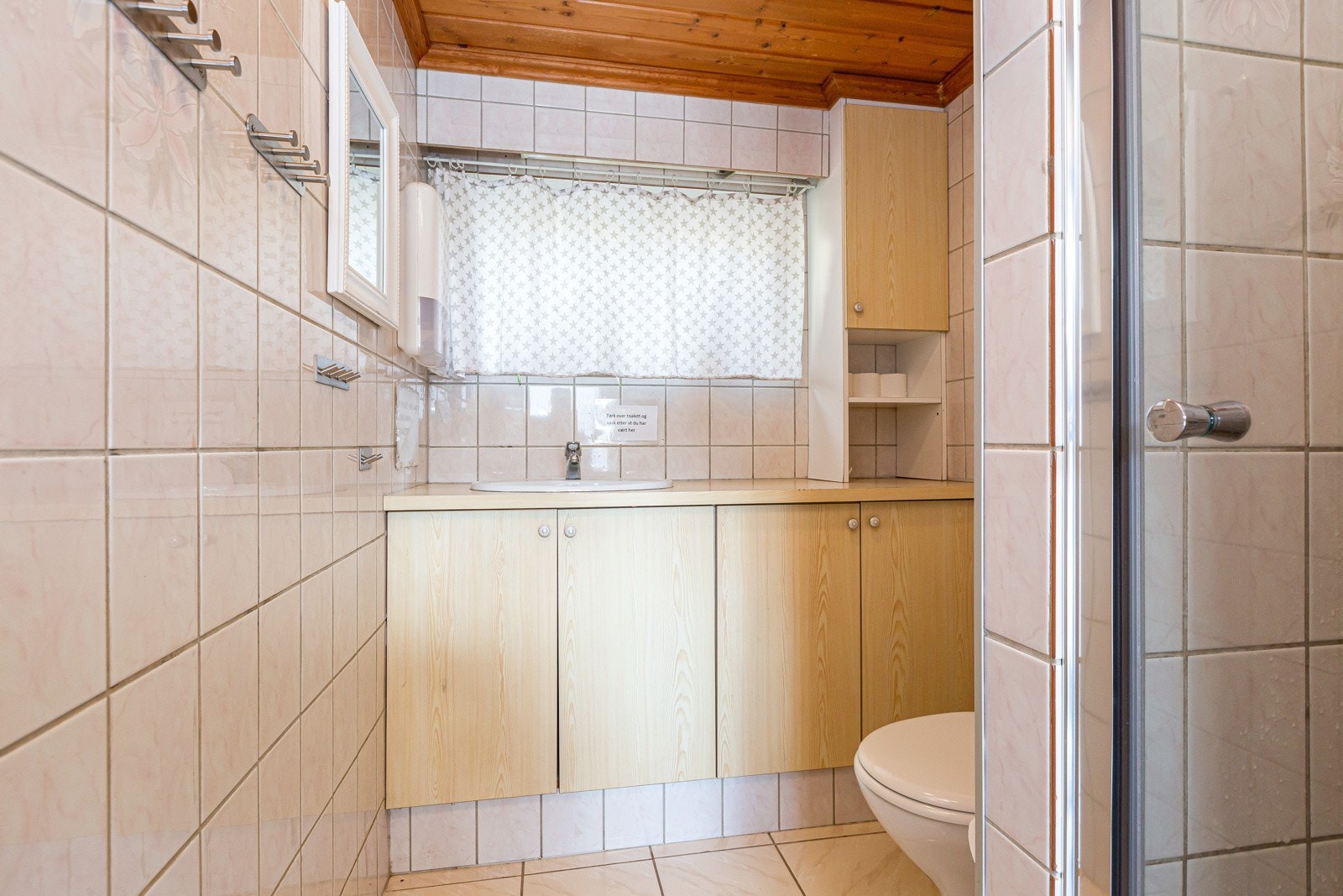 Våtrommet må oppgraderes for å tåle normal bruk etter dagens krav. Sprekk i flis og synlige fliskryss i dusjsone, langsgående sprekk i vegg ved toalett. Med bakgrunn i at badet er av eldre dato og har sluk fra byggeår må badet påregnes oppgradert i tiden som kommer, dette med bakgrunn i at eldre rustne sluk uten klemring erfaringsmessig er mer utsatt for lekkasjer i overgang membran til sluk i tillegg til at sluket i seg selv er over forventet levealder.