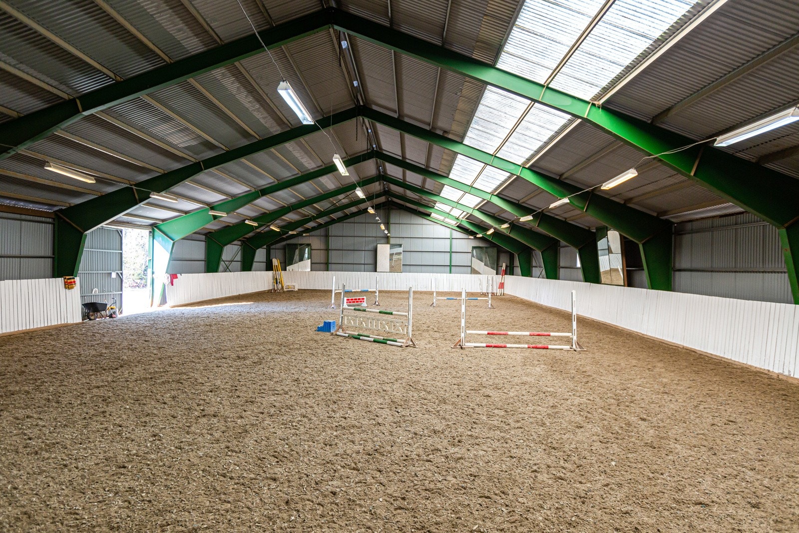 Ridehallen er oppført i 1998 i stålkonstruksjoner på betongpunkter og murer. Kledd og tekket med stålplater. Det er ridebunn av filt og sand på naturgrus og morene. Bygningen har montert LED lys i himling. I ridehallen er det også oppført en isolert brakke.