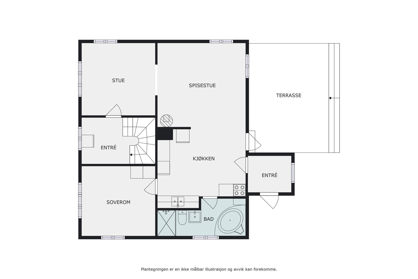1. etasje primærrom: Vindfang, kjøkken, spisestue, dagligstue, bad, soverom og entré