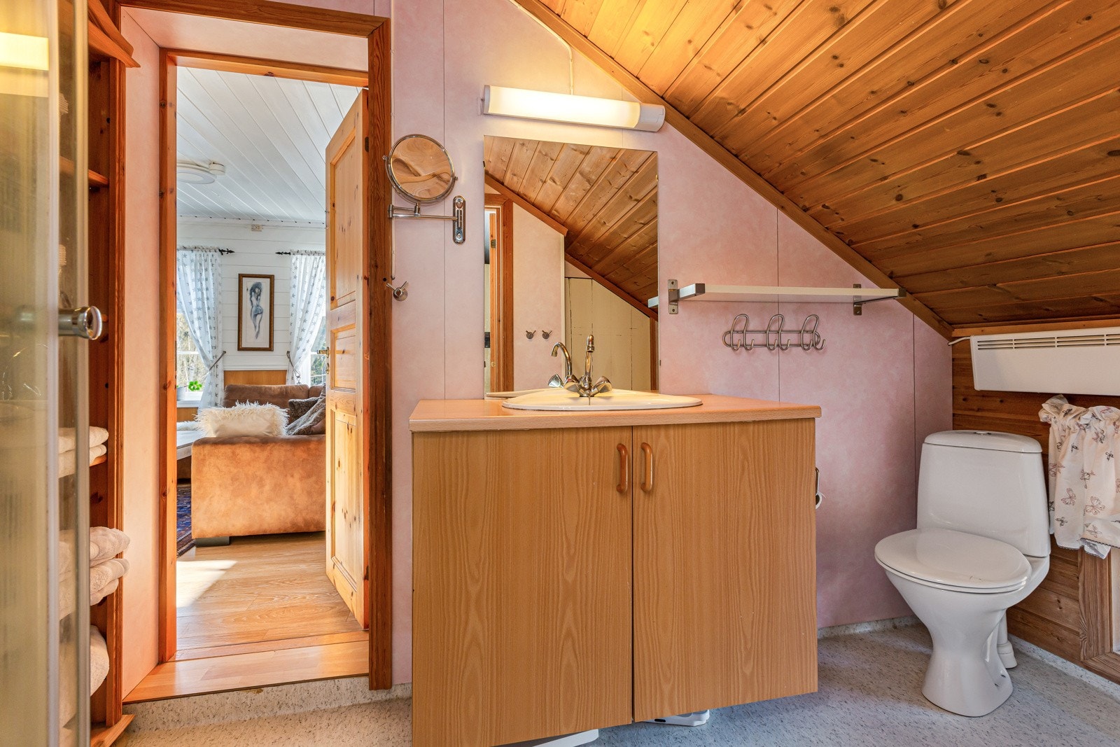 Adkomst til loft over bad, stue/kjøkken denne delen har mønet himling med panel. Ingen adkomst til andre takkonstruksjon med lavere møne.