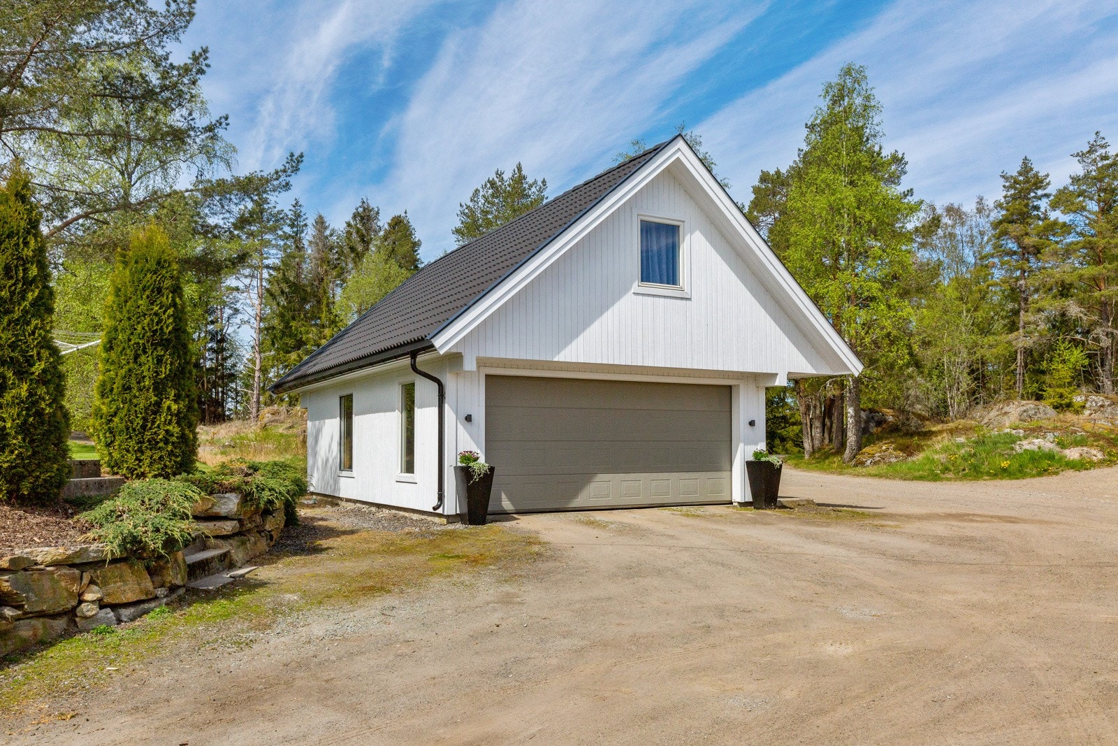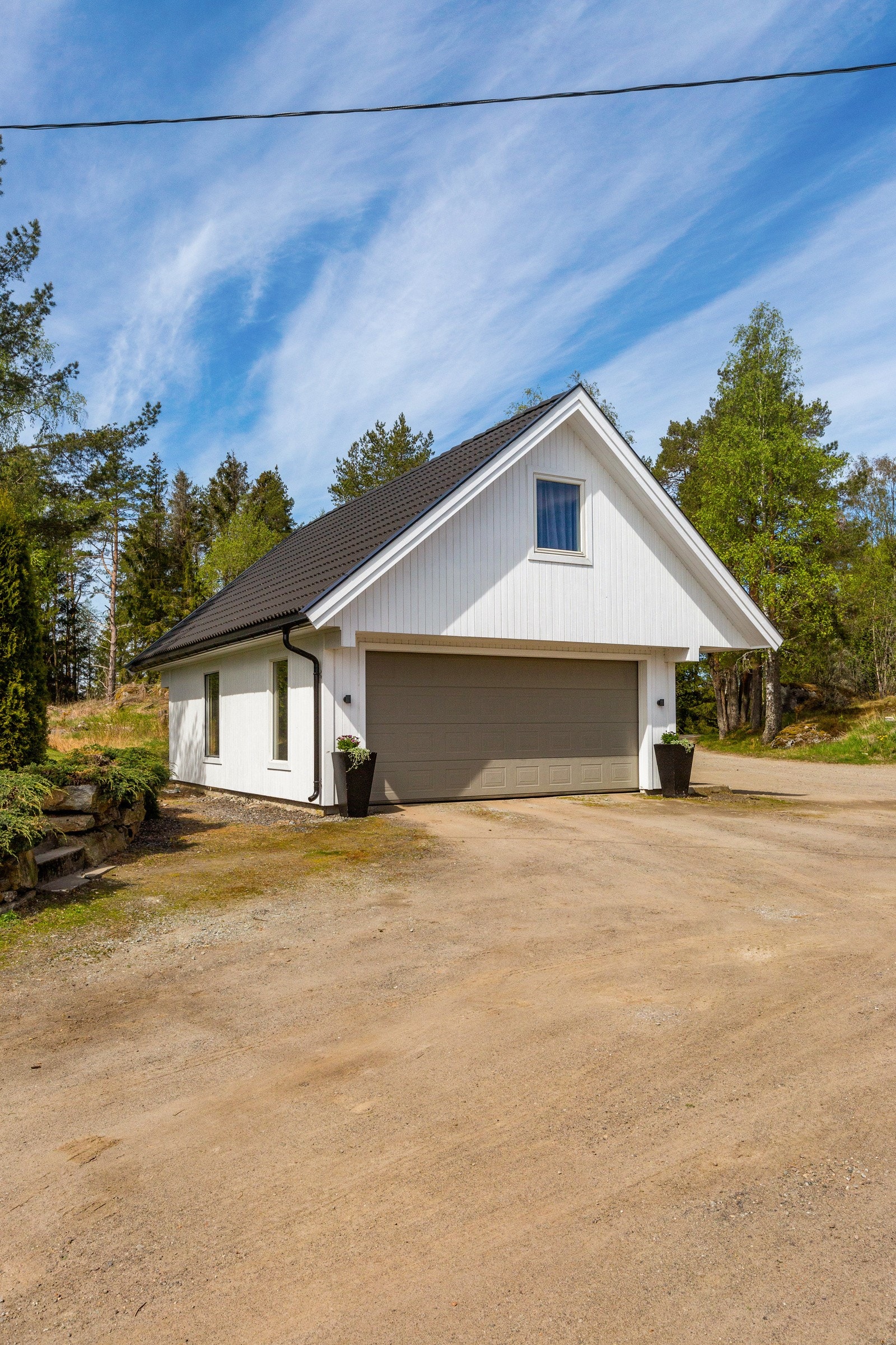 2010 på en eldre betongsåle. Garasjen har en bred leddport samt egen dør i bakkant. I tillegg er det en