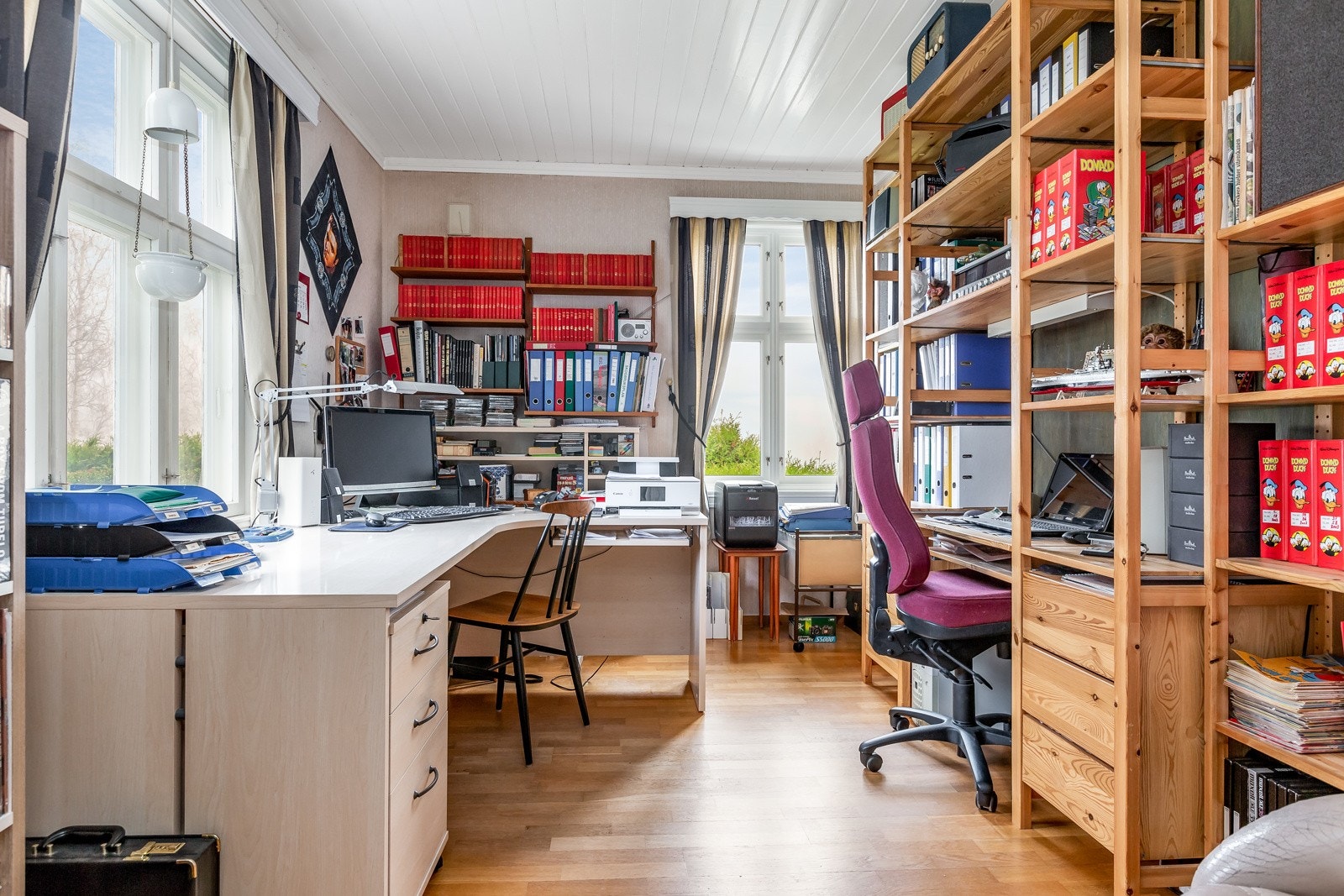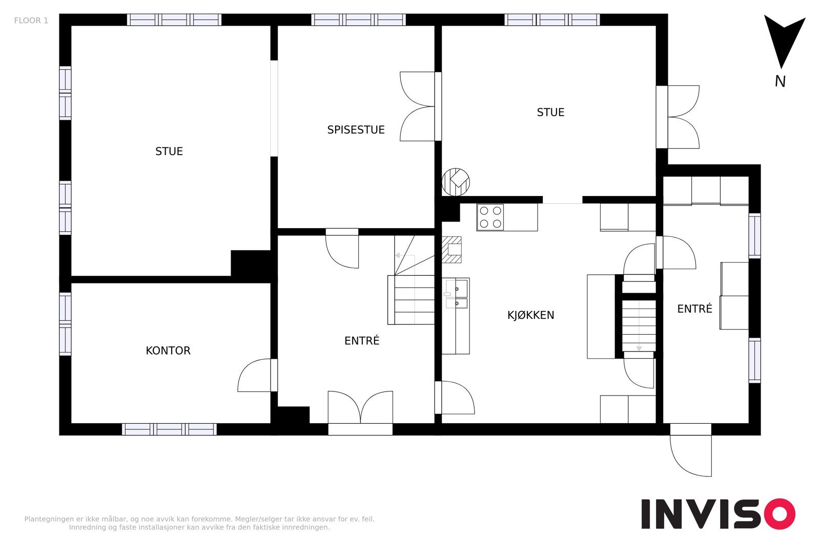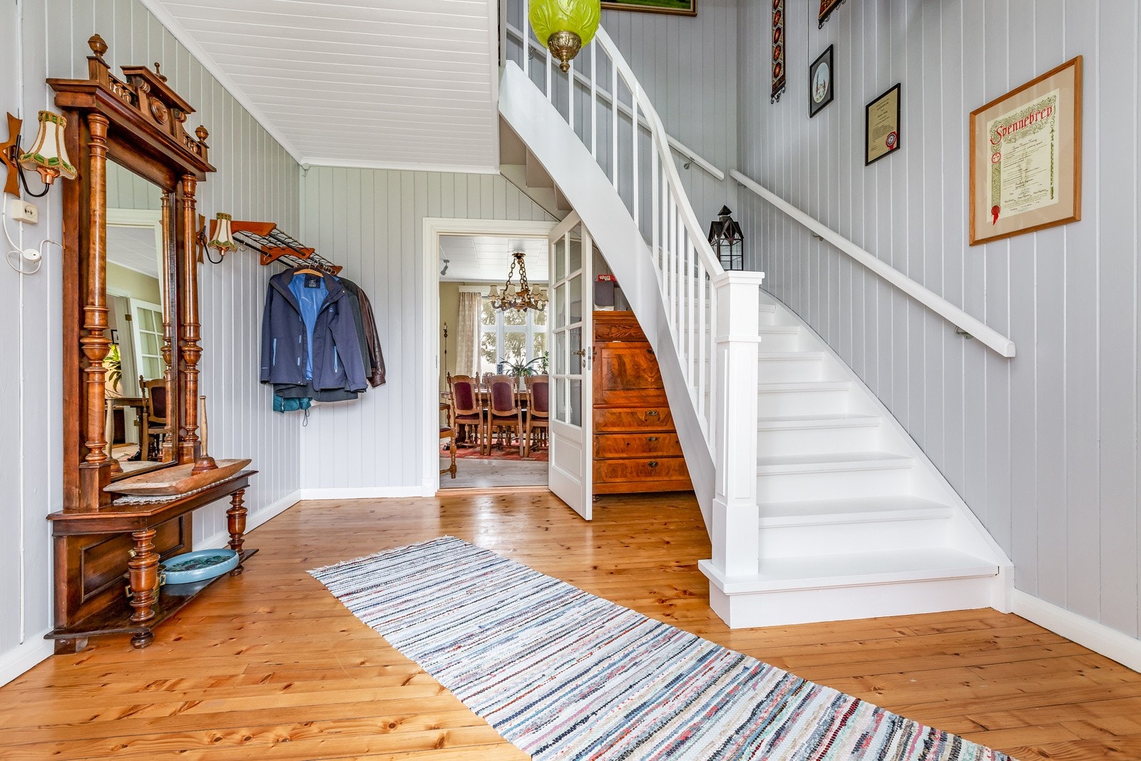 Hovedinngang/hall med trapp opp til 2. etg. - romslig kontor/alt. soverom - stort kjøkken med peisovn og