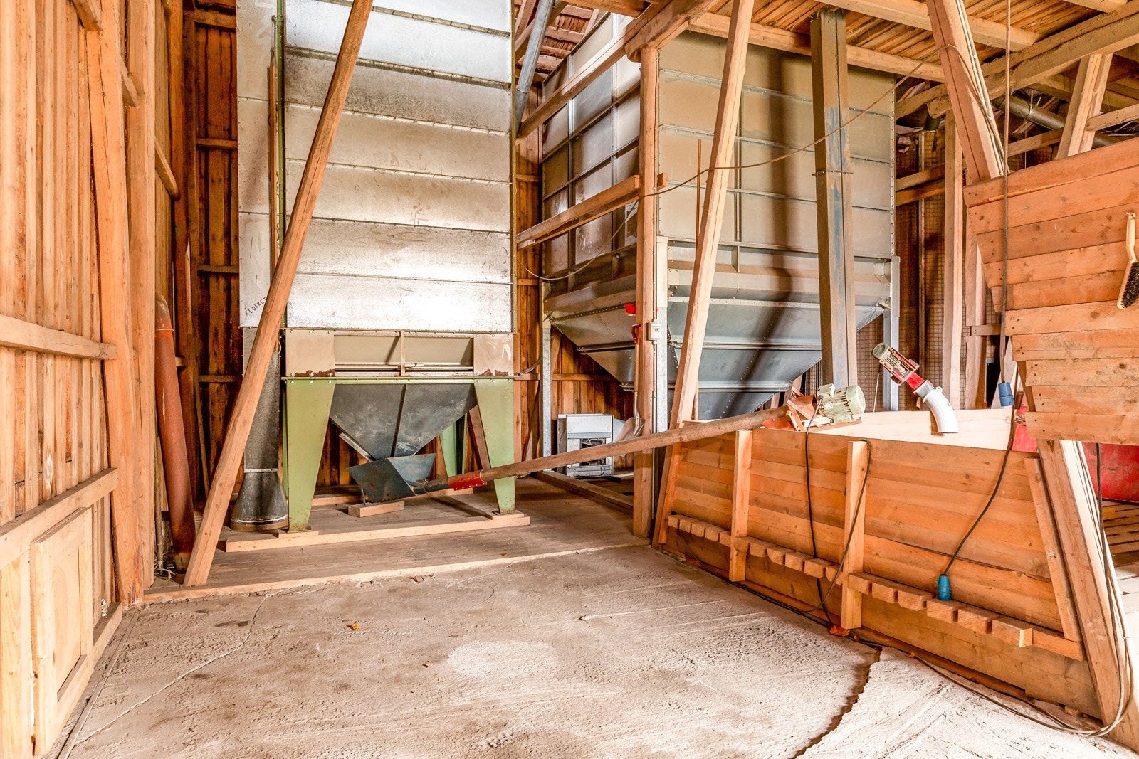 - Tradisjonell kjørebrulåve med varmluft korntørkeanlegg, tippesjakt og stål lagringssilo