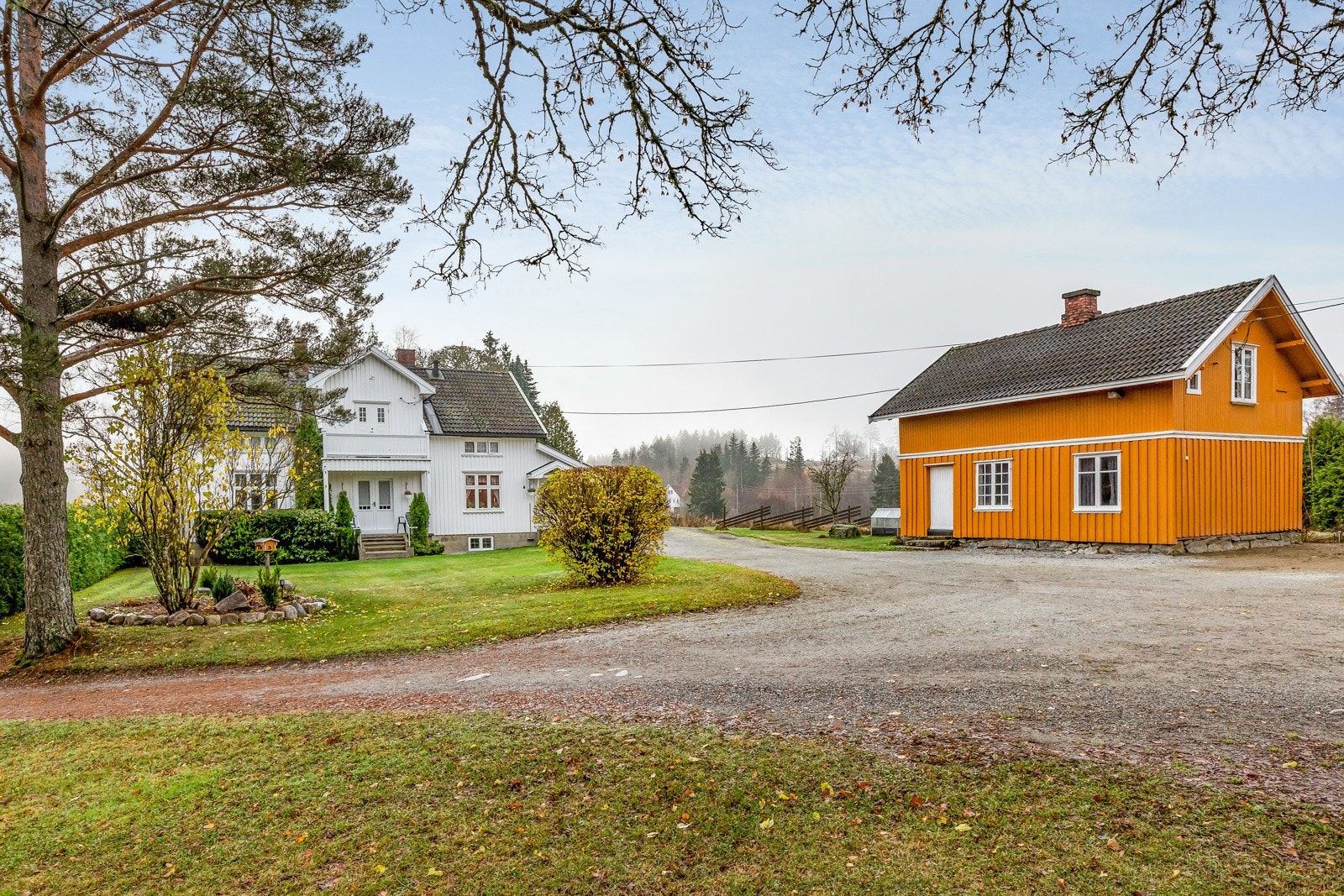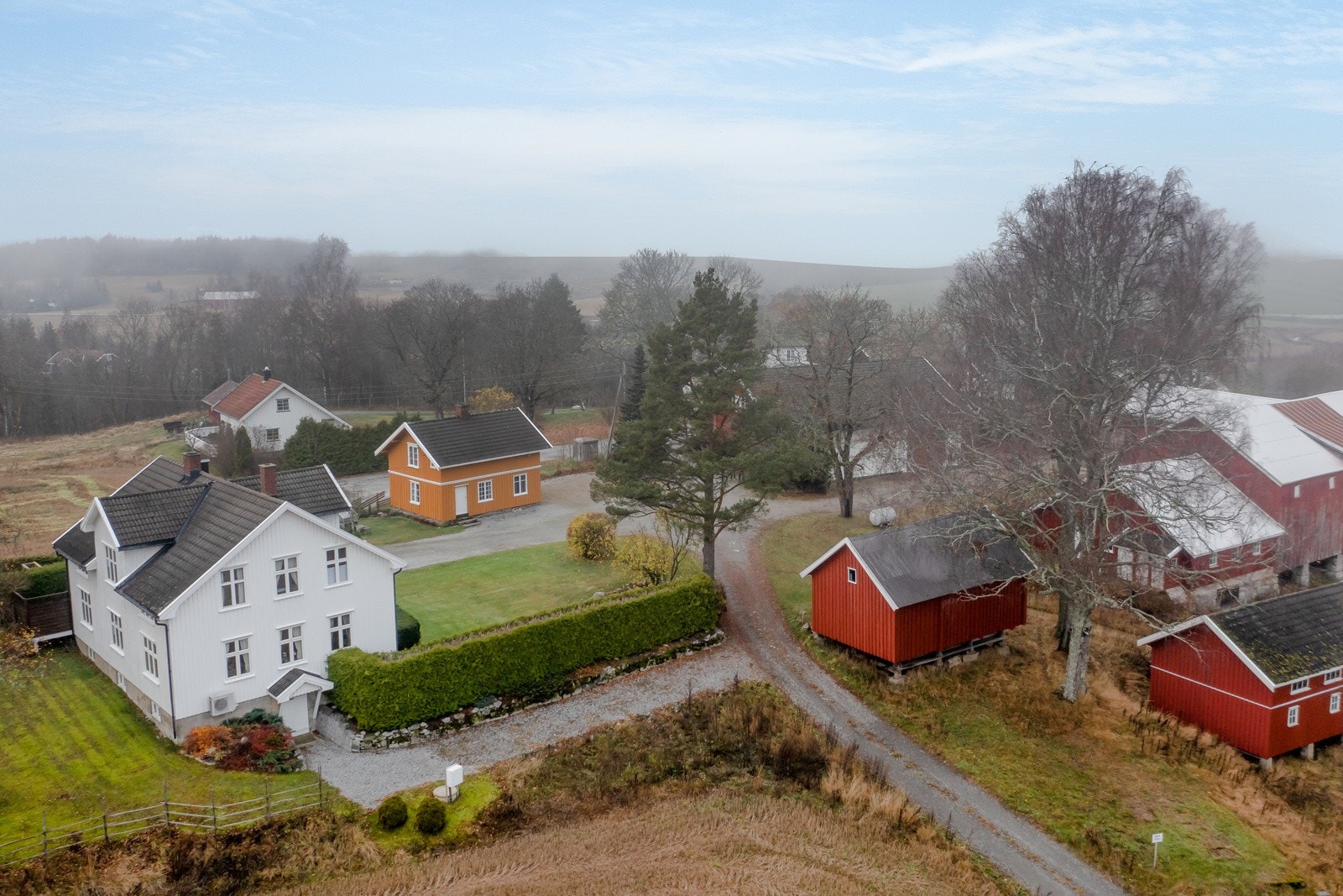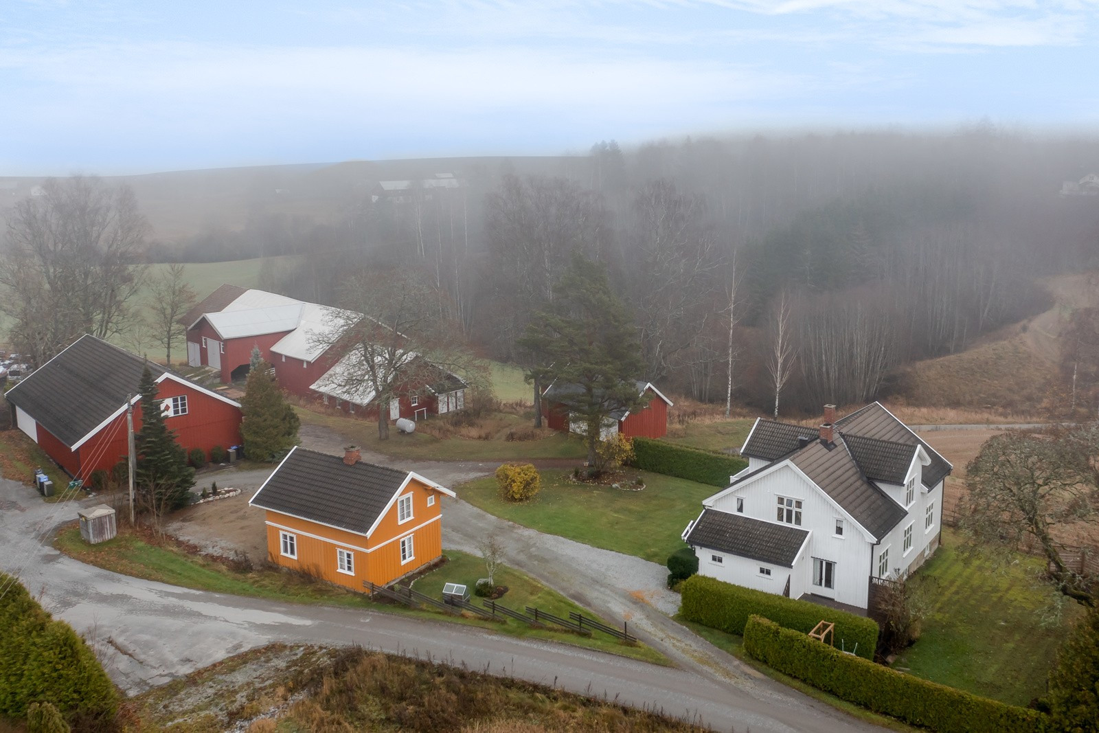 kulturlandskap med jorder og skog samt noe boligbebyggelse et stykke fra selve eiendommen. Tunet