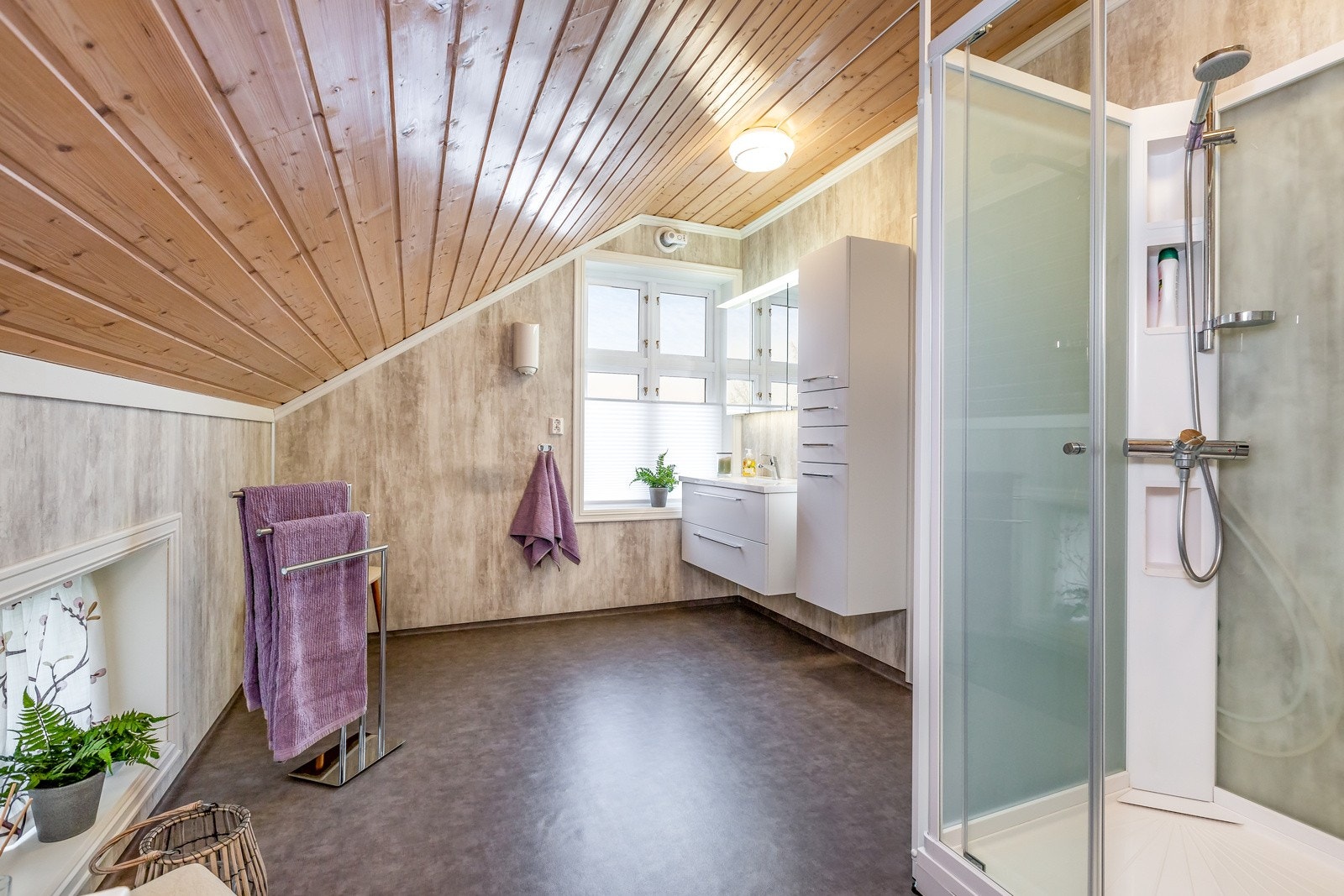 Romslig trappegang med egen utgang fin luftebalkong - stort og praktisk bad med dusjhjørne, vegghengt