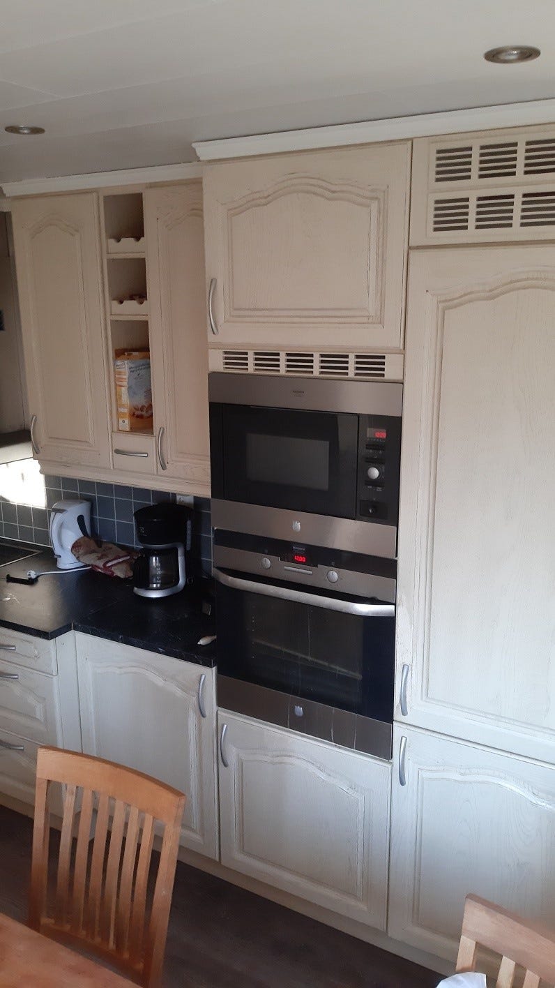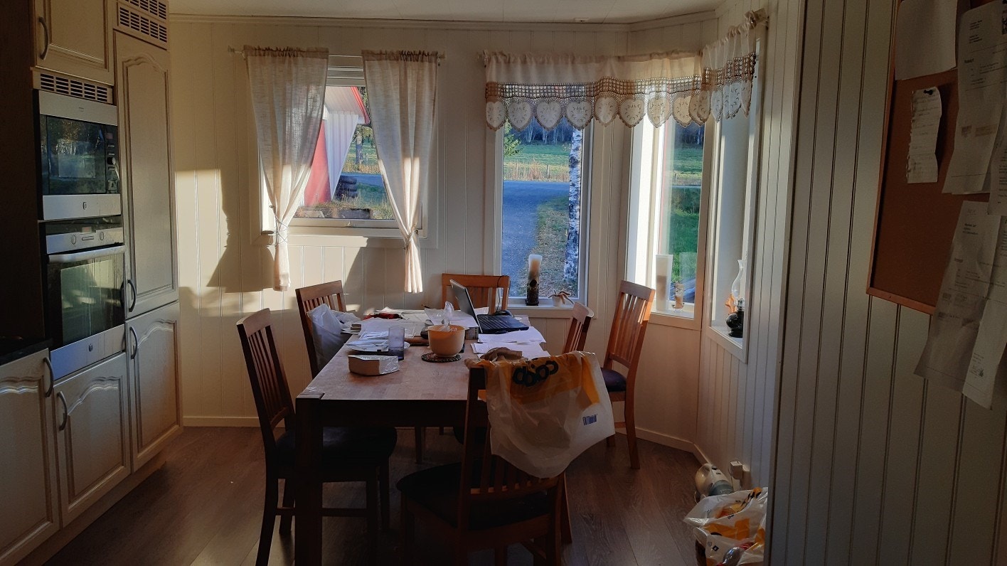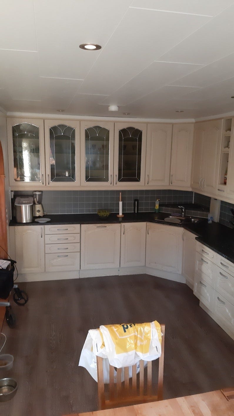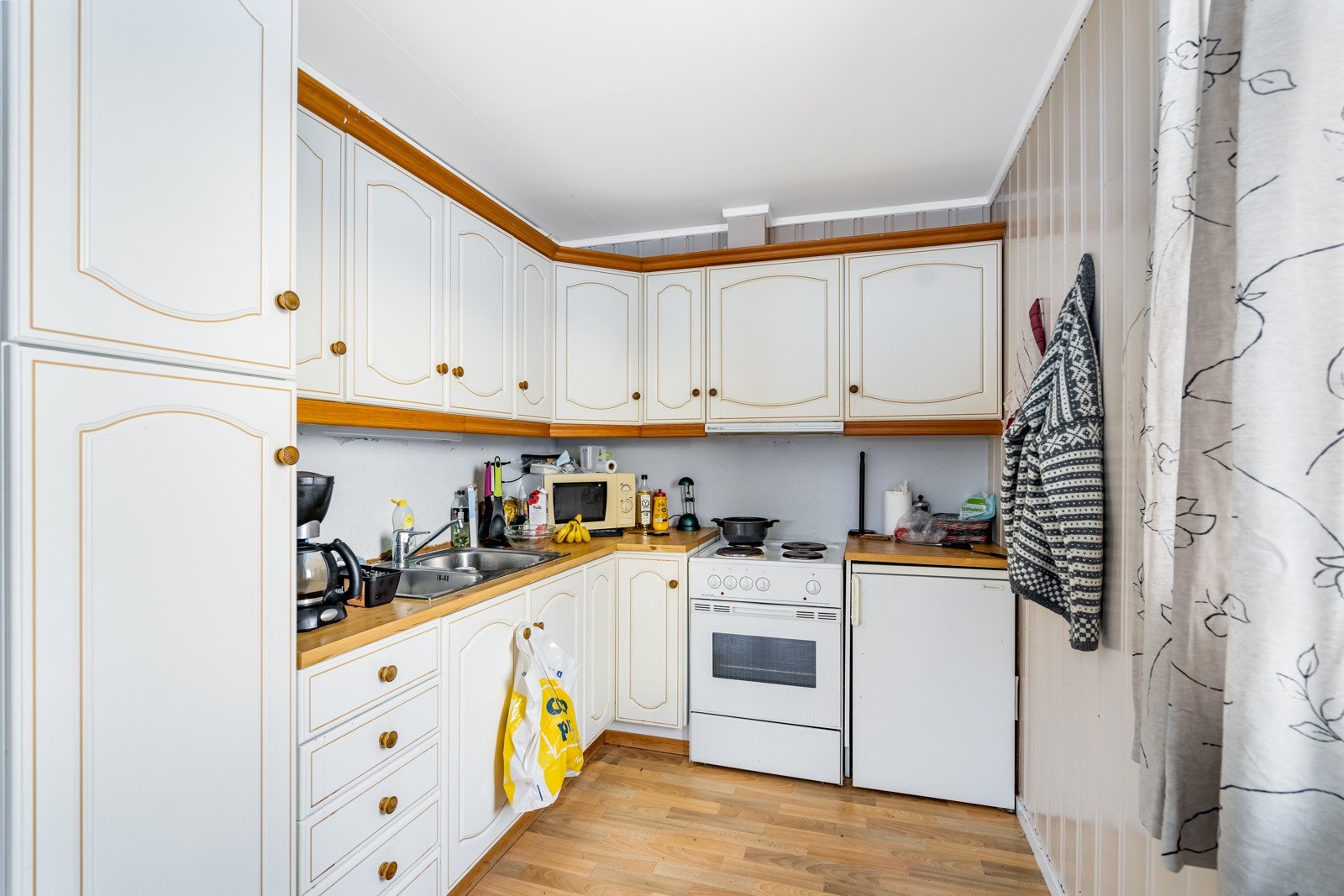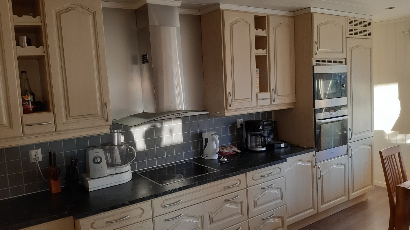 Kjøkkeninnredning: Innredning med malte profilerte dører og med god benke- og skapplass. Ventilator som mekanisk avtrekk. Integrert oppvaskmaskin, komfyr med koketopp, kjøle – fryseskap og mikrobølgeovn.