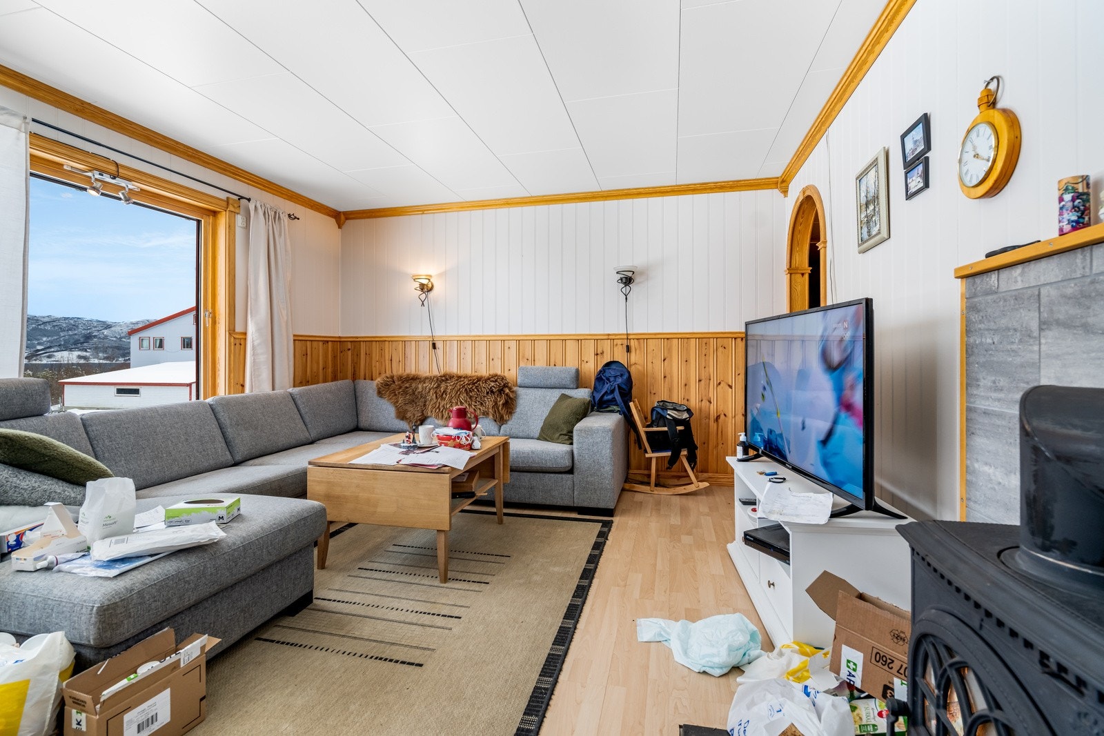 1. etasje i hoveddel: Vindfang, entre/gang, 3 soverom, bad/vaskerom, stue og kjøkken.