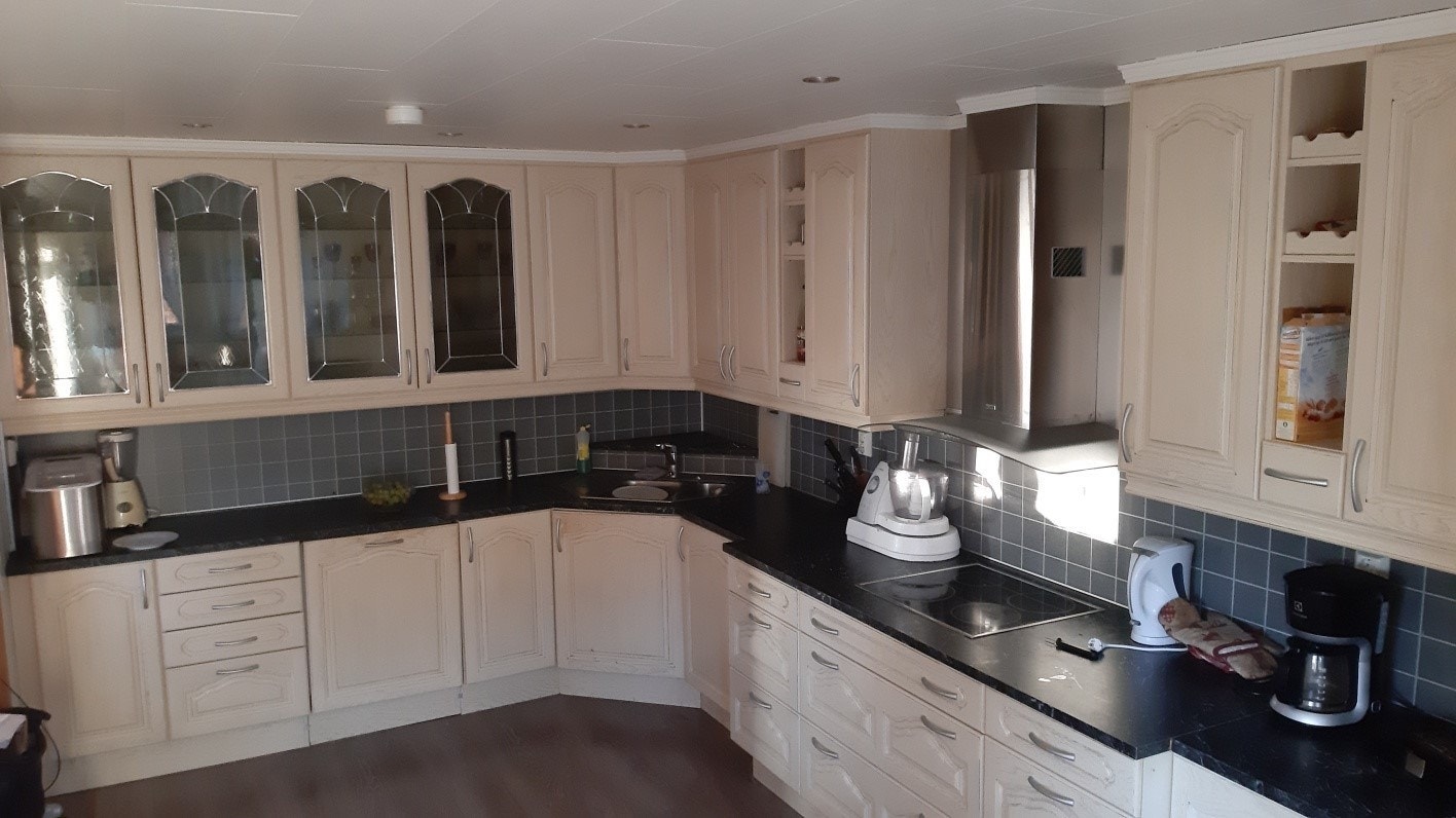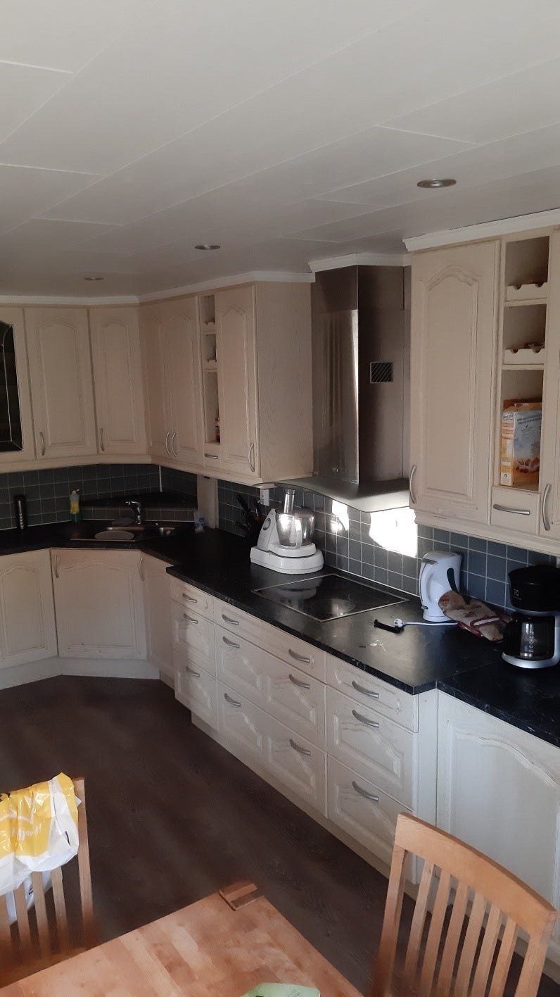 Utleie del. Kjøkkeninnredning med malte profilerte dører og benke – og skapplass. Ventilator som mekanisk avtrekk.