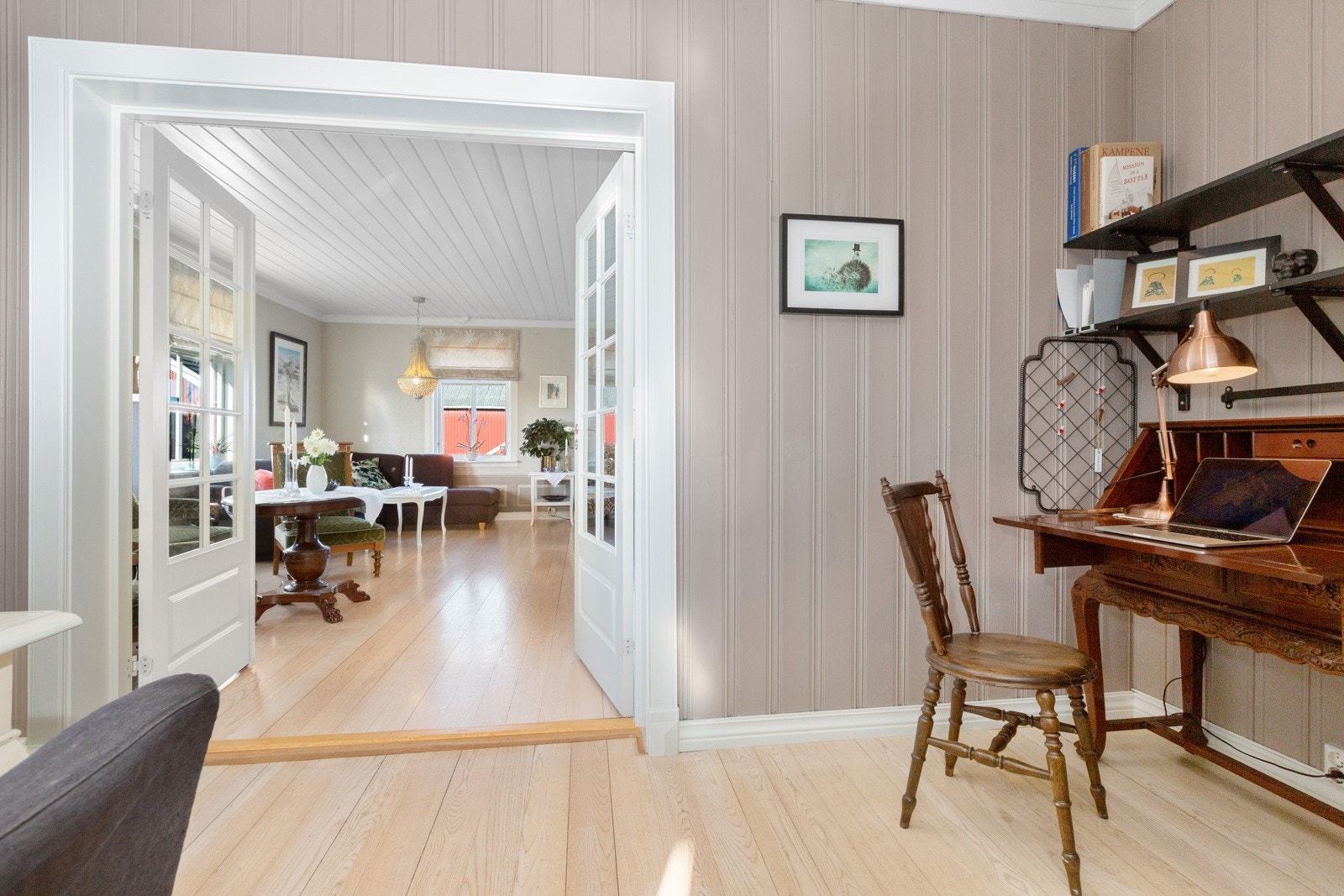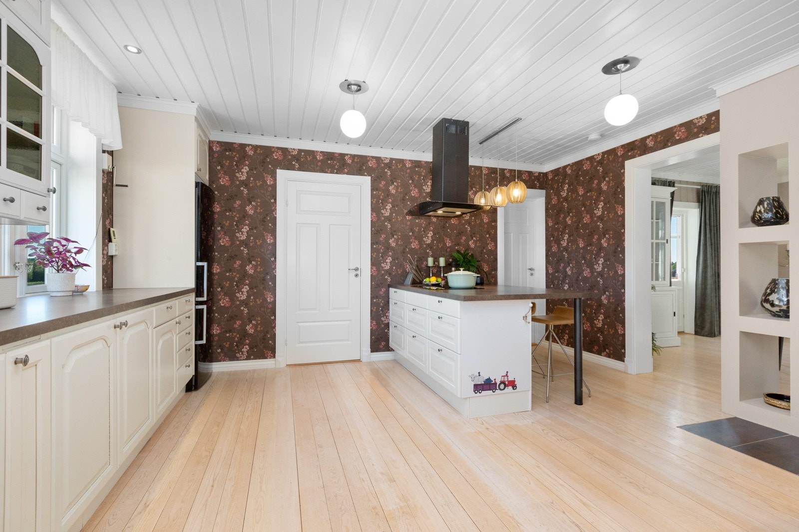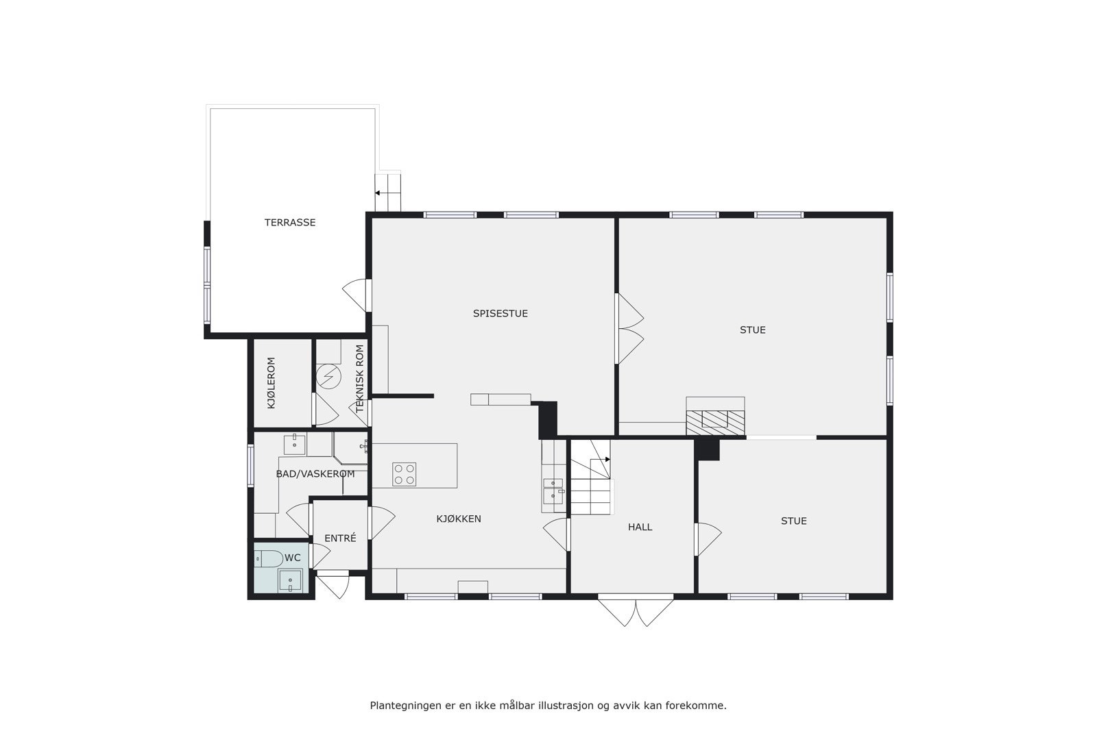 1. etasje primærrom: Hall m/trapp, kjøkken, spisestue, dagligstue, penstue, toalettrom og vaskerom Sekundærrom: Kjølerom og teknisk rom
