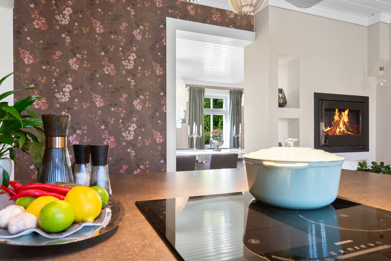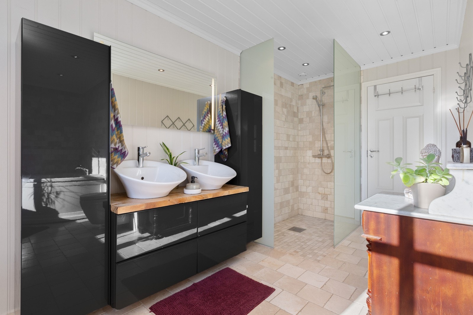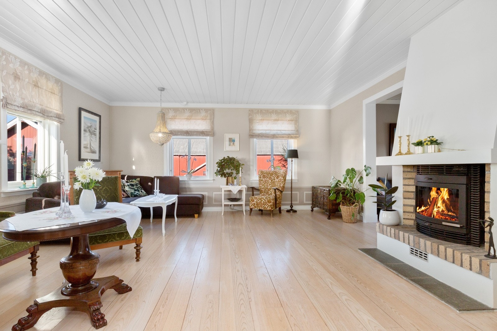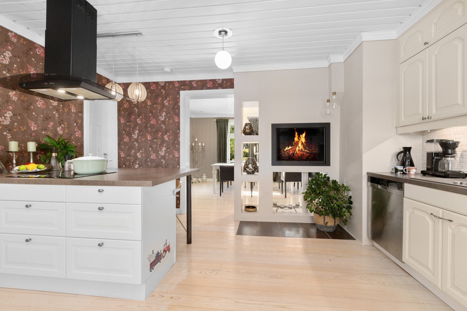 Boligen er varmet opp med vannbåren bergvarme og vedfyring.