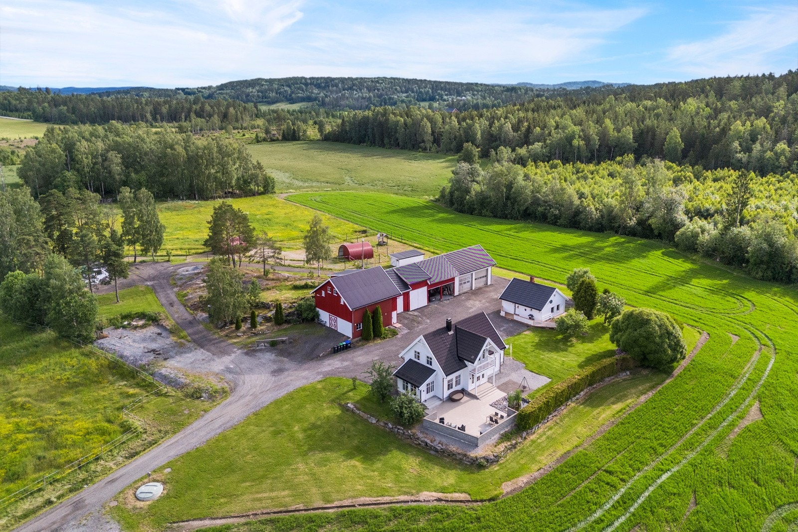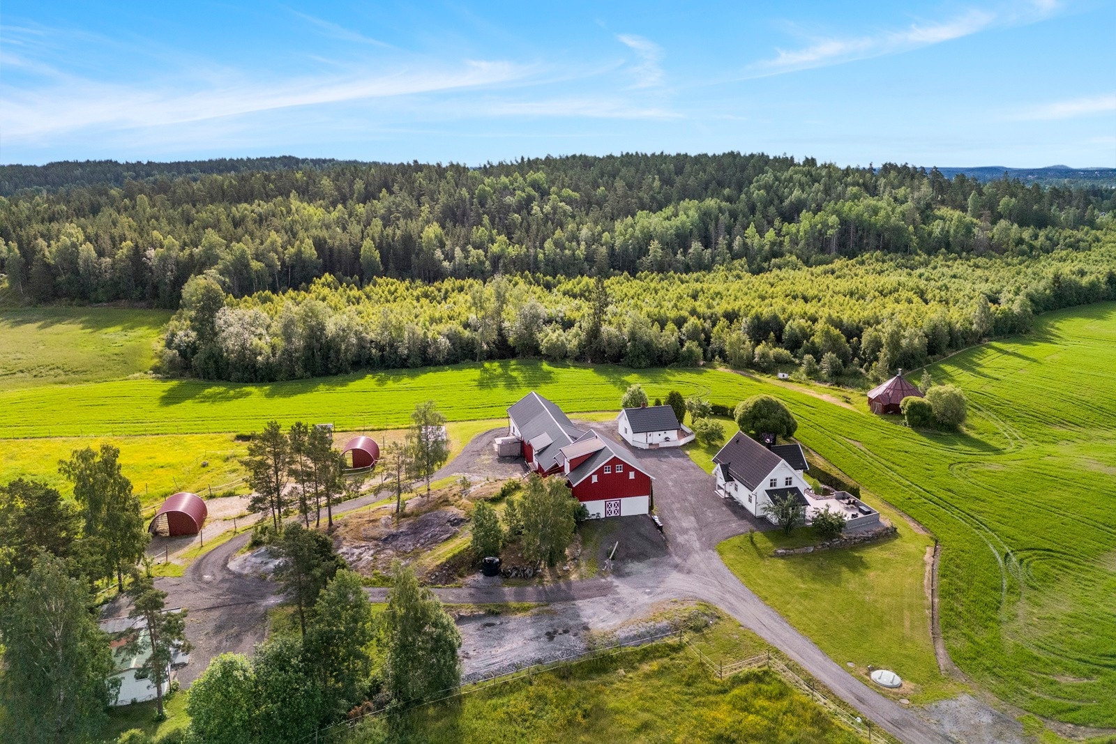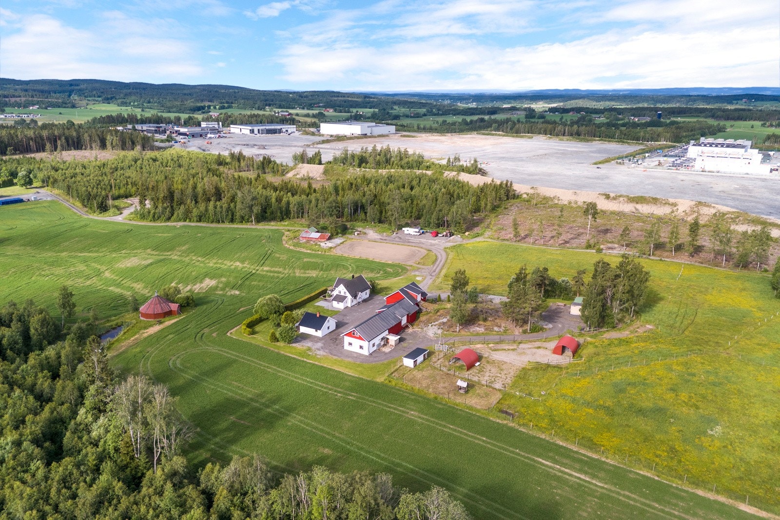 På tunet er det en stor og åpen, gruset gårdsplass med god plass for mange biler og andre kjøretøy. Pent opparbeidet og flat hage rundt huset. Noe dyrket mark rundt tunet, og en jordleieavtale for ridebanen, som overtas av kjøper. Leieavtalen er for 10 år, og leieavgiften pr. år er kr. 10.200,-. Jordleieavtalen ligger vedlagt i salgsoppgaven