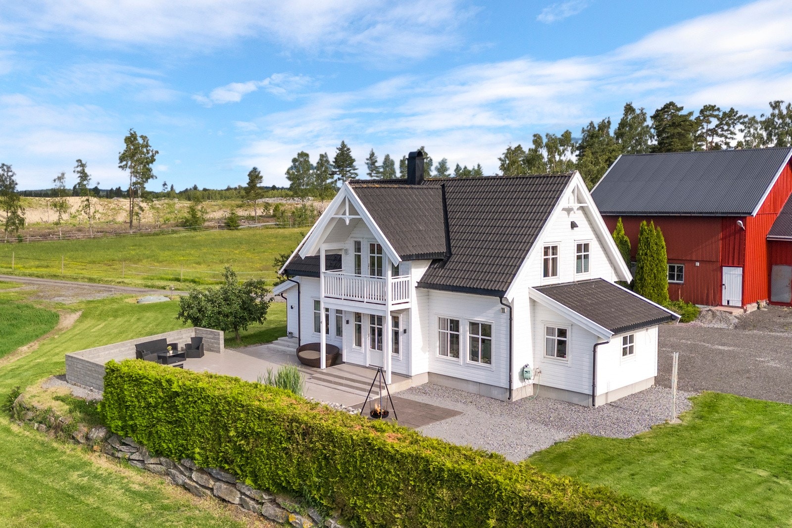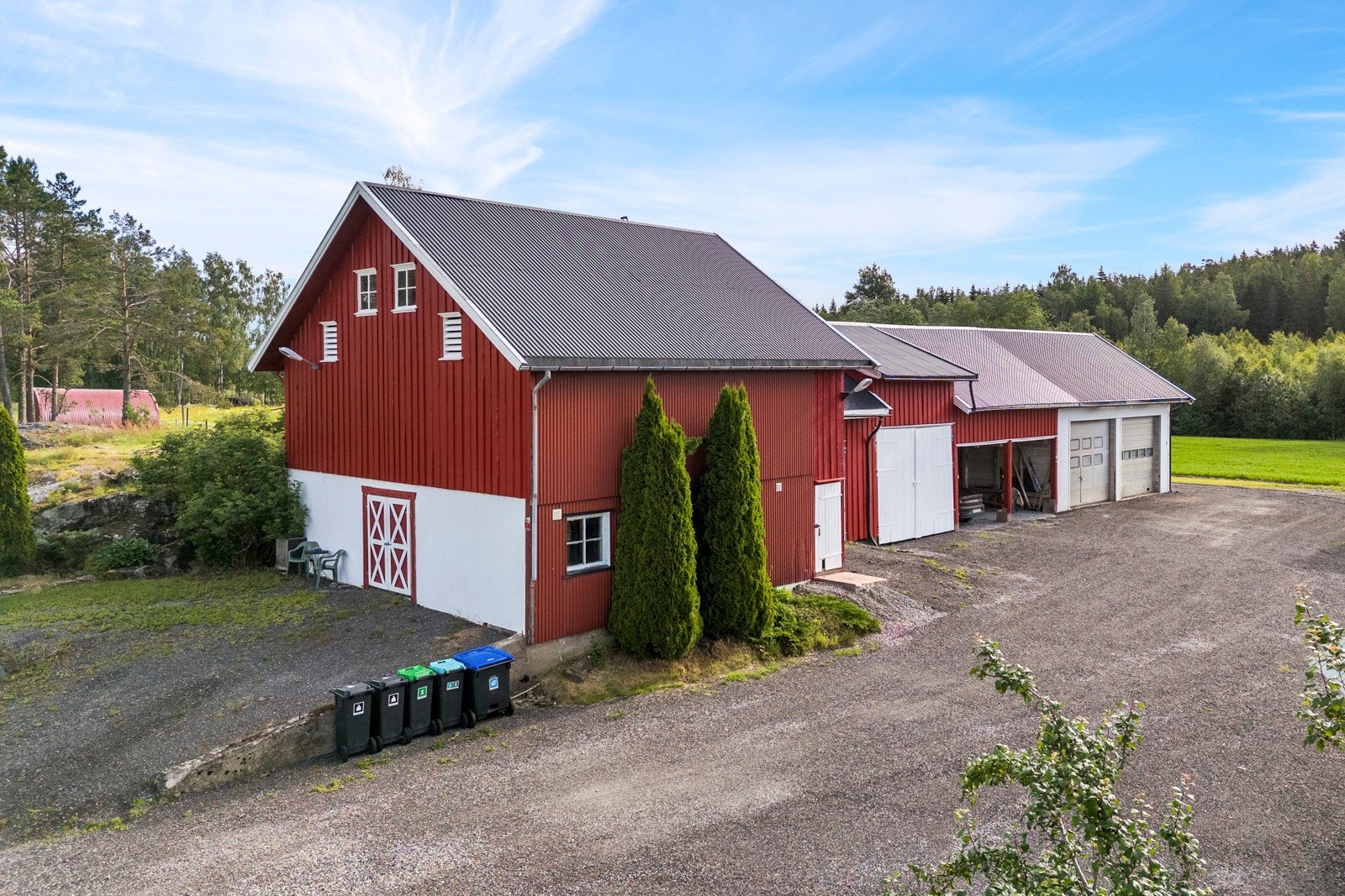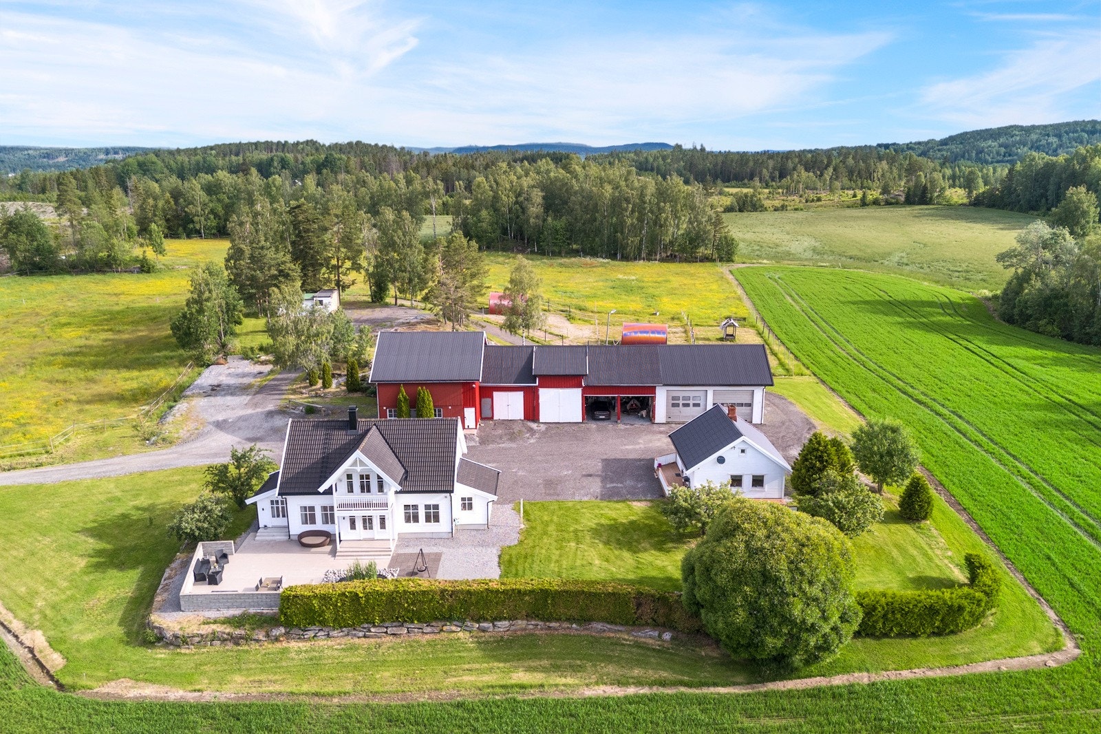 På tunet er det en stor og åpen, gruset gårdsplass med god plass for mange biler og andre kjøretøy. Pent opparbeidet og flat hage rundt huset. Noe dyrket mark rundt tunet, og en jordleieavtale for ridebanen, som overtas av kjøper. Leieavtalen er for 10 år, og leieavgiften pr. år er kr. 10.200,-. Jordleieavtalen ligger vedlagt i salgsoppgaven