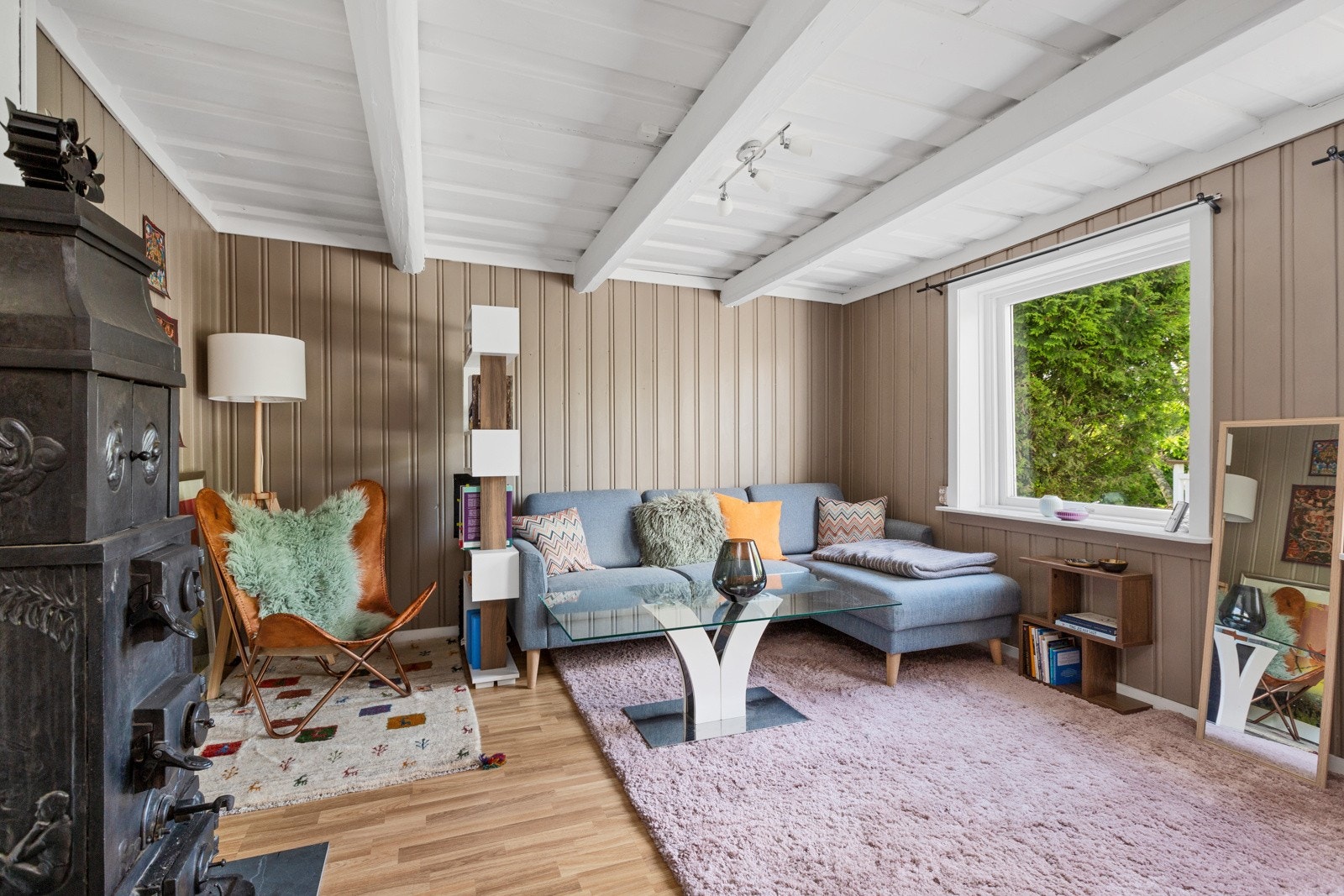 1. etasje: Gulv: Fliser på alle gulv bortsett fra stue, som har laminat. Vegger: Malt panel. Himlinger: Panel med synlige dragere. 2. etasje: Gulv: Beisede og lakkerte furugulv. Vegger: Malt panel. Himlinger: Malt panel.