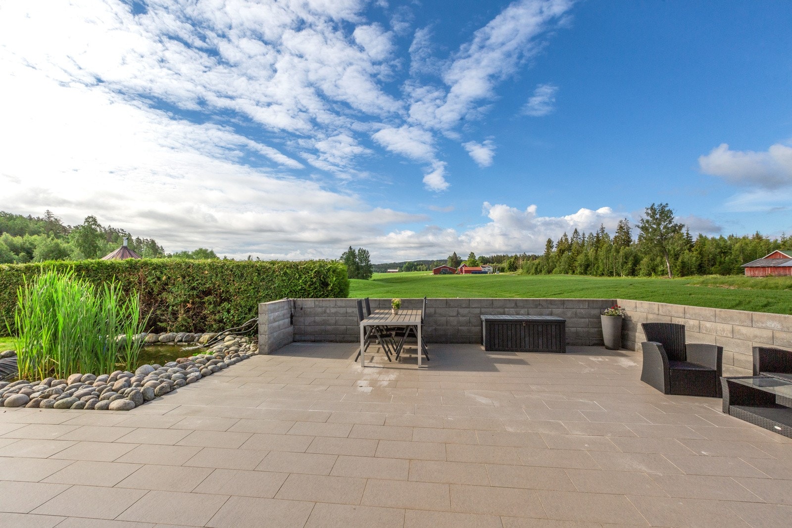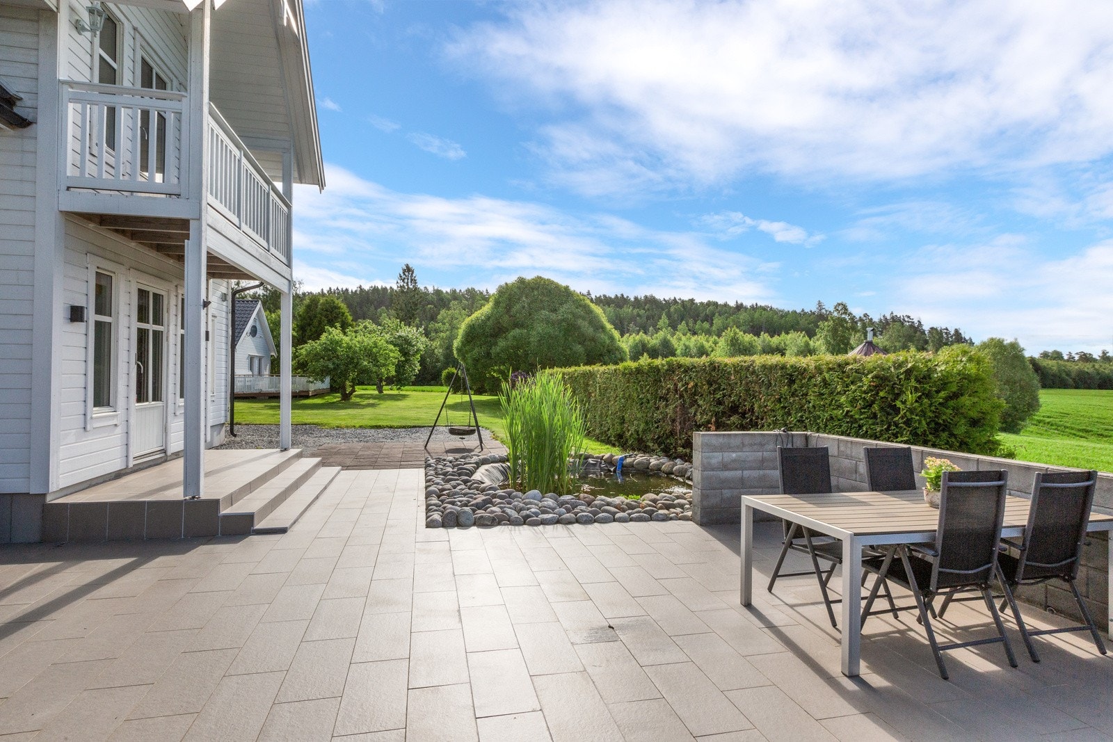 Terrasse på ca. 28 m², vendt mot vest og syd. Av materialer er det benyttet impregnerte materialer på gulv og på rekkverk (malt).