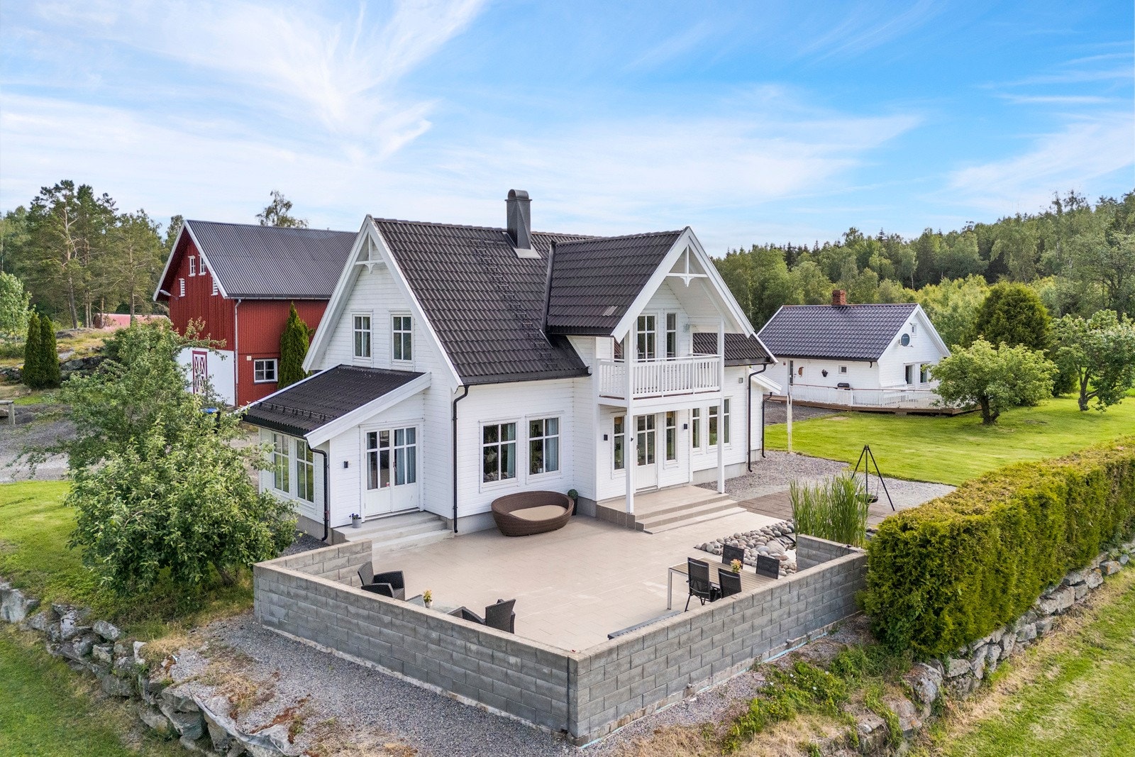 Våningshuset har gode og praktiske planløsninger, som strekker seg over 2 plan. Trivelig adkomst via gårdsplass med overbygget inngangsparti. Entréen gir et godt førsteinntrykk med flislagt gulv og garderobeløsning. Vaskerommet ligger rett ved inngangen. Stor åpen kjøkkenløsning med spiseplass. Sigdal kjøkkeninnredning (type: herregård) med god skap- og benkeplass. Hvite profilserte fronter og fliser mellom over- og underskap. Det er innebygget kjøleskap, integrert stekeovn og induksjonstopp. Fra kjøkkenet er et utgang til stor flislagt terrasse. Det er også en dam ved terrassen. Romslig stue med flere innredningsmuligheter. Kontor har egen inngang, men kan også benyttes som soverom, som vil gjøre at boligen har livsløpsstandard. I 2. etg. er det flislagt bad med baderomsinnredning, dusjhjørne, boblebadekar og wc. Loftstue m/utg. til balkong og 3 soverom med garderobeløsning.
