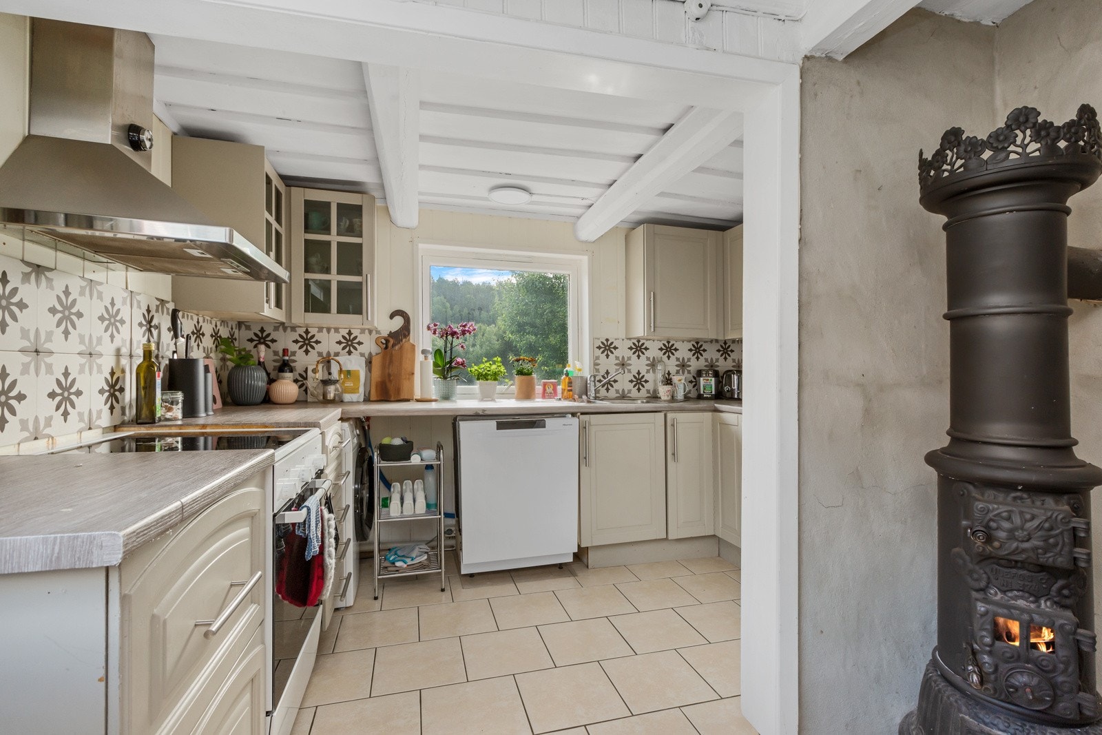 Pipe i tegl, med bunnbeslag og tegl over tak. Vedovn i kjøkken.
