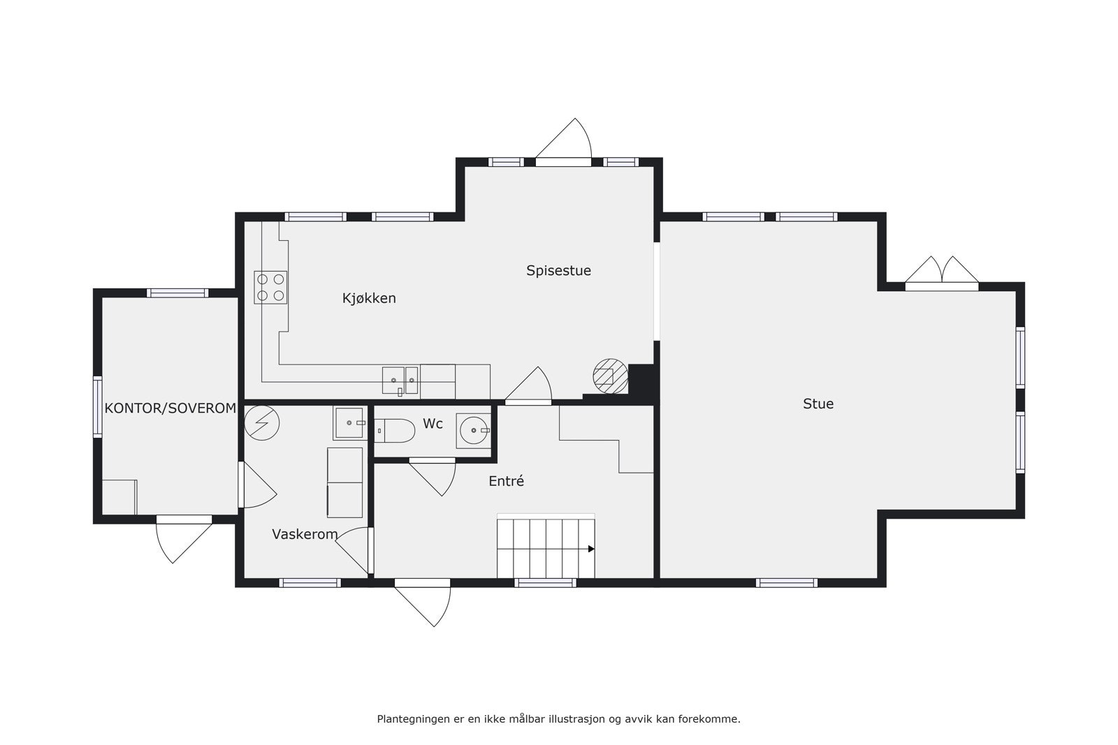 1. etg.: Hall, vaskerom, kontor m/egen inngang, wc, kjøkken og stue m/utg. til terrasse