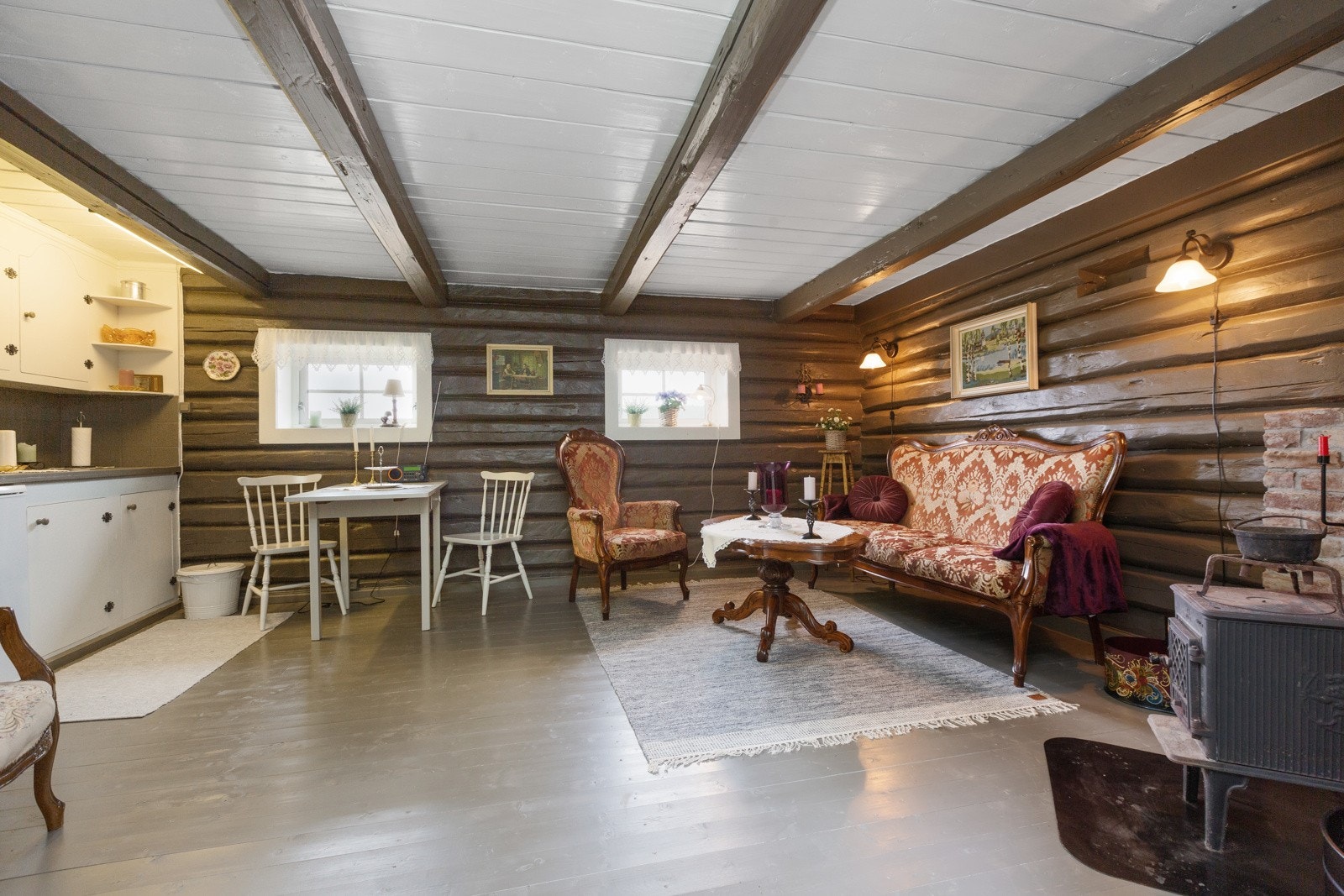 Mer enn halvparten av forventet brukstid er passert på undertak. Eldre undertak med misfarging, lokal råte/sopp og spor etter barkbille.