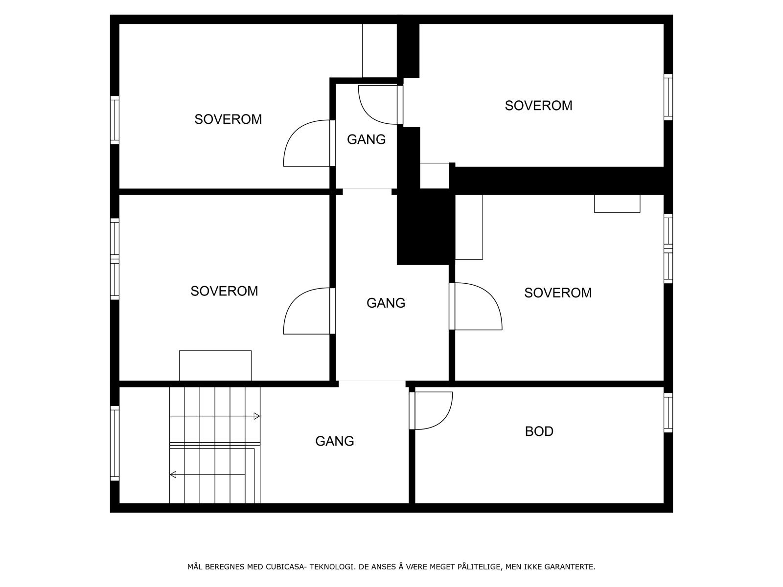 2. Etasje primærrom: Trappegang, gang, hobbyrom og fire soverom. Sekundærrom: Kott. Tre av soverommene i andre etasje har for små vinduer etter krav om lys og rømningsvei.