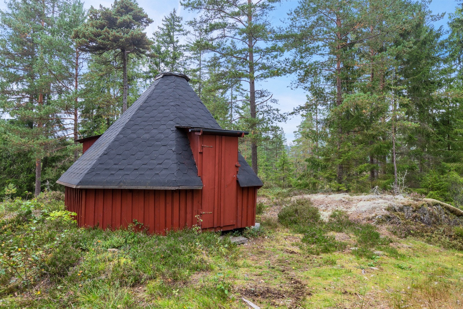 Byggeår 2008. Fundamentert på lecablokker på fjell. Åttekantet bygg oppført i reisverk som utvendig er kledd med tømmermannspanel. Skråtak som er tekket med shingel. Det er oppløft på taket ved inngangsdør, og på motsatt side av inngangsdør der det er vindu.