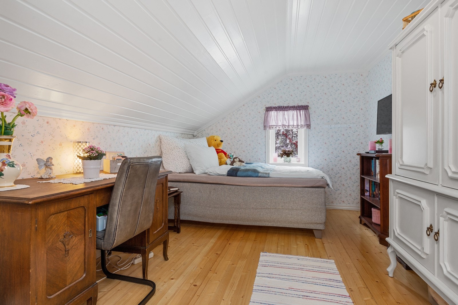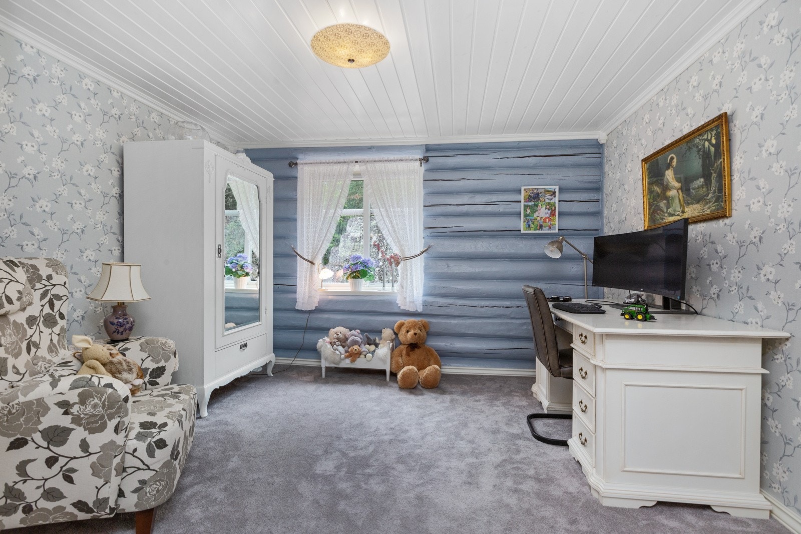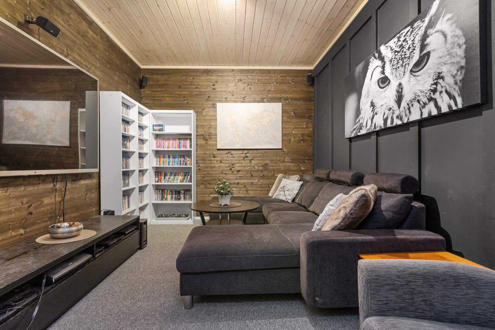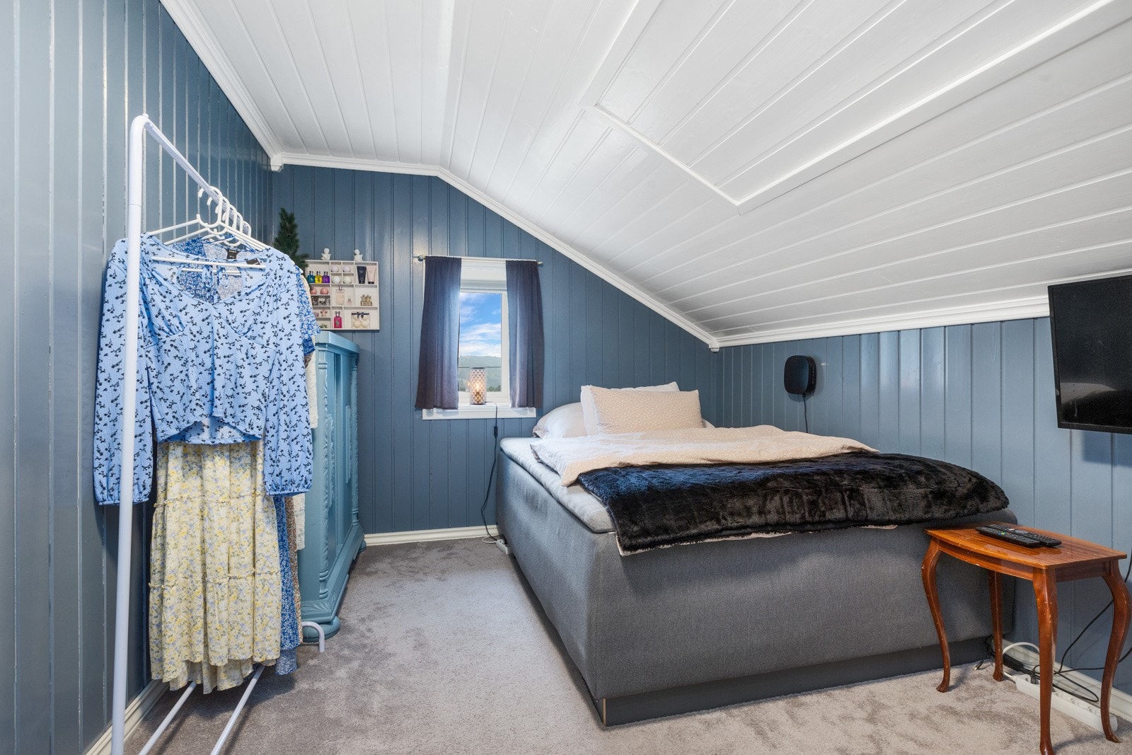 1. etasje østre fløy: Isolerte lagerrom og hjemmekino/hobbyrom. Stor hems med trappeadkomst.