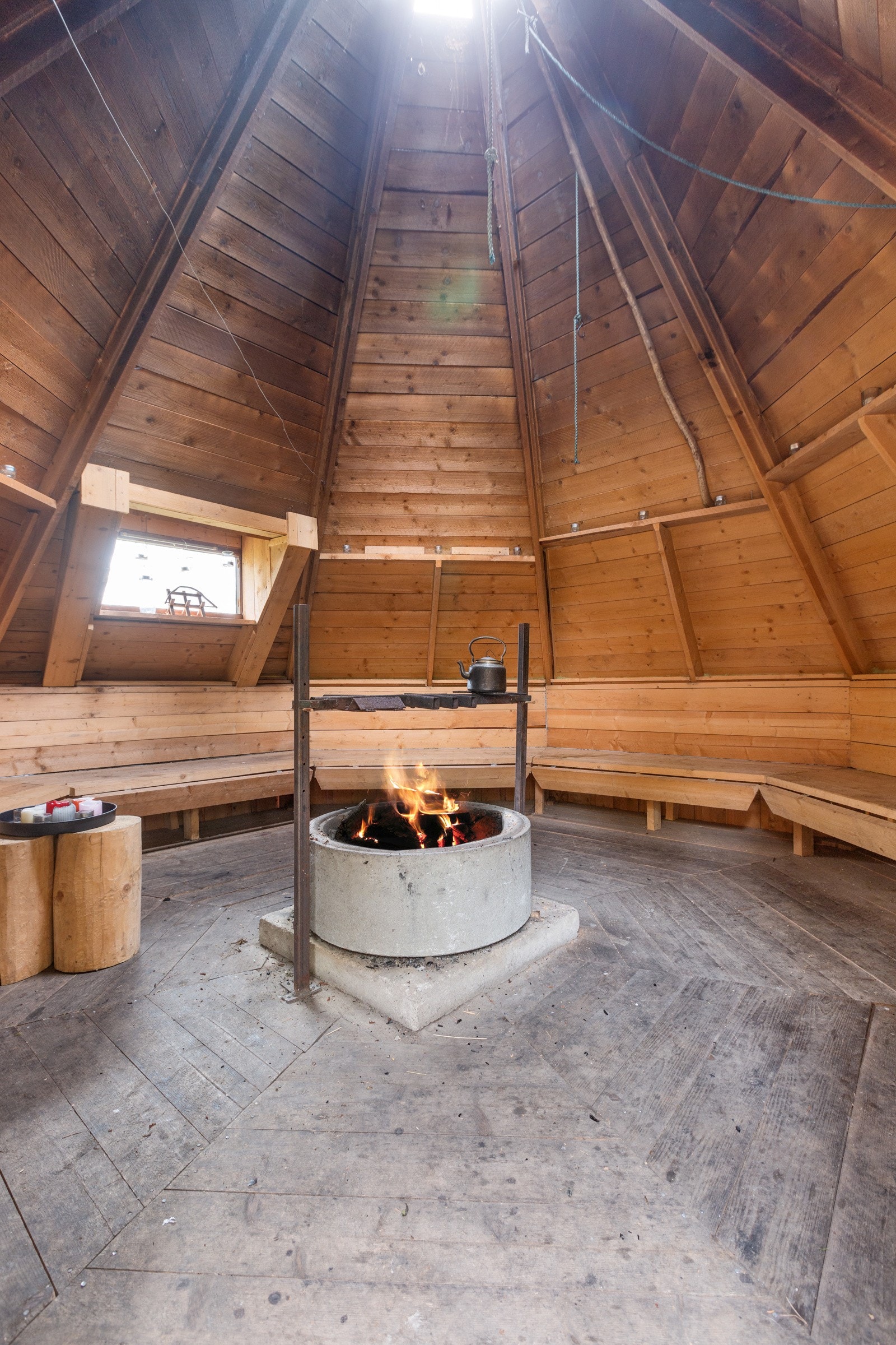 1 km nord for tunet i eiendommens skog er det også tidligere oppført en flott lavvo med en grunnflate på ca. 18 kvm. Lavvoen ligger fint til på en åskam og kan romme flere personer med sittebenker langs veggene, og plassbygget grue i midten med ljore i taket.