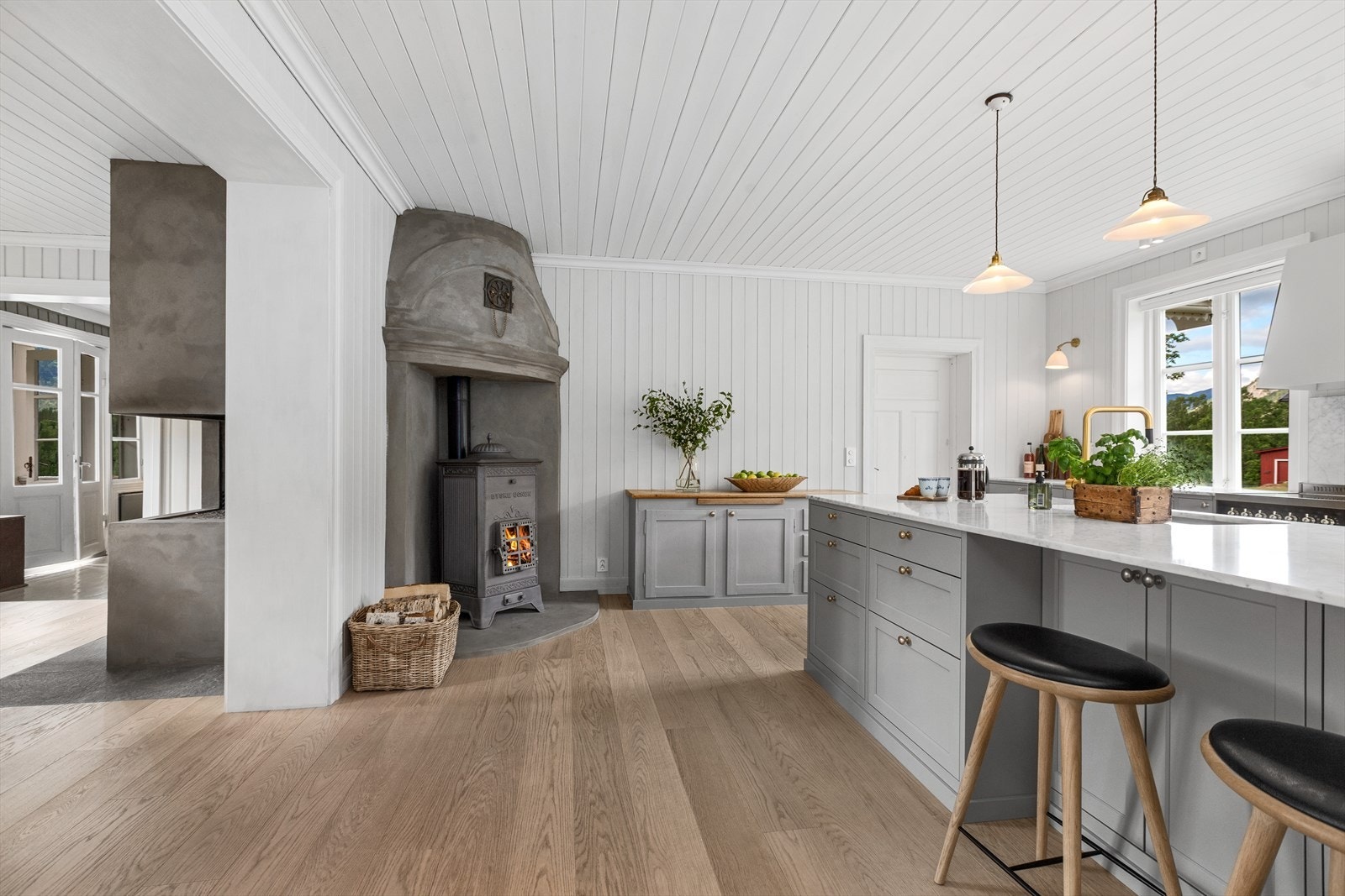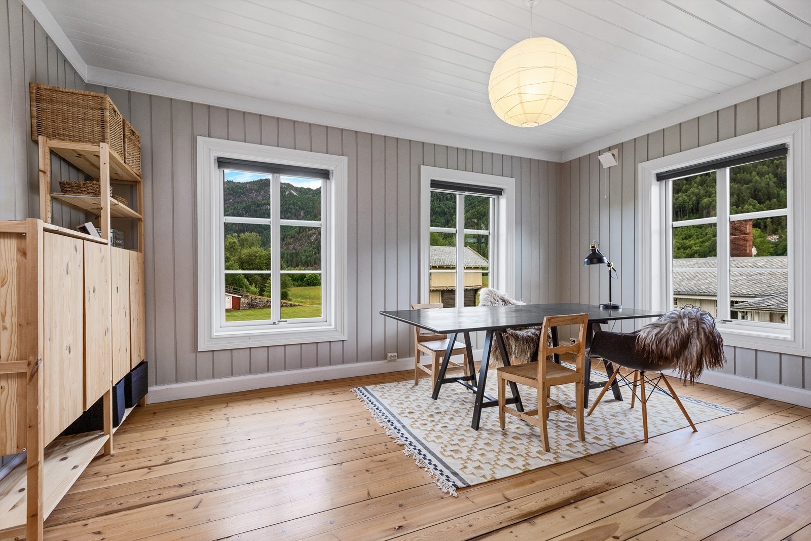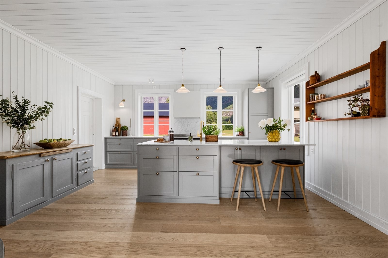 1. etasje (123 kvm.): Entre, bad, kjøkken, stue, entre, hallingsstue og bryggerhus.