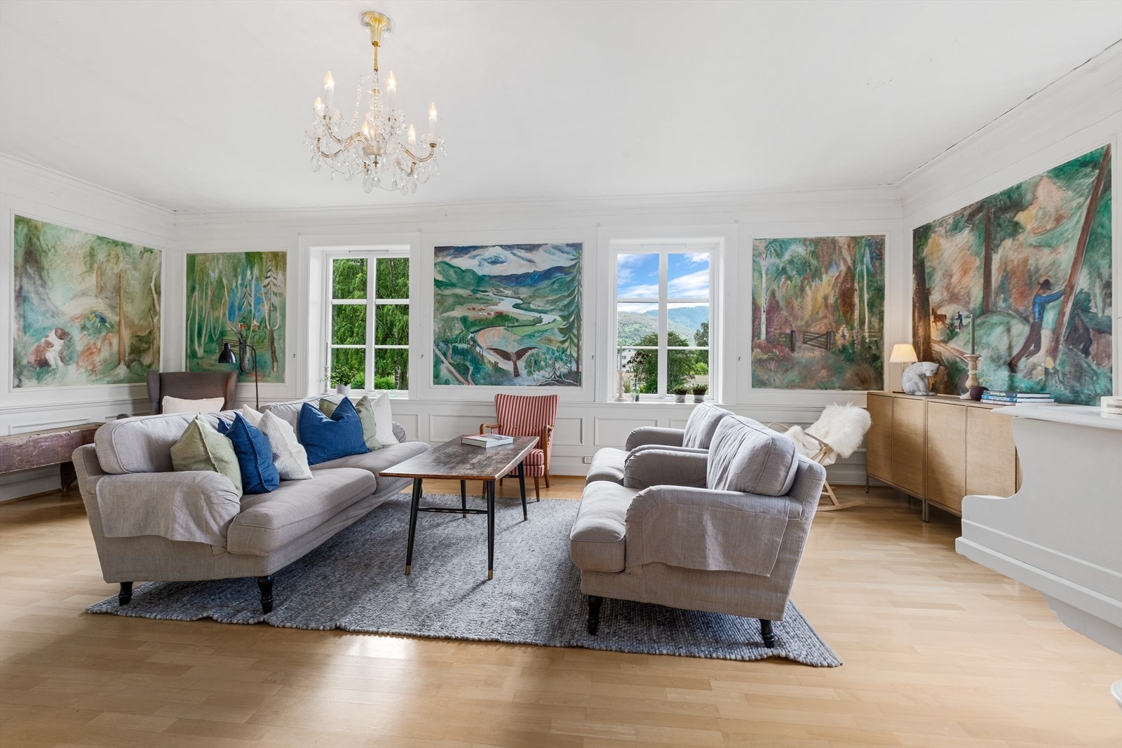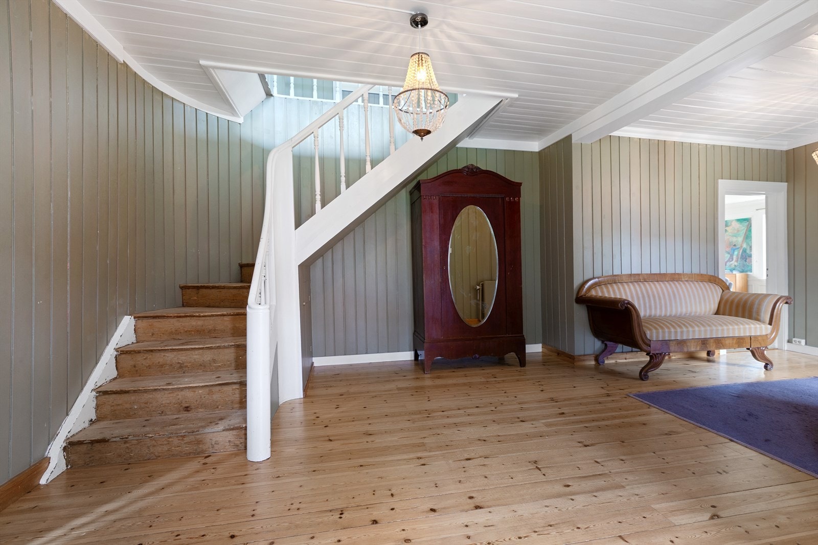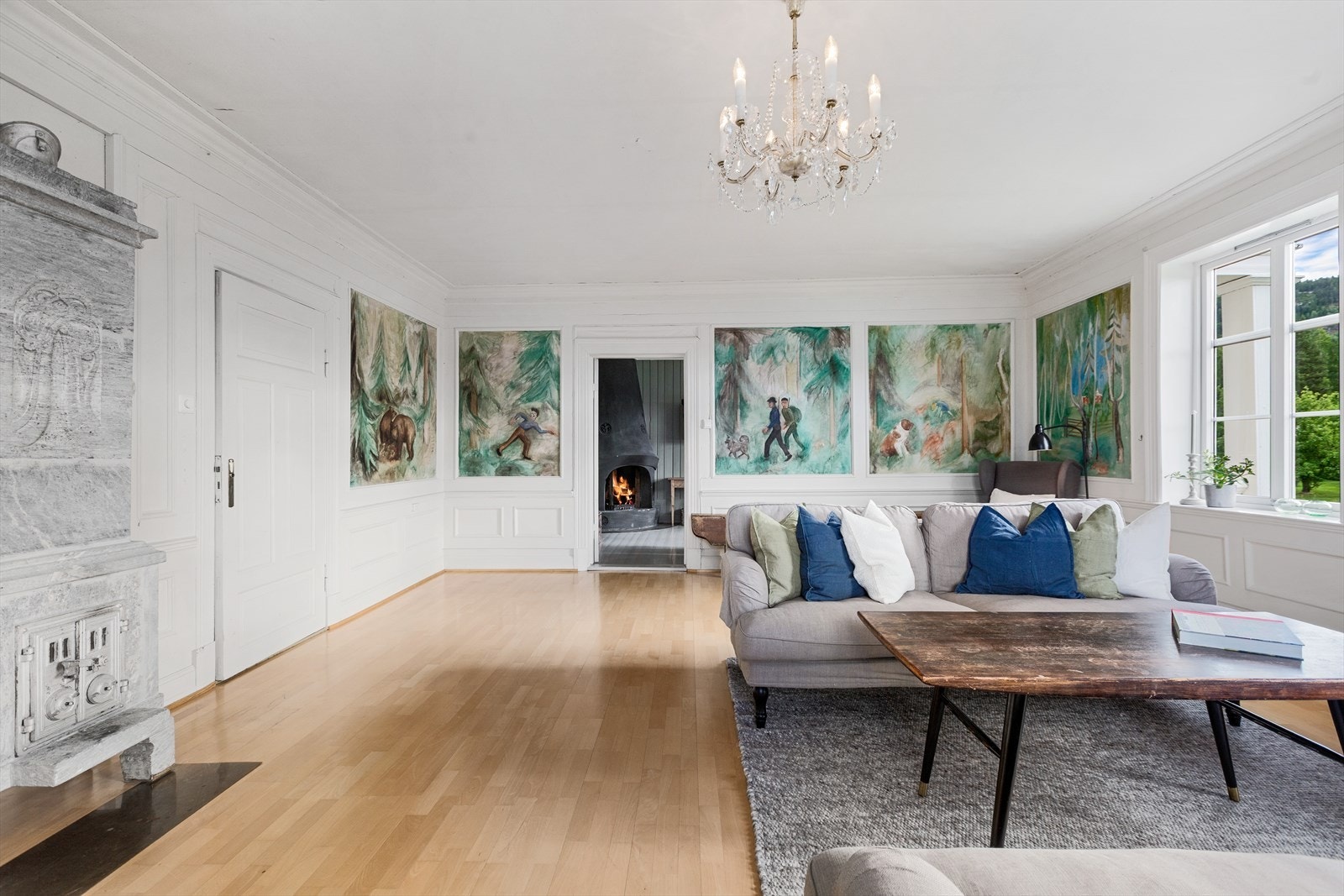 1. etasje (174 kvm.): Entré, kjøkken, spisestue, spiskammers, peisstue, storstue, tv-stue, trappehall, wc og hovedentré.