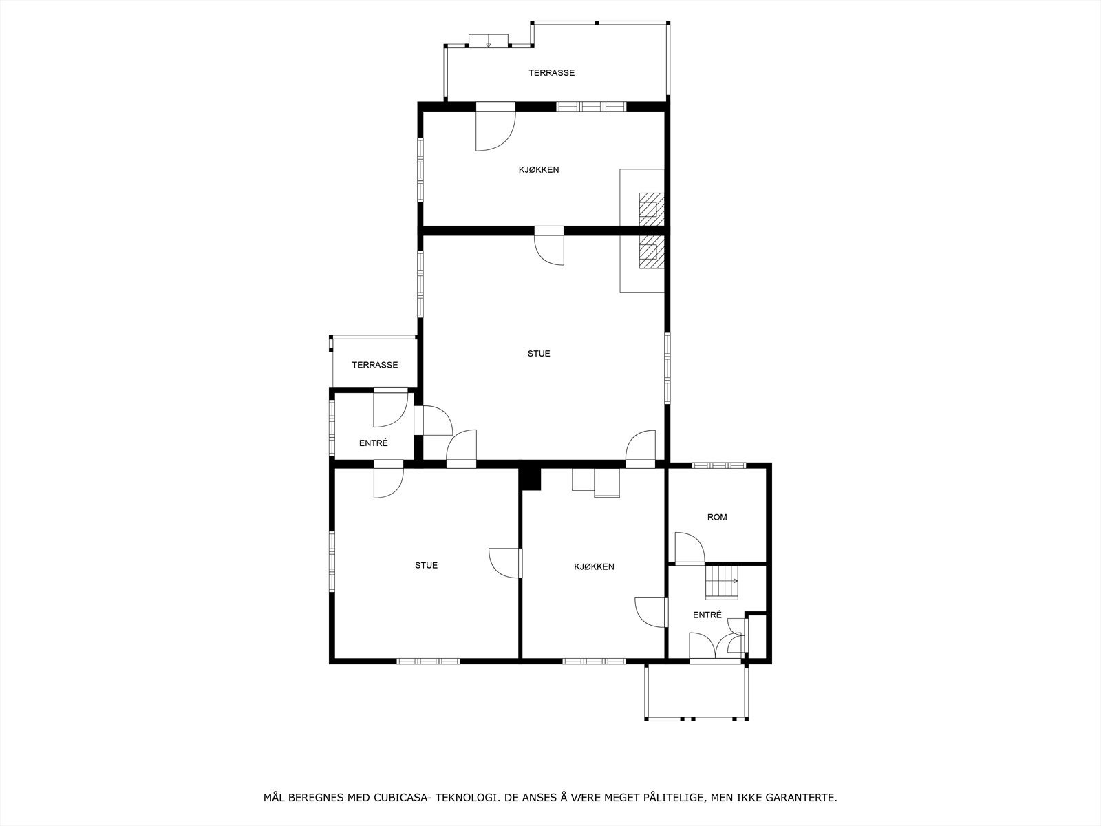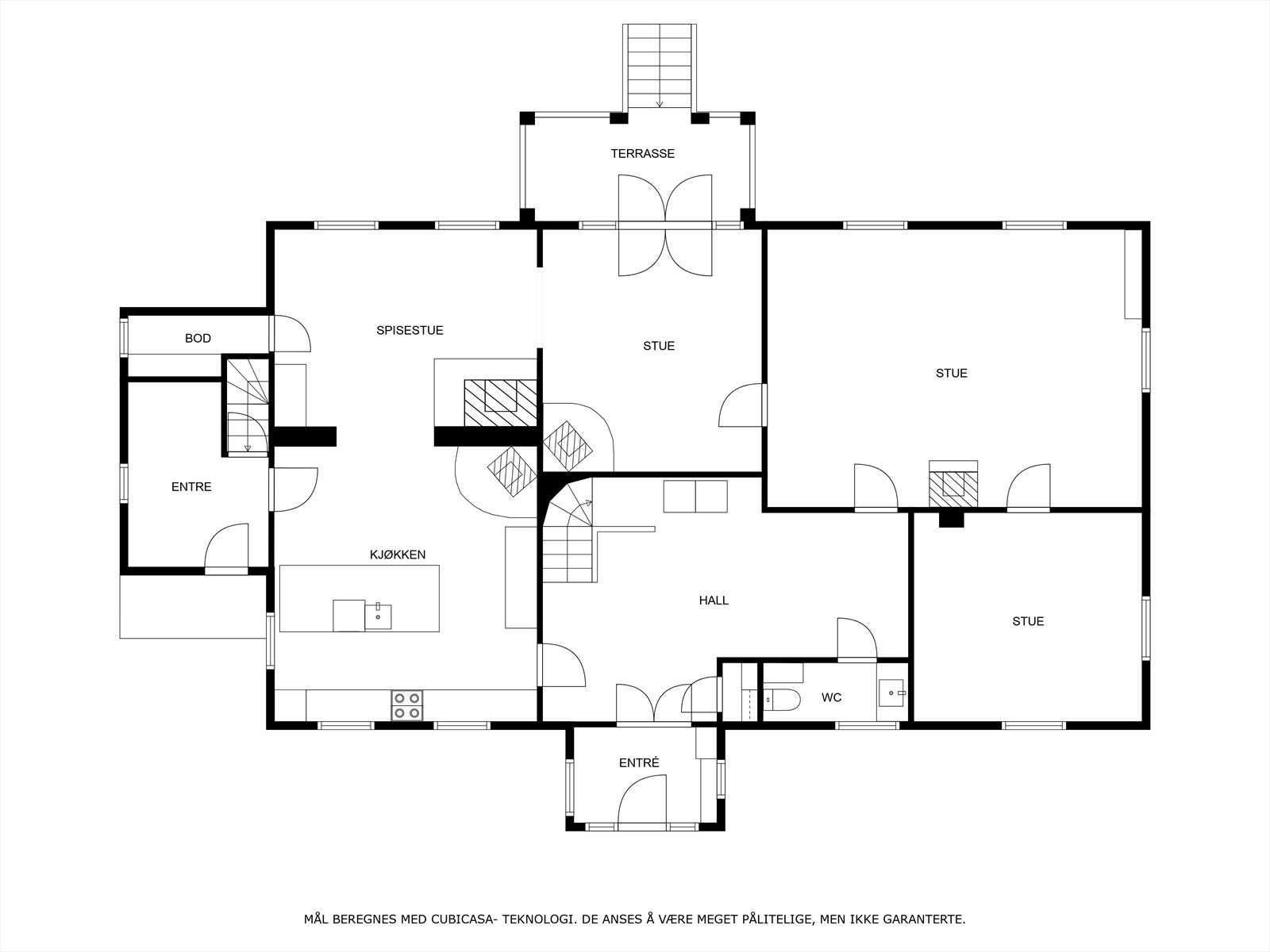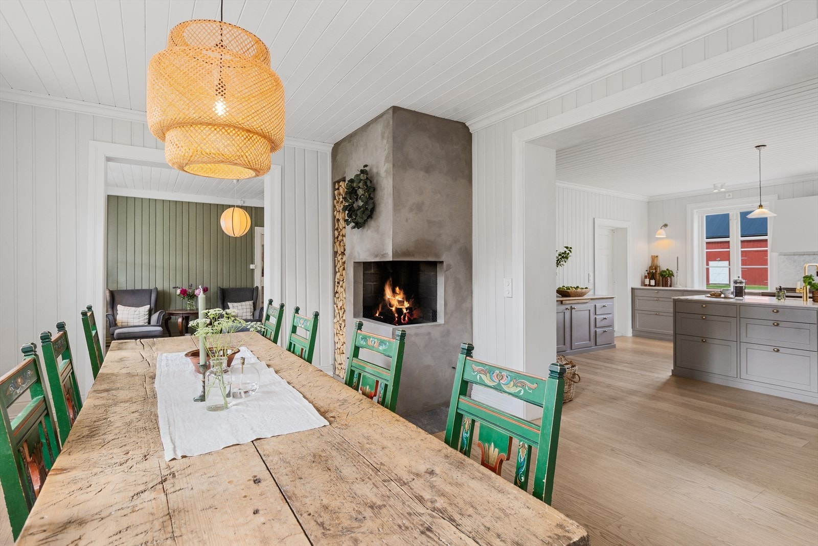 1. etasje (174 kvm.): Entré, kjøkken, spisestue, spiskammers, peisstue, storstue, tv-stue, trappehall, wc og hovedentré.