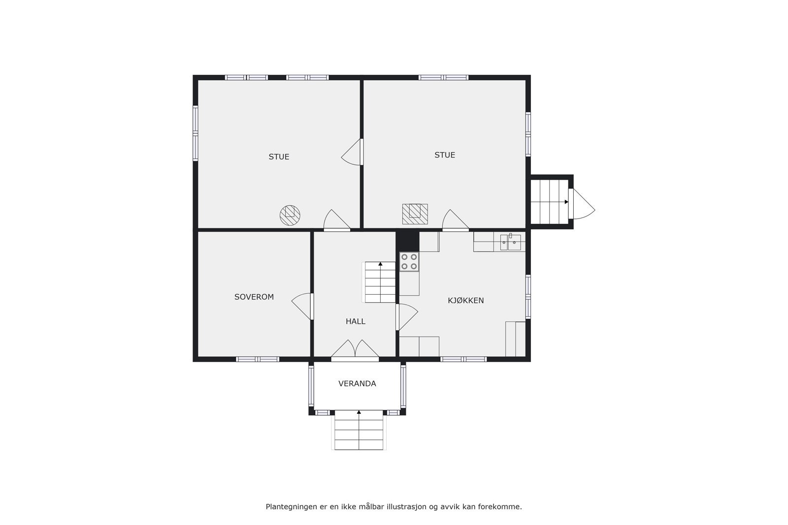 1.Etasje primærrom: Kjøkken, spisestue, stue, gang og soverom