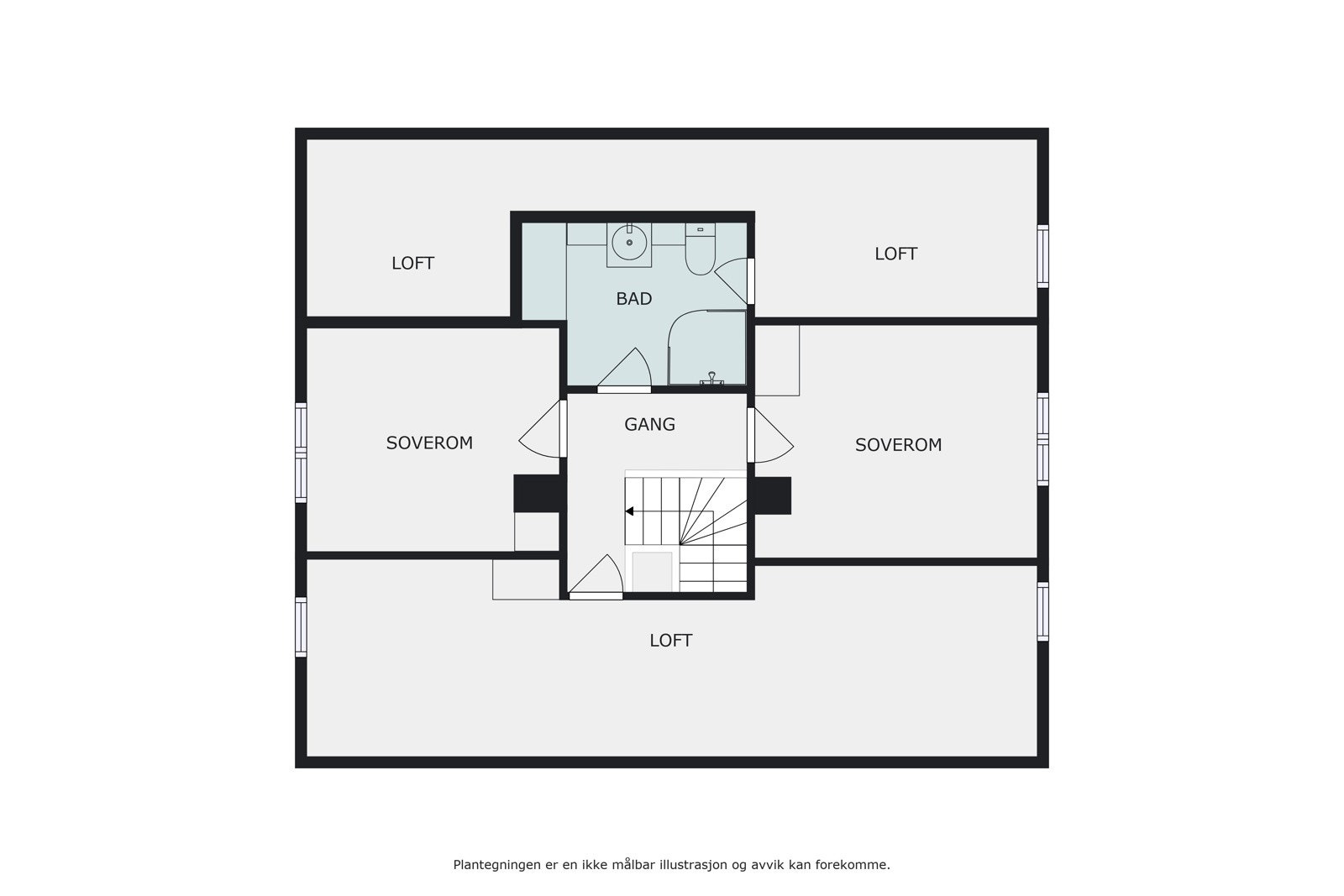 2.Etasje primærrom: Trappegang, to soverom og bad. Sekundærrom: To kott