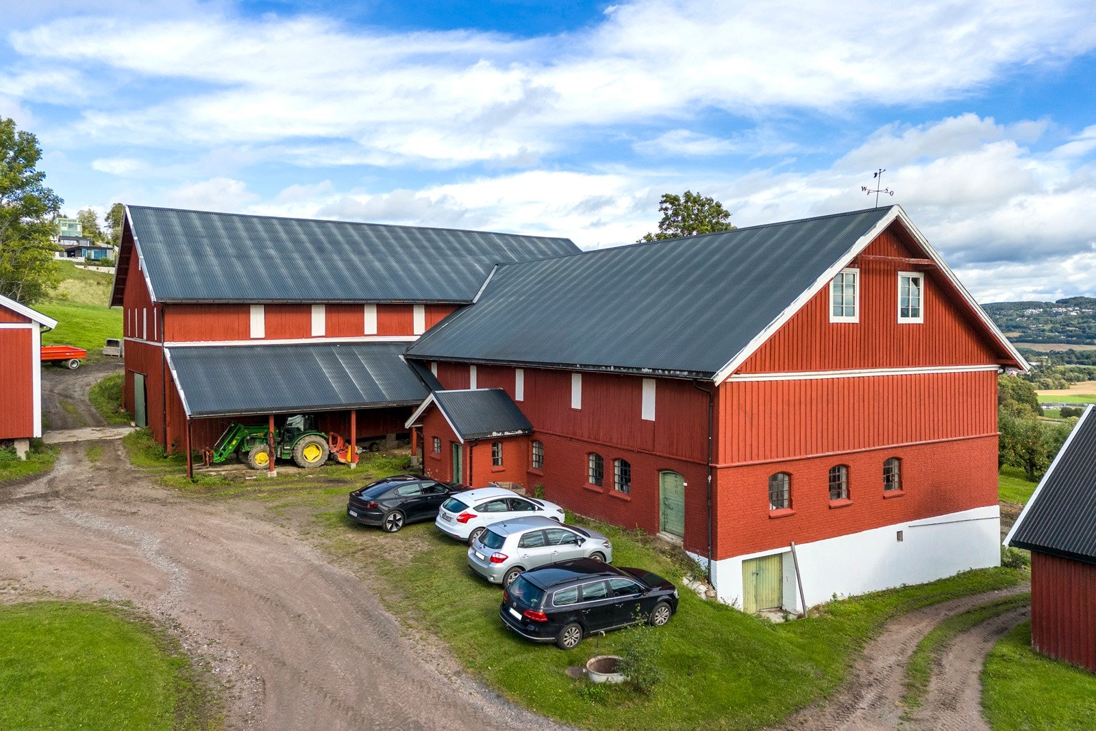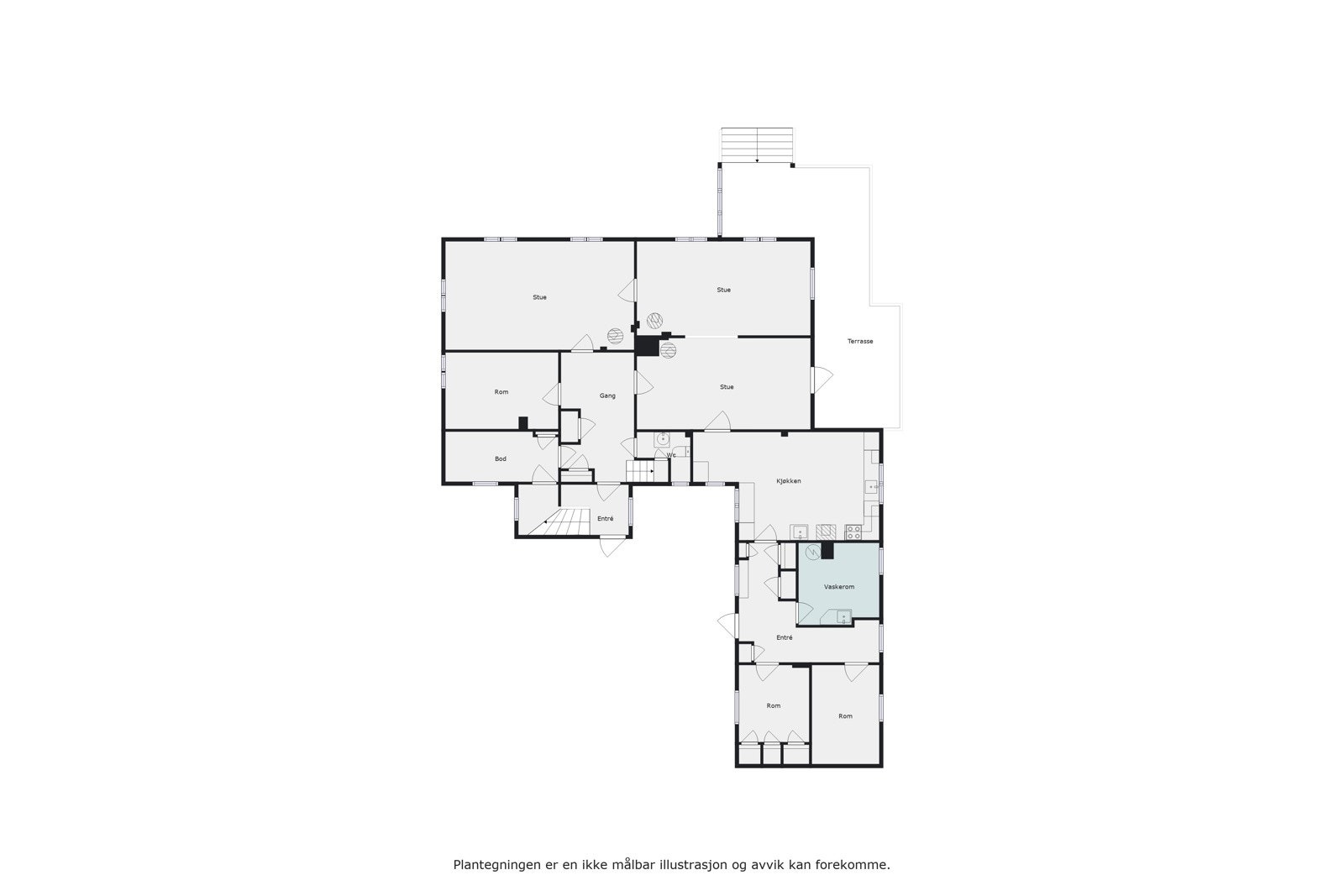1. etasje (BRA: 202 kvm): 3 stuer, kjøkken, kontor, vindfang, entré, toalettrom, vaskerom, to boder og to lagerrom.