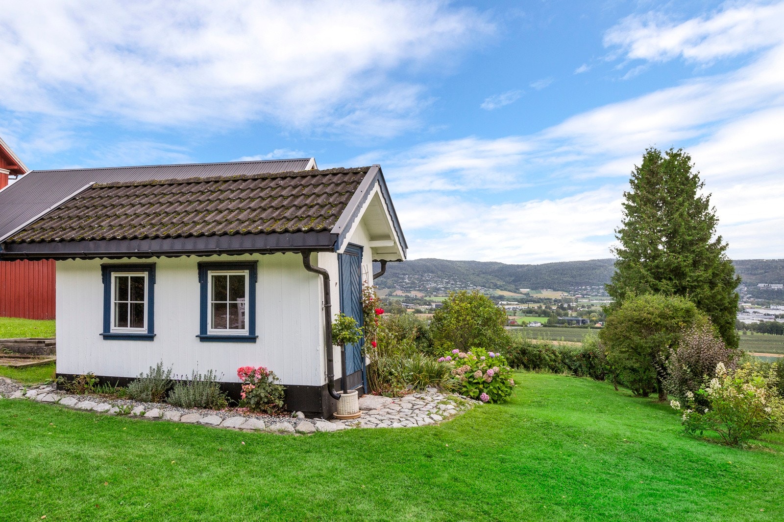 Bygning med boligdel og garasje/arbeidsrom og fruktlager.