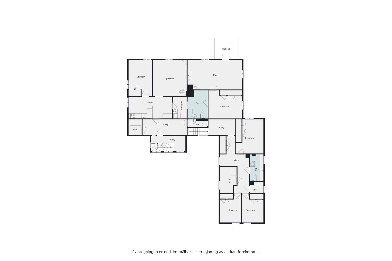 2. etasje (BRA: 188 kvm): kjøkken, spisestue, stue, 3 ganger, entré, toalettrom, vaskerom, 2 bad, 5 soverom og bod.