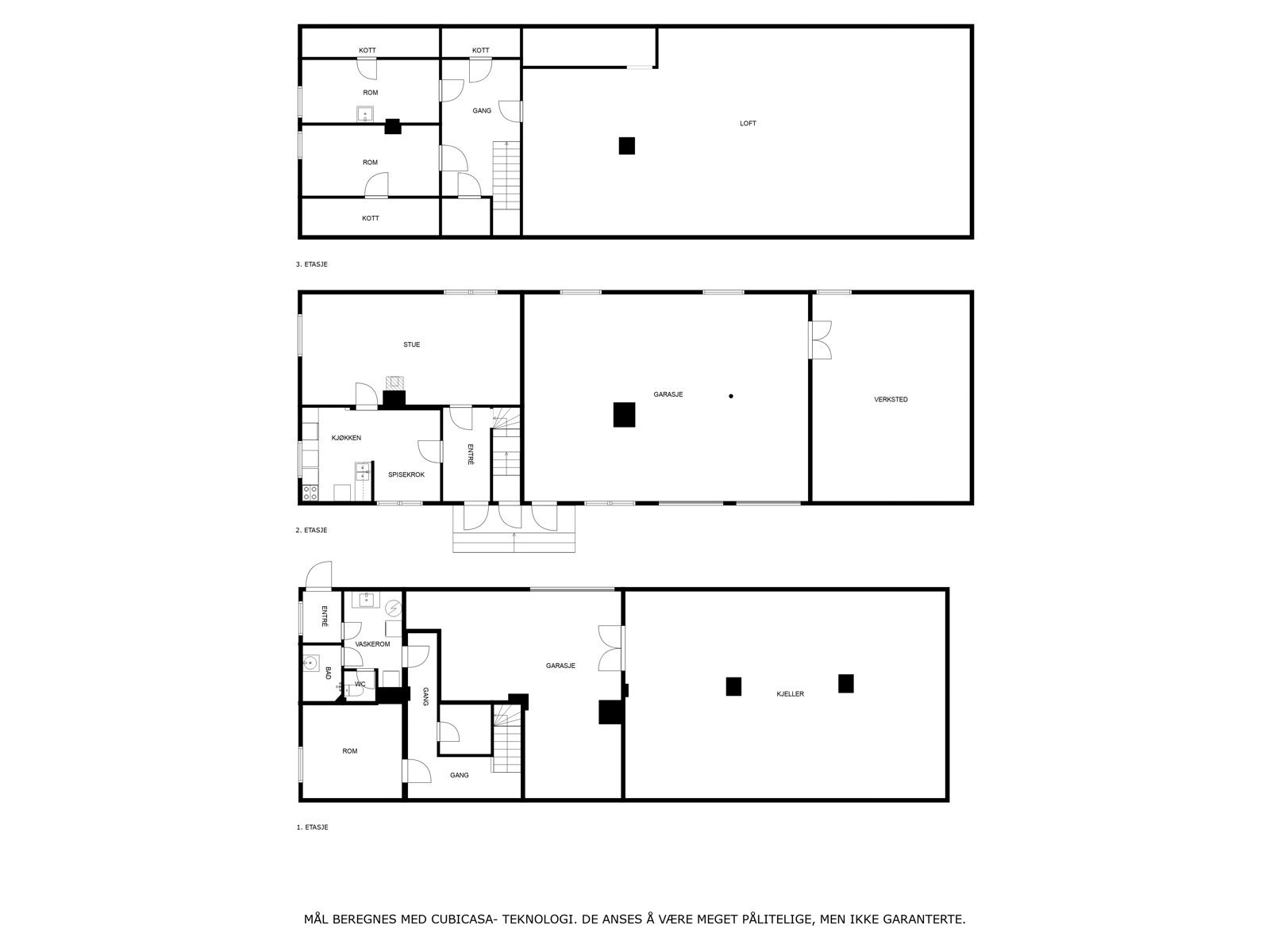 1. etasje: Gang/entre, kjøkken/spiseplass og stue (soverom). Garasje-Arbeidsrom/spiserom.