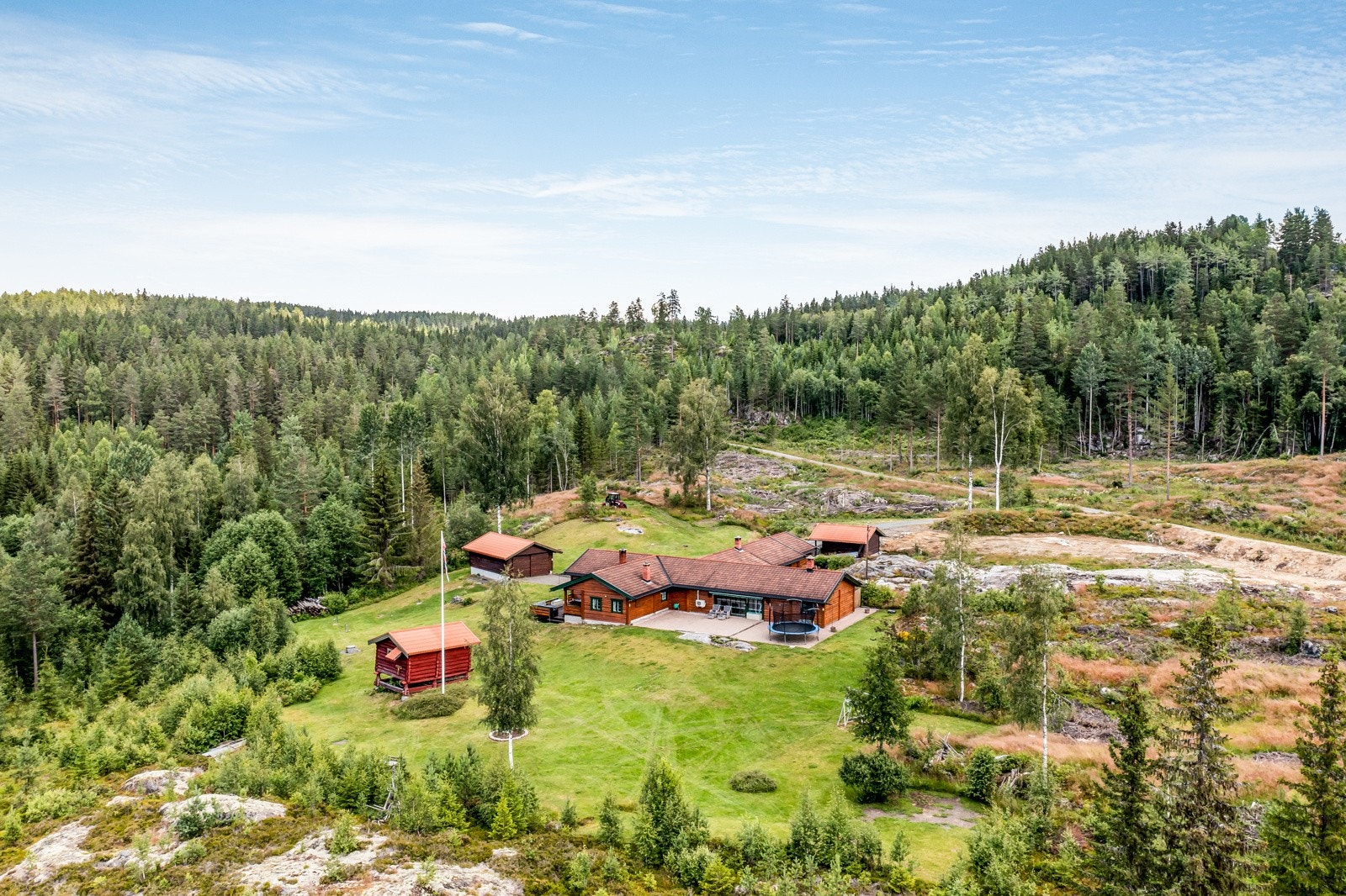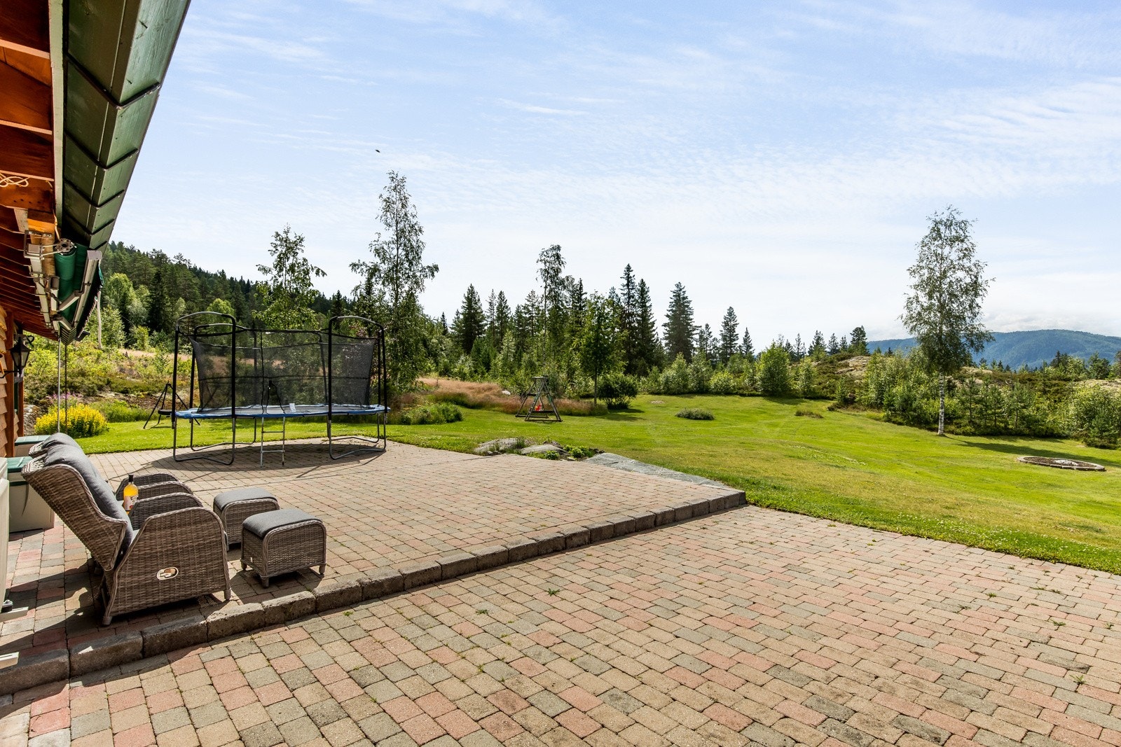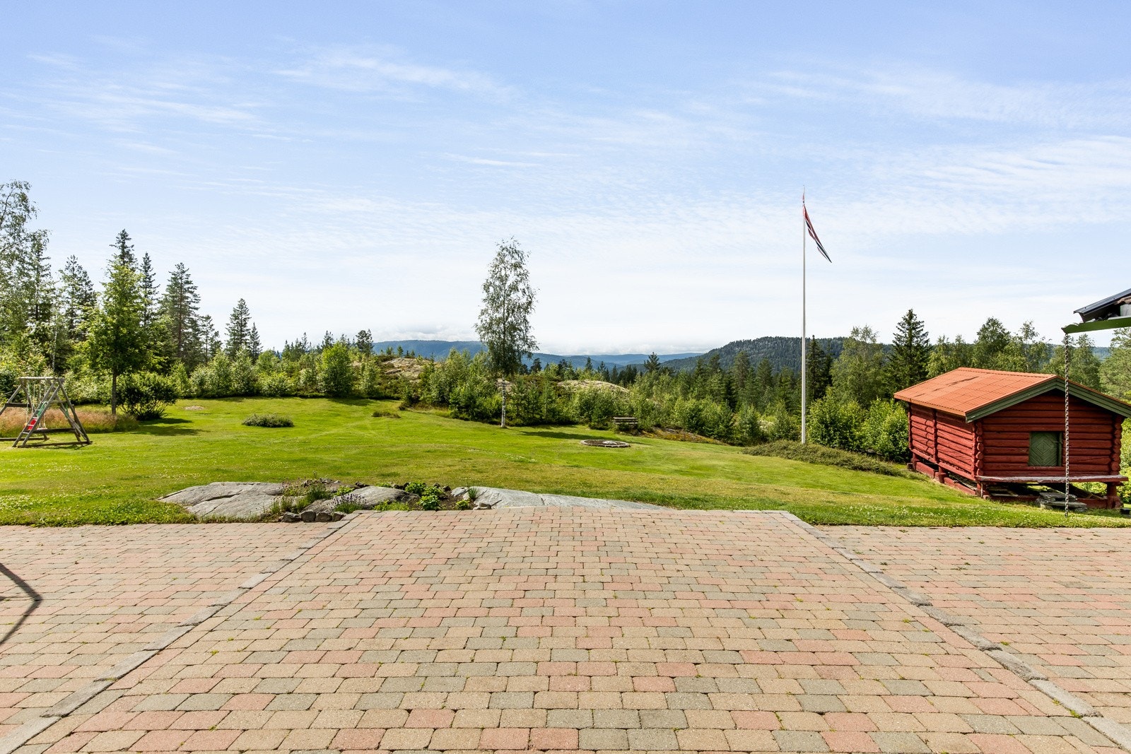 hellelagt gårdsplass og store plenarealer. Resten av tomten er naturtomt.