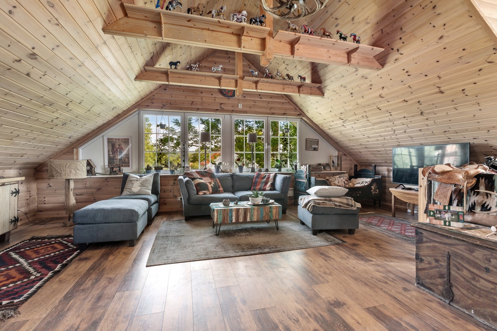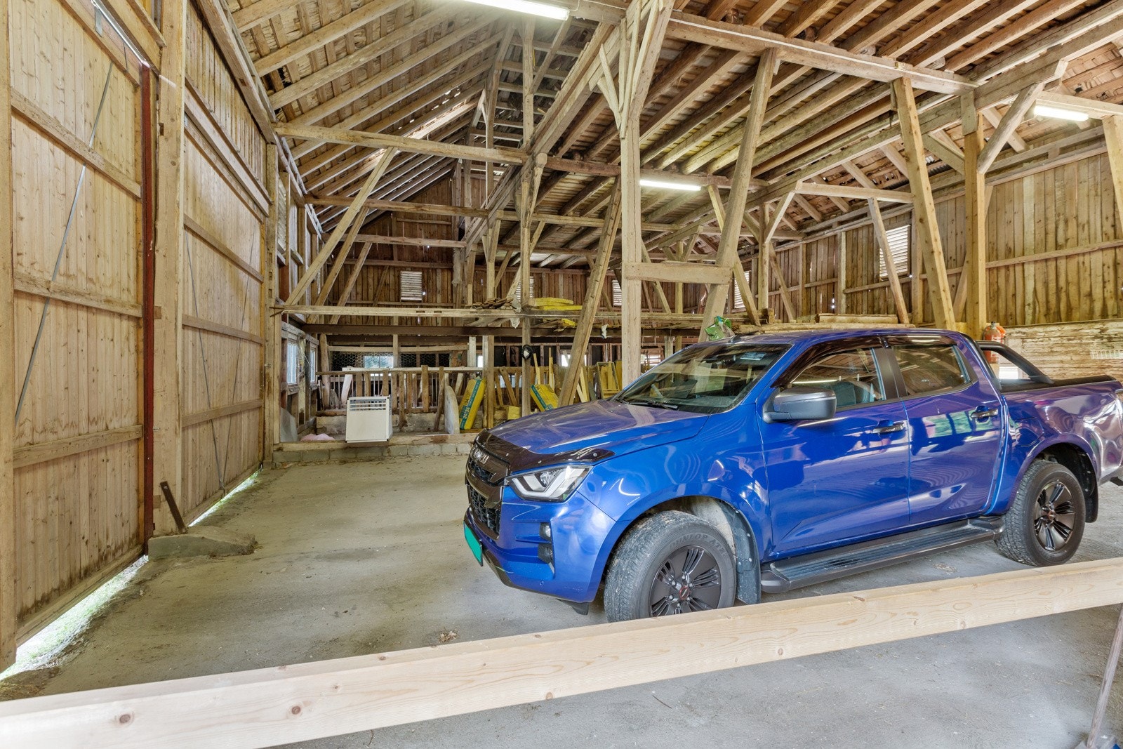 - Velholdt låve med tre nyere stallbokser og god plass for redskap og kjøretøy i 1. etg. samt 2. etg. med en