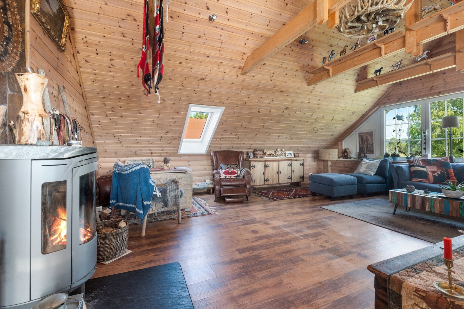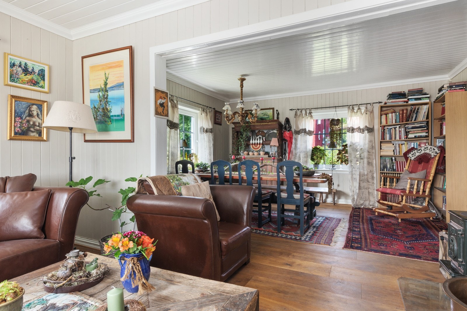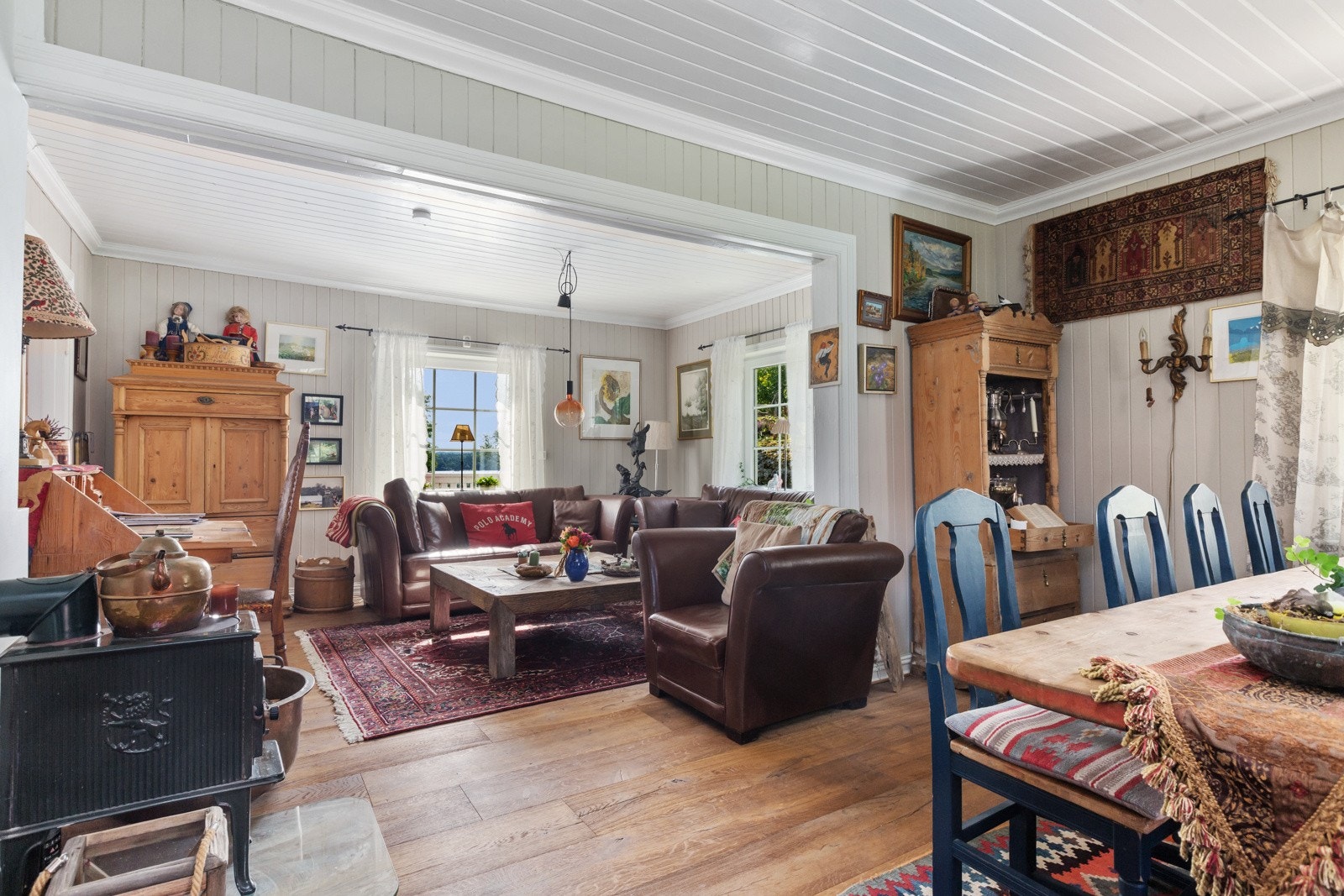 rentbrennende peisovn - matbod - fin spisestue - koselig salongstue - gang med trapper til kjeller og 2.
