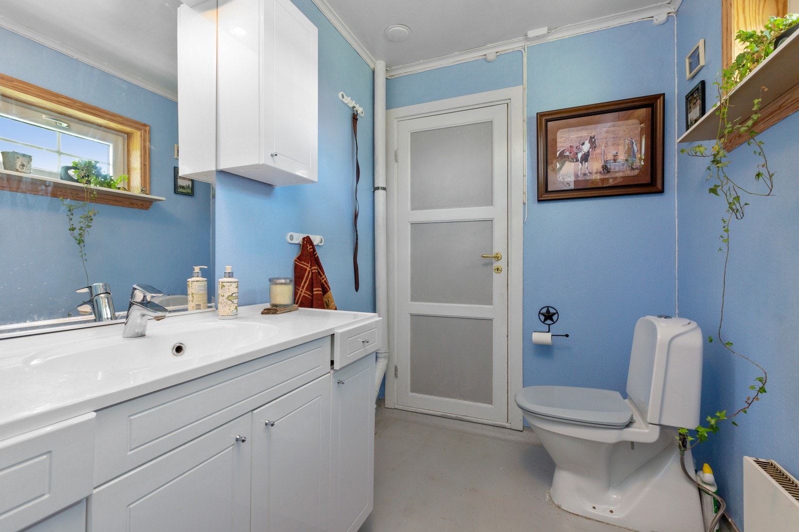 Eldre bad. Badet har vinylbelegg på gulver. Våtromstapet på vegger og malt himling. Rommet er innredet