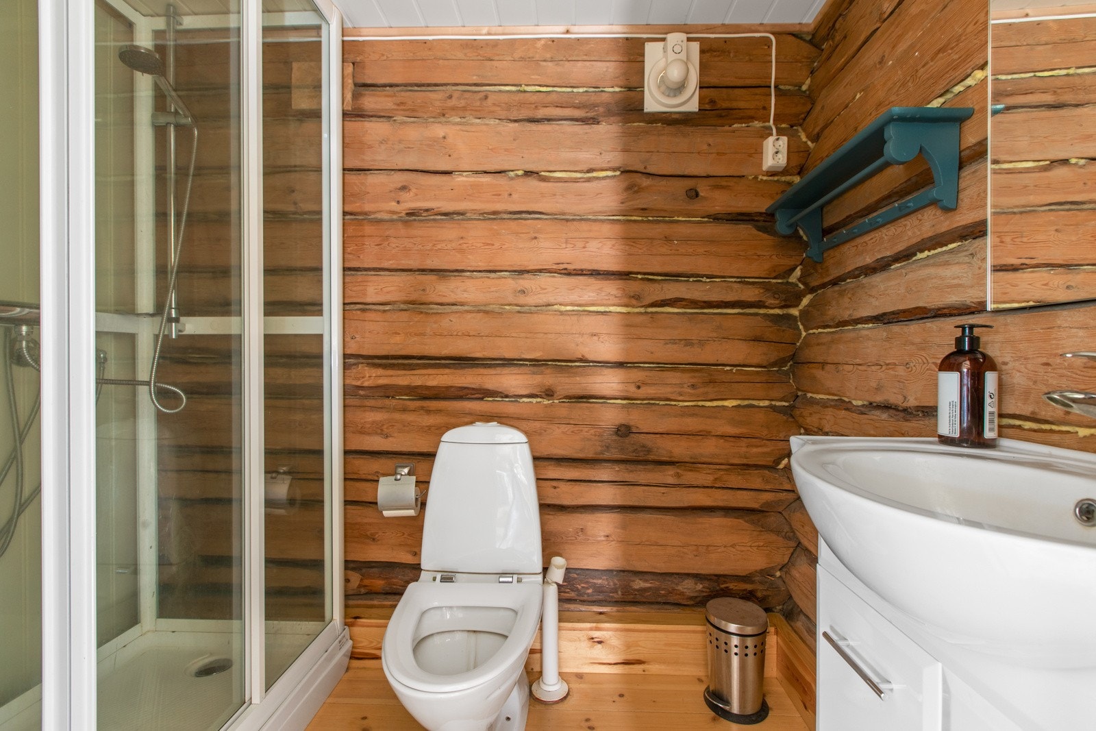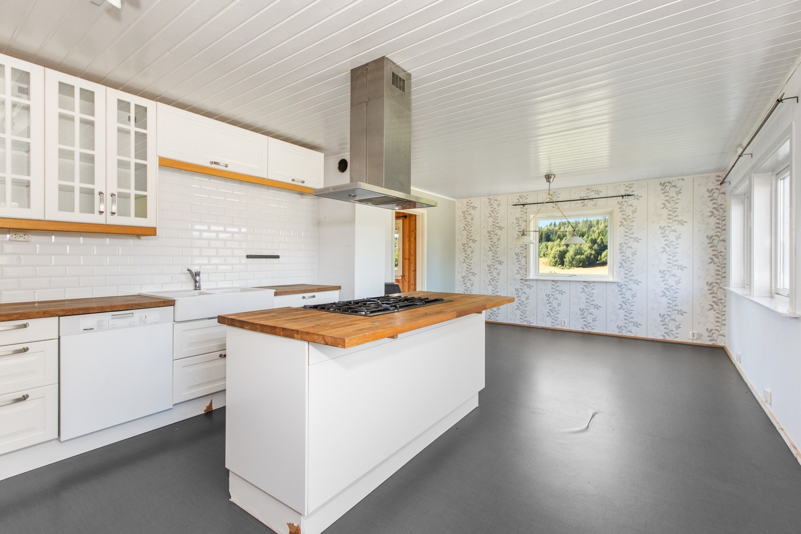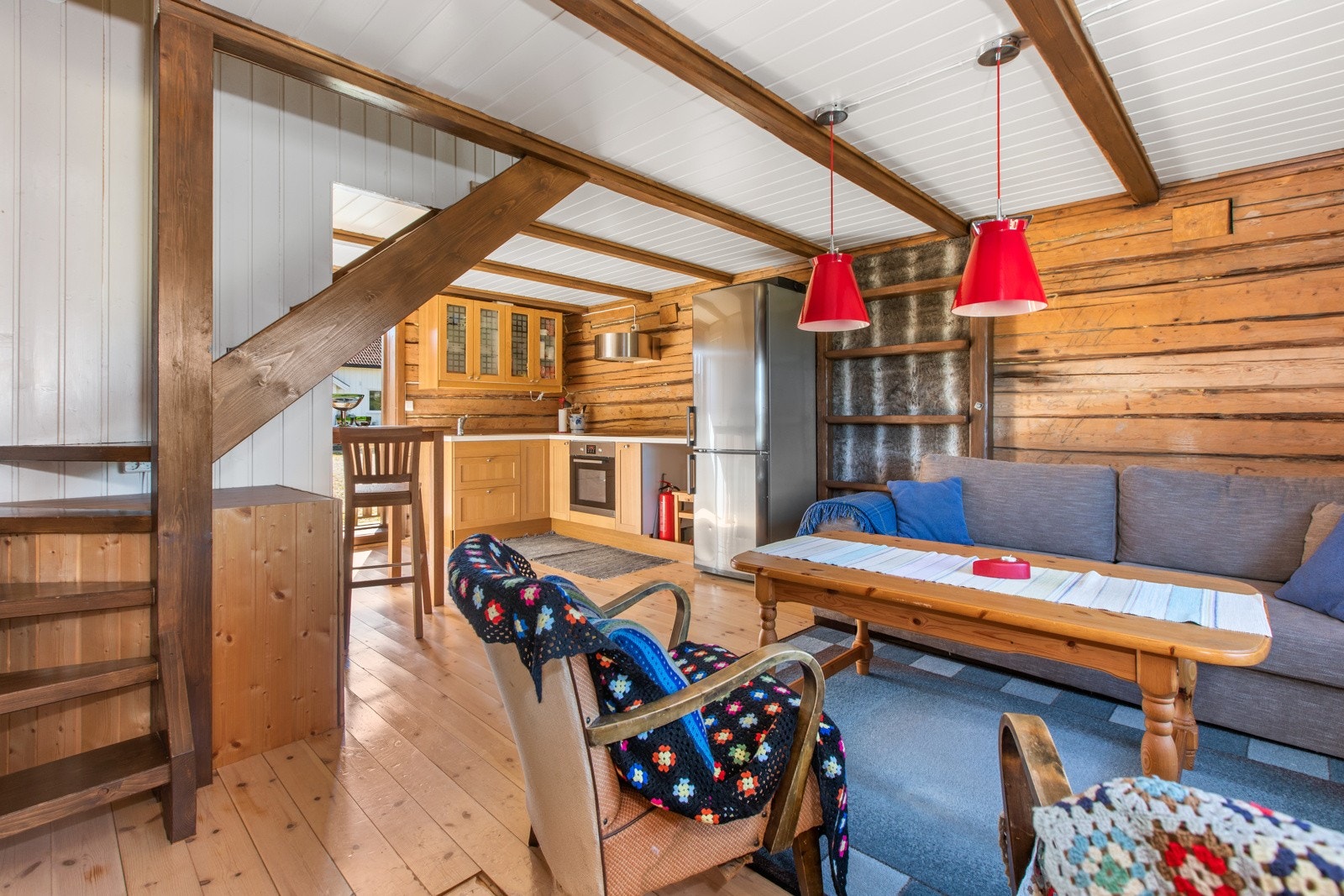 etasje et åpent rom med kjøkkeninnredning og sittegrupper. Det er også et separat sanitærrom i etasjen
