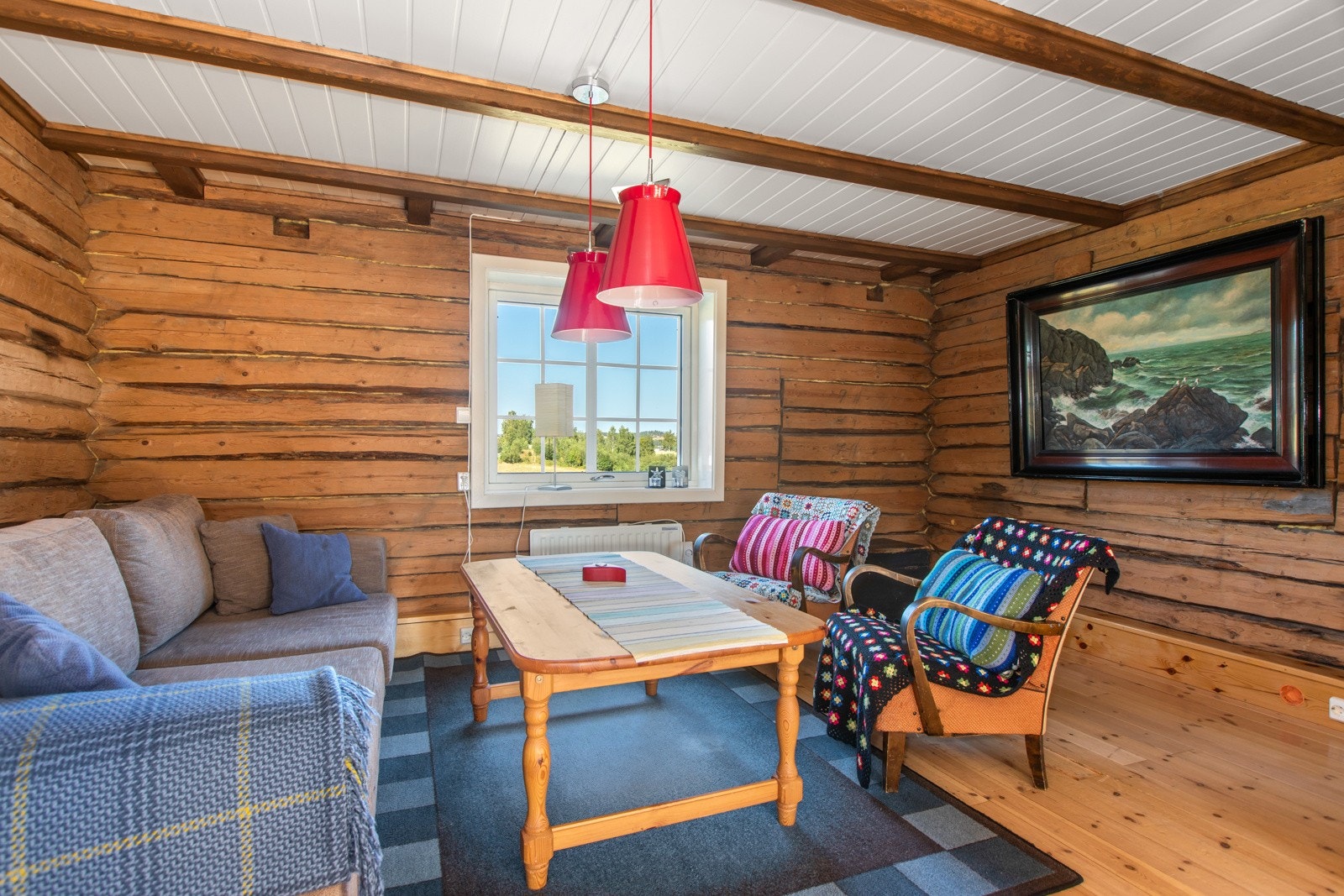 åpen tømmerlaft i veggene og synlige bærebjelker i himling. Grunnflaten er på ca. 32 kvm. og har i første