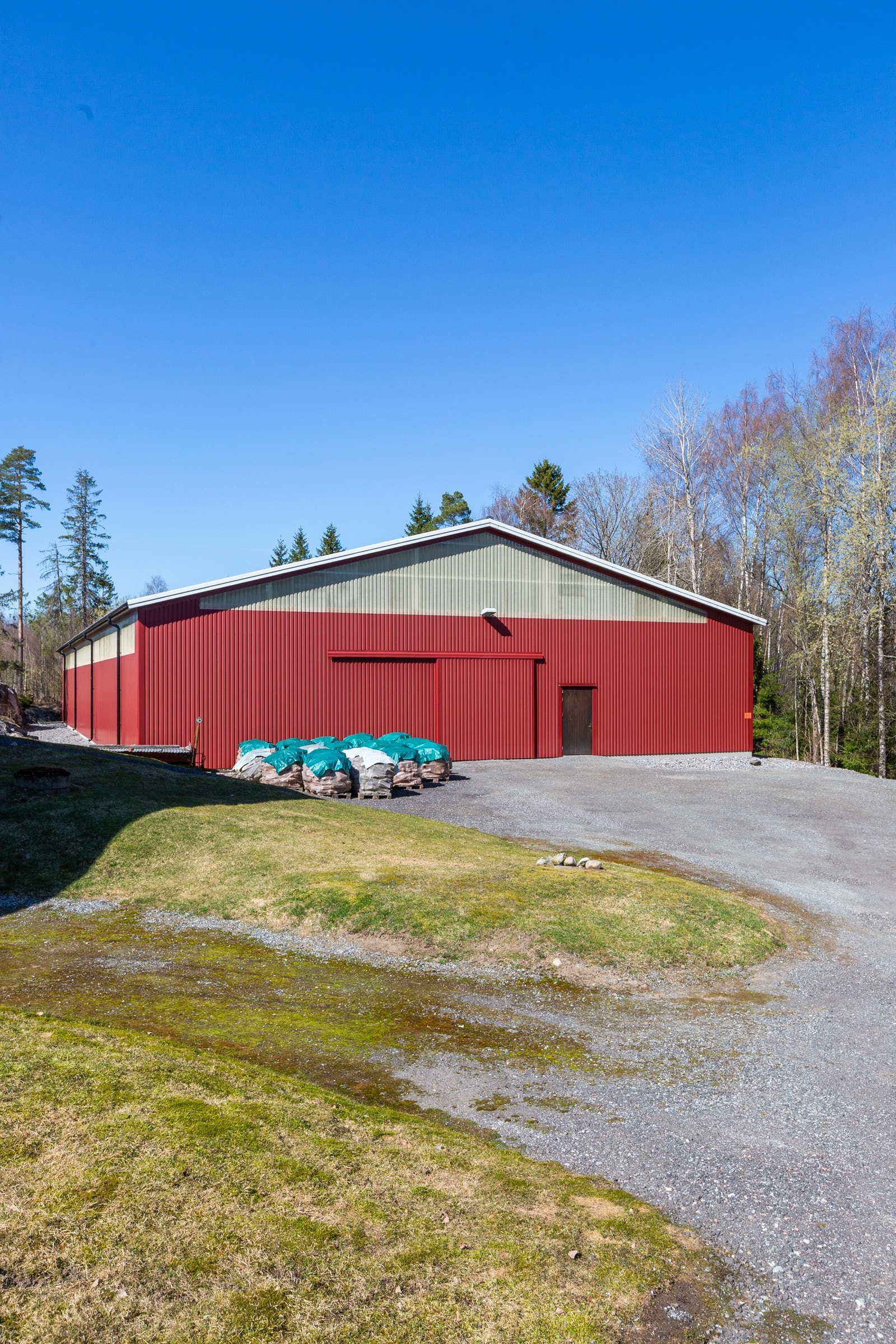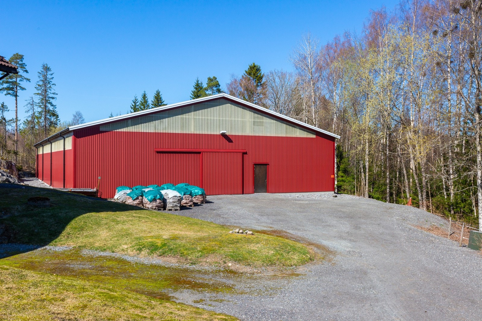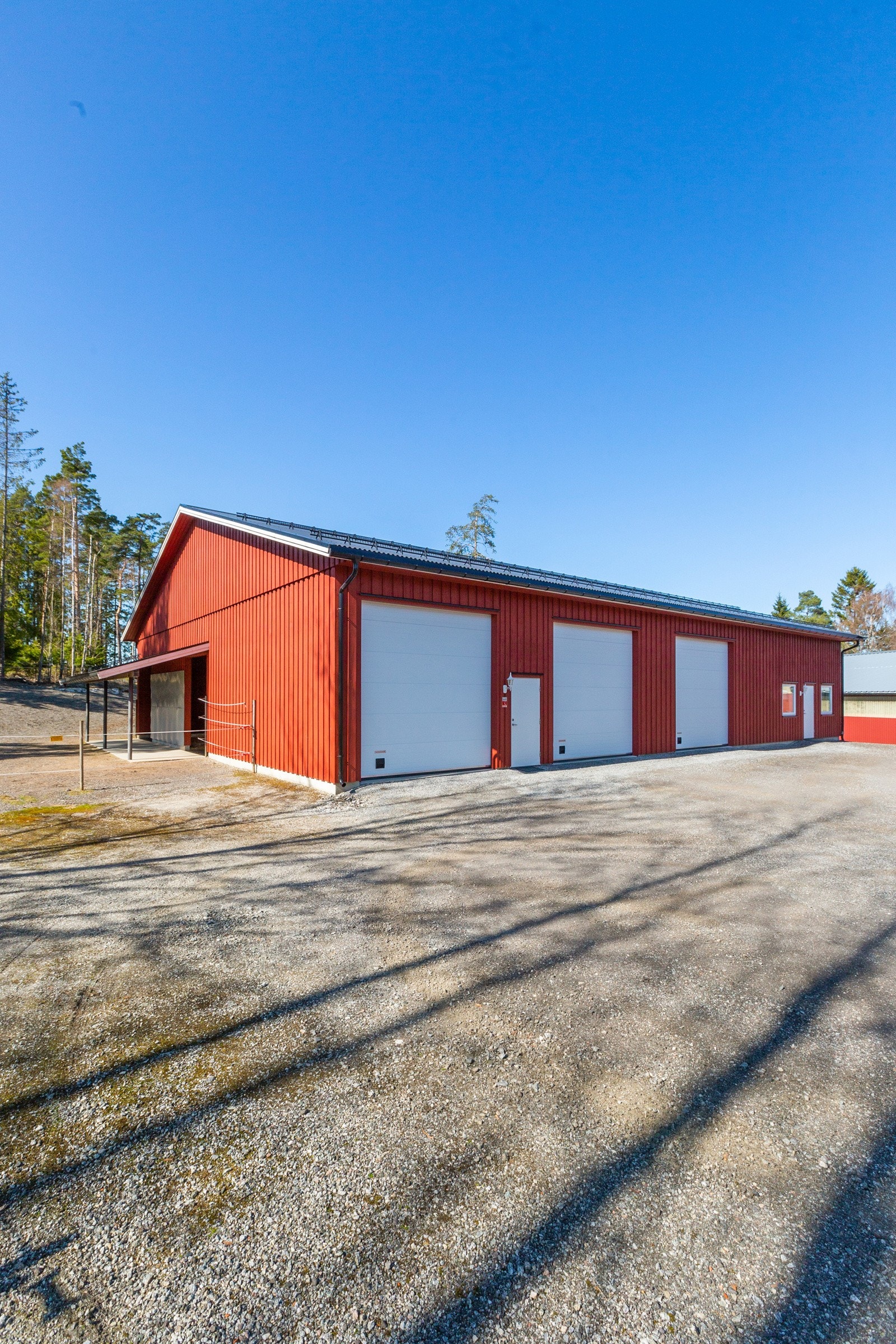 Oppført i 2012. Bygget har en total grunnflate 410 kvm, inkludert en takoverbygget utegang på 39 kvm. Oppført med støpt plate på mark. Yttervegger av bindingsverk, utvendig kledd med stående trekledning. Tak bygget som saltak, tekket med stålplater. Bygget inneholder et lokale på 65 kvm som benyttes til butikk, og lager. Rommet er isolert i vegger og tak. Vinylbelegg på gulv og vegger med malt trepanel. Malt gips i himling. Rommet har adkomst via gangdør fra utsiden samt gangdør inn til redskapsgarasjen. To åpningsvinduer og to fastkarmsvinduer. Redskapsgarasjen er på 198 kvm med tre isolerte leddheiseporter i stål med bredde 3,45 meter og høyde 3,48 meter. Egen gangdør mellom to av portene. Stallrommet er på 112 kvm. Vegger har malt trepanel og det er malte plater i himling. Stallen har 4 stk hestebokser (Cityboxen) disse har størrelse 3 x 3 meter. Det er møkkaluker i yttervegg i hver stallboks med enkel oppsamling for bortkjøring. Dette skjer på støpt dekke og gjør håndteringen enkel. Den romslige og fine hestedusjen har vannfaste plater på vegger og eget avtrekk i vegg. Fra stallen er det dør direkte til leskur, noe som gjør foring under tak veldig enkel. Fra stallgangen er det adkomst til isolert og oppvarmet utstyrsrom med gulv som er overflatebehandlet med Epoxy. Malte OSB plater på vegger og malt gips i himling. Det er også tilgang til isolert tørkerom og hunderom. Hunderommet har luke i vegg til takoverbygget hundegård. Bygget har godt med lys og strøm. I de isolerte rommene er det varmeovner plassert i himlinger. Alle stallbokser, gang, tak, dører og leskur er i henhold til Mattilsynets krav eller bedre. Bygget er i svært god stand og gir et solid og tiltalende helhetsinntrykk.