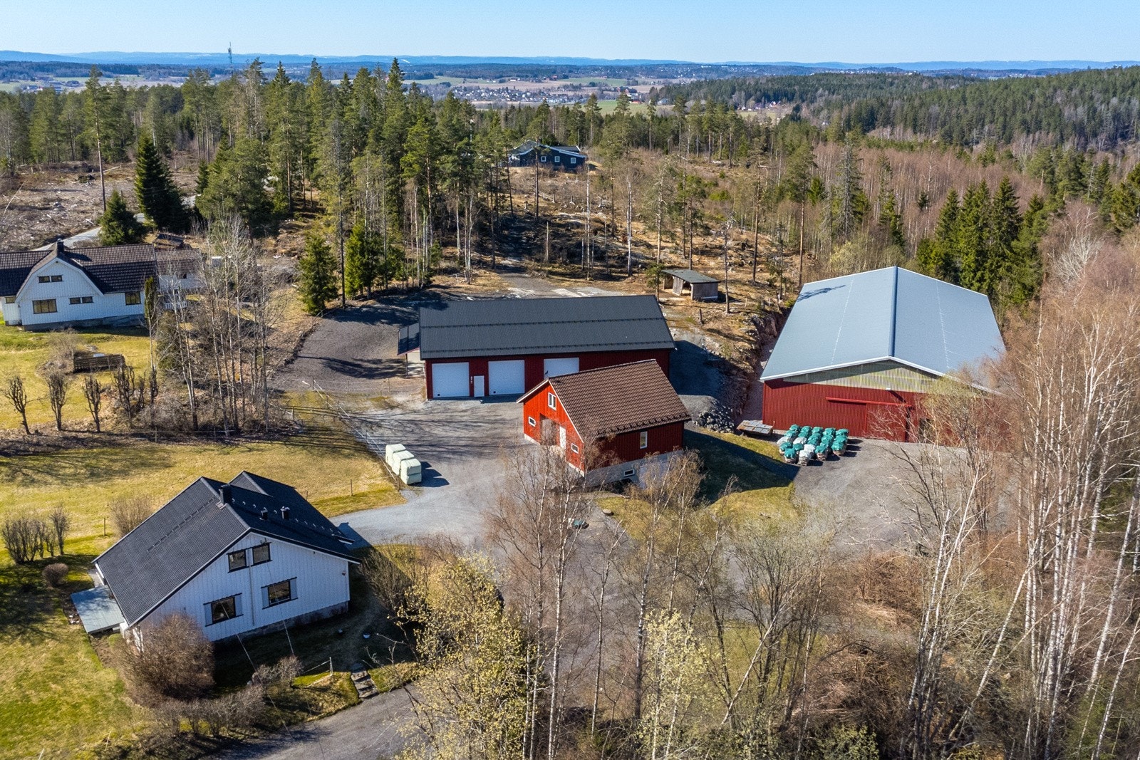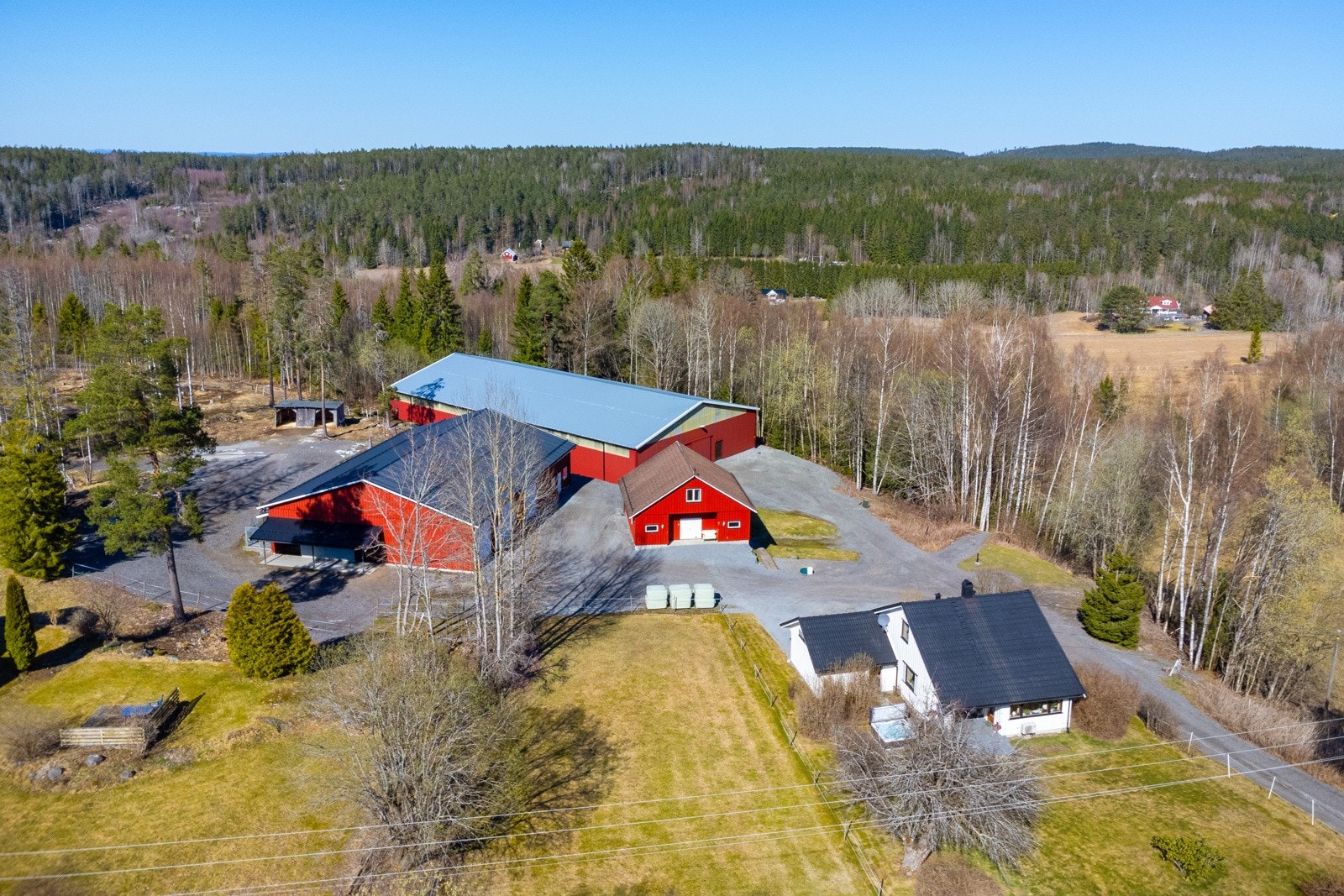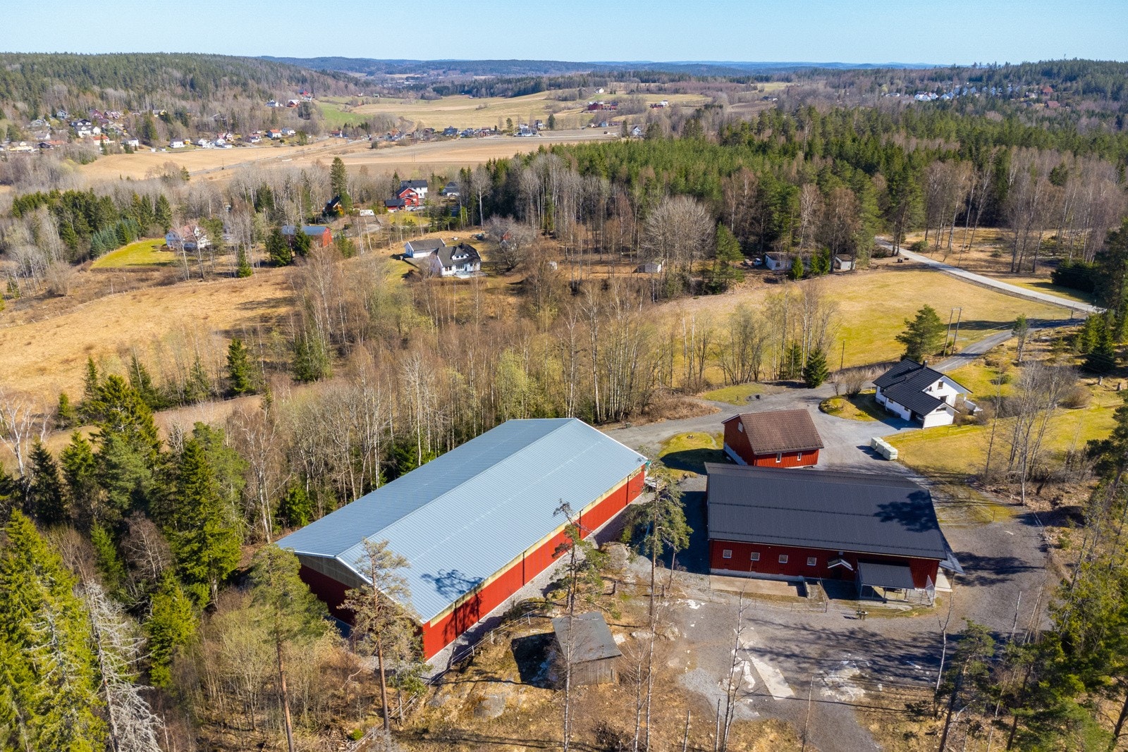 Oppført i 2012. Bygget har en total grunnflate 410 kvm, inkludert en takoverbygget utegang på 39 kvm. Oppført med støpt plate på mark. Yttervegger av bindingsverk, utvendig kledd med stående trekledning. Tak bygget som saltak, tekket med stålplater. Bygget inneholder et lokale på 65 kvm som benyttes til butikk, og lager. Rommet er isolert i vegger og tak. Vinylbelegg på gulv og vegger med malt trepanel. Malt gips i himling. Rommet har adkomst via gangdør fra utsiden samt gangdør inn til redskapsgarasjen. To åpningsvinduer og to fastkarmsvinduer. Redskapsgarasjen er på 198 kvm med tre isolerte leddheiseporter i stål med bredde 3,45 meter og høyde 3,48 meter. Egen gangdør mellom to av portene. Stallrommet er på 112 kvm. Vegger har malt trepanel og det er malte plater i himling. Stallen har 4 stk hestebokser (Cityboxen) disse har størrelse 3 x 3 meter. Det er møkkaluker i yttervegg i hver stallboks med enkel oppsamling for bortkjøring. Dette skjer på støpt dekke og gjør håndteringen enkel. Den romslige og fine hestedusjen har vannfaste plater på vegger og eget avtrekk i vegg. Fra stallen er det dør direkte til leskur, noe som gjør foring under tak veldig enkel. Fra stallgangen er det adkomst til isolert og oppvarmet utstyrsrom med gulv som er overflatebehandlet med Epoxy. Malte OSB plater på vegger og malt gips i himling. Det er også tilgang til isolert tørkerom og hunderom. Hunderommet har luke i vegg til takoverbygget hundegård. Bygget har godt med lys og strøm. I de isolerte rommene er det varmeovner plassert i himlinger. Alle stallbokser, gang, tak, dører og leskur er i henhold til Mattilsynets krav eller bedre. Bygget er i svært god stand og gir et solid og tiltalende helhetsinntrykk.