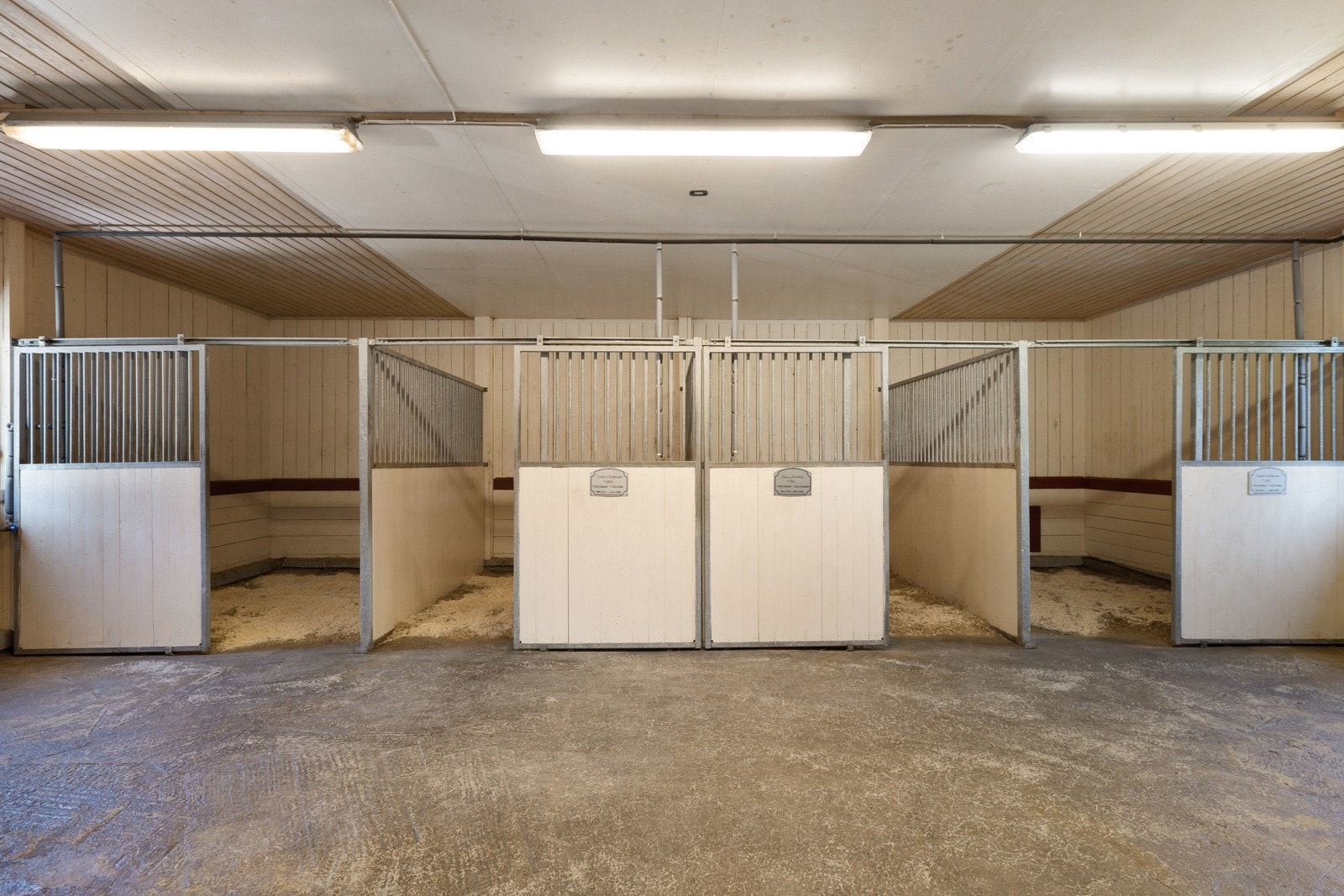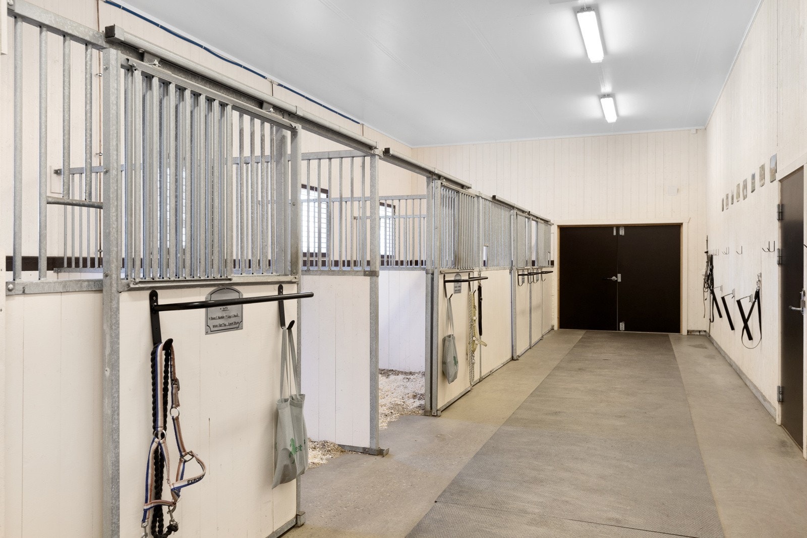 Stalldelen har adkomst via tofløyet dør med bredde/høyde på 1,8 x 1,95 meter. Her finner man 4 stallbokser samt et stort rom for stell av hest og et utstyrsrom.